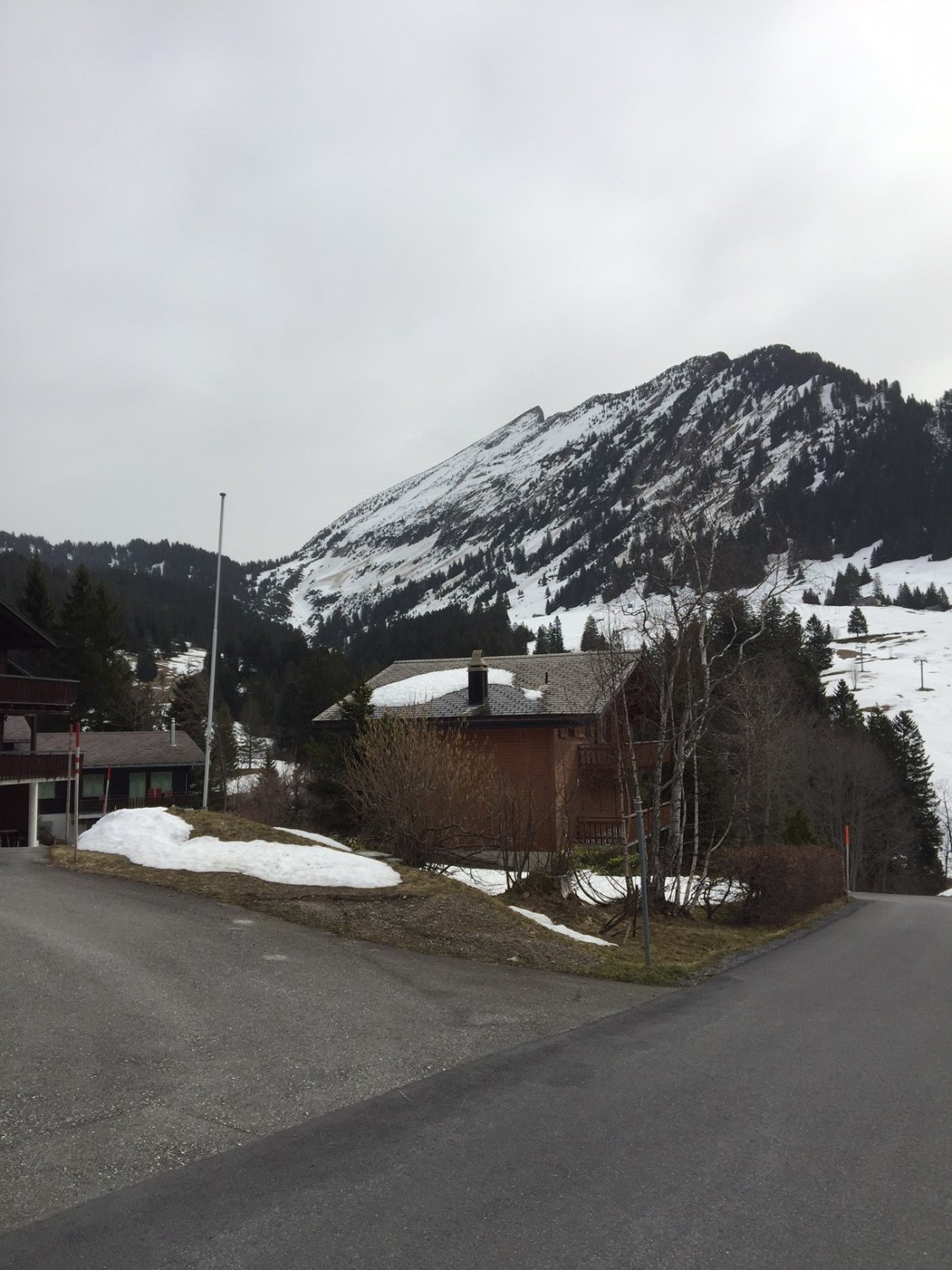 Auch wenn es vom Parkplatz nicht so aussieht, durchgehende Schneedecke bis auf den Gipfel.