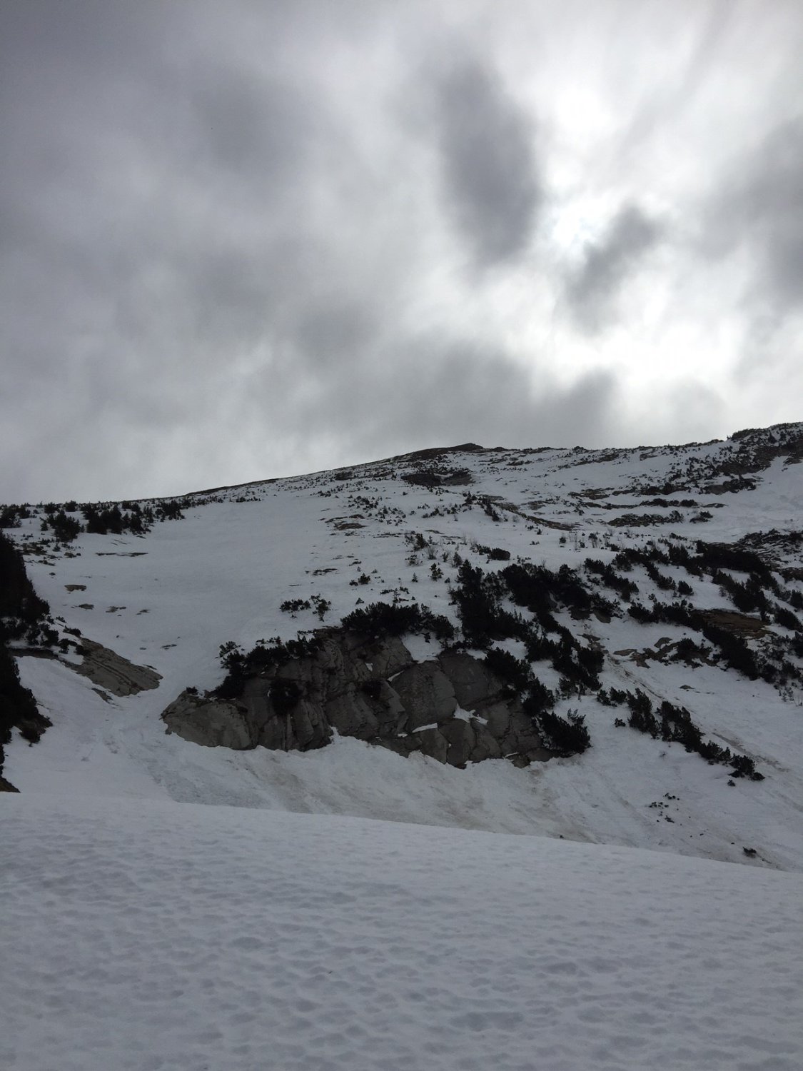 Wegen der bedeckten Nacht vermochte die Schneedecke nicht ganz durchzufrieren und mein später Aufbruch um 11 Uhr machte die Schneequalität nicht besser. Allerdings war die Schneedecke auch nicht ganz durchfeuchtet. Bei umsichtiger Routenwahl trotzdem lawinensicher im Aufstieg.