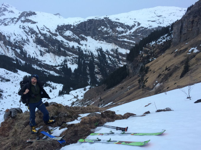 Abfahrt erstaunlich gut auf dem Bächifirn. Das Vordere Couloir weisst schön fahrbaren schweren Pulverschnee auf. Bis zur Hütte recht genussvolle und zügige Abfahrt, obwohl zum Schluss der Schnee schon recht nass und stumpf war. Ab der Hütte oft fluchend und zäh die Lawinenkegel runter. Dann wieder die Zustiegsschuhe angezogen und die Ski auf den Rucksack montiert. Zu Fuss problemlos zurück ins Klöntal.