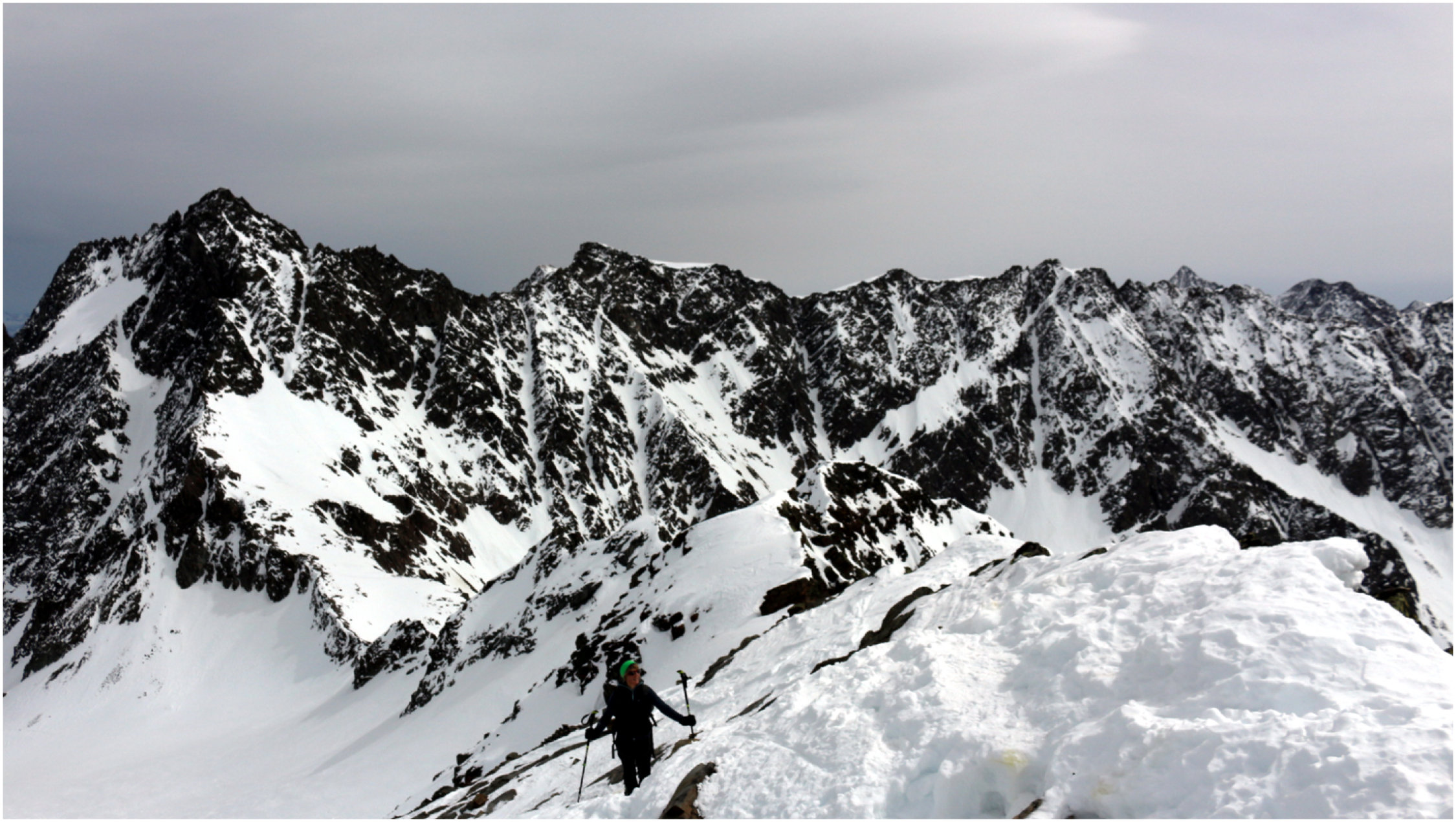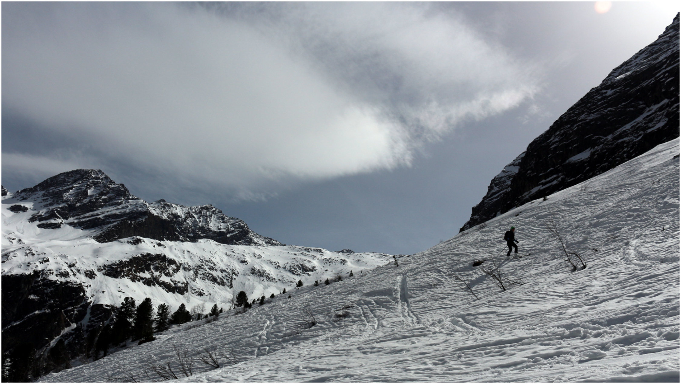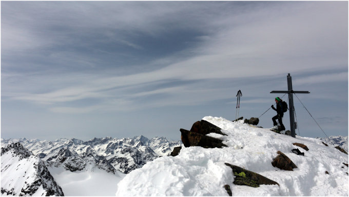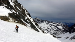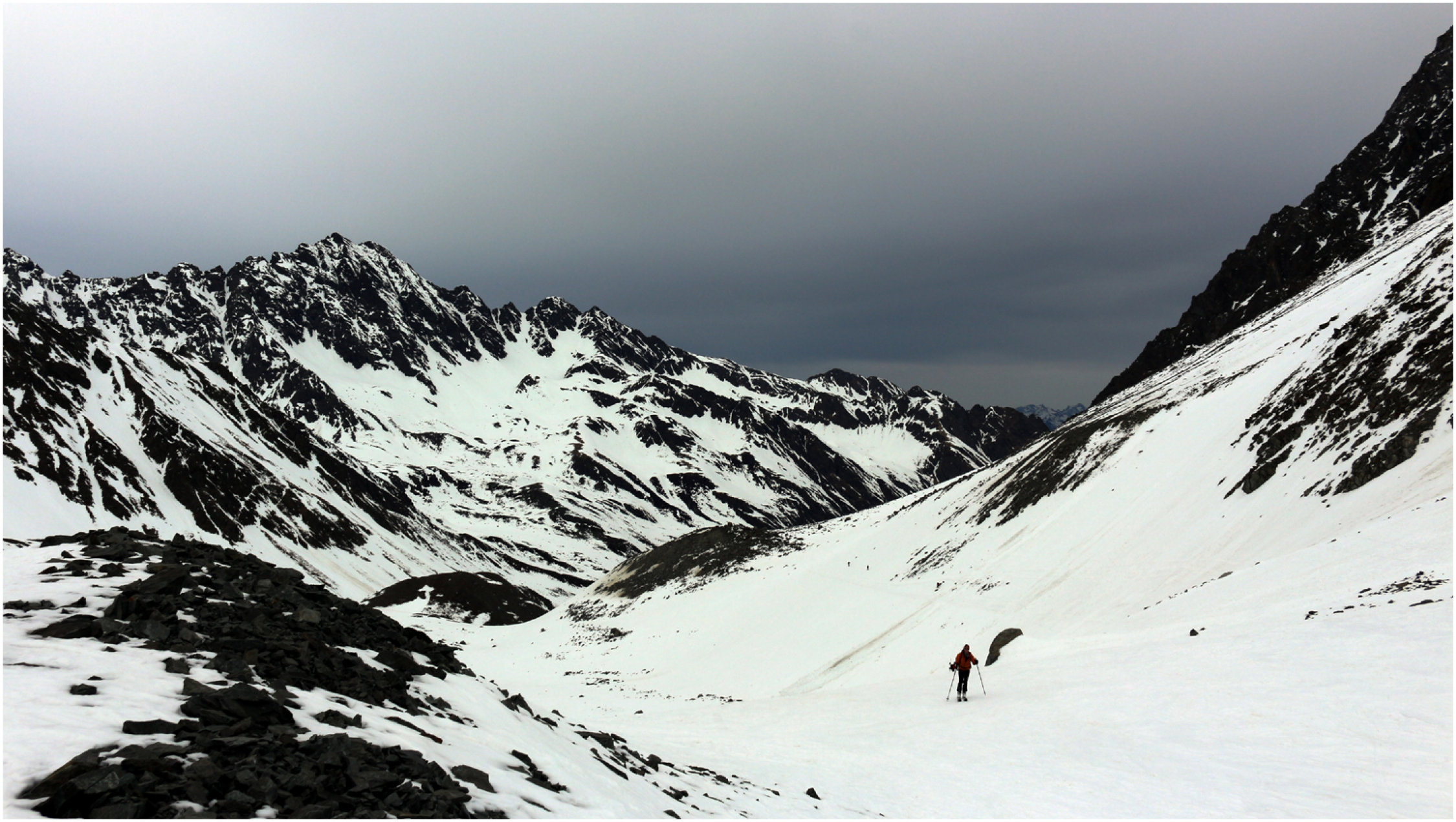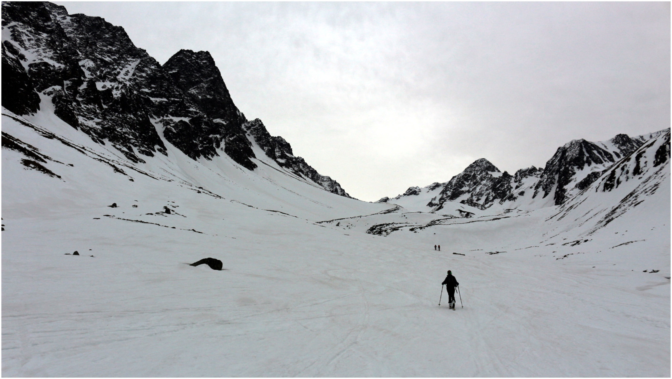 Heute unerwartet gute Bedingungen. Schneedecke ab Talschluß mehrheitlich durchgefroren, nach oben hin immer besser. Frühmorgens bedeckt gegen Mittag dann immer mehr Sonne.