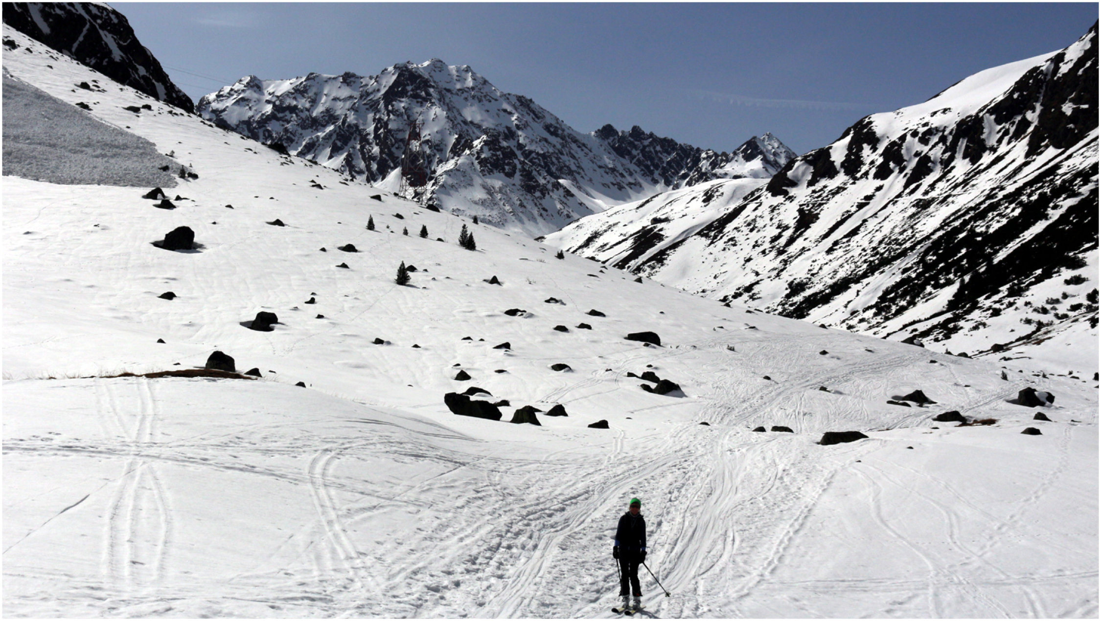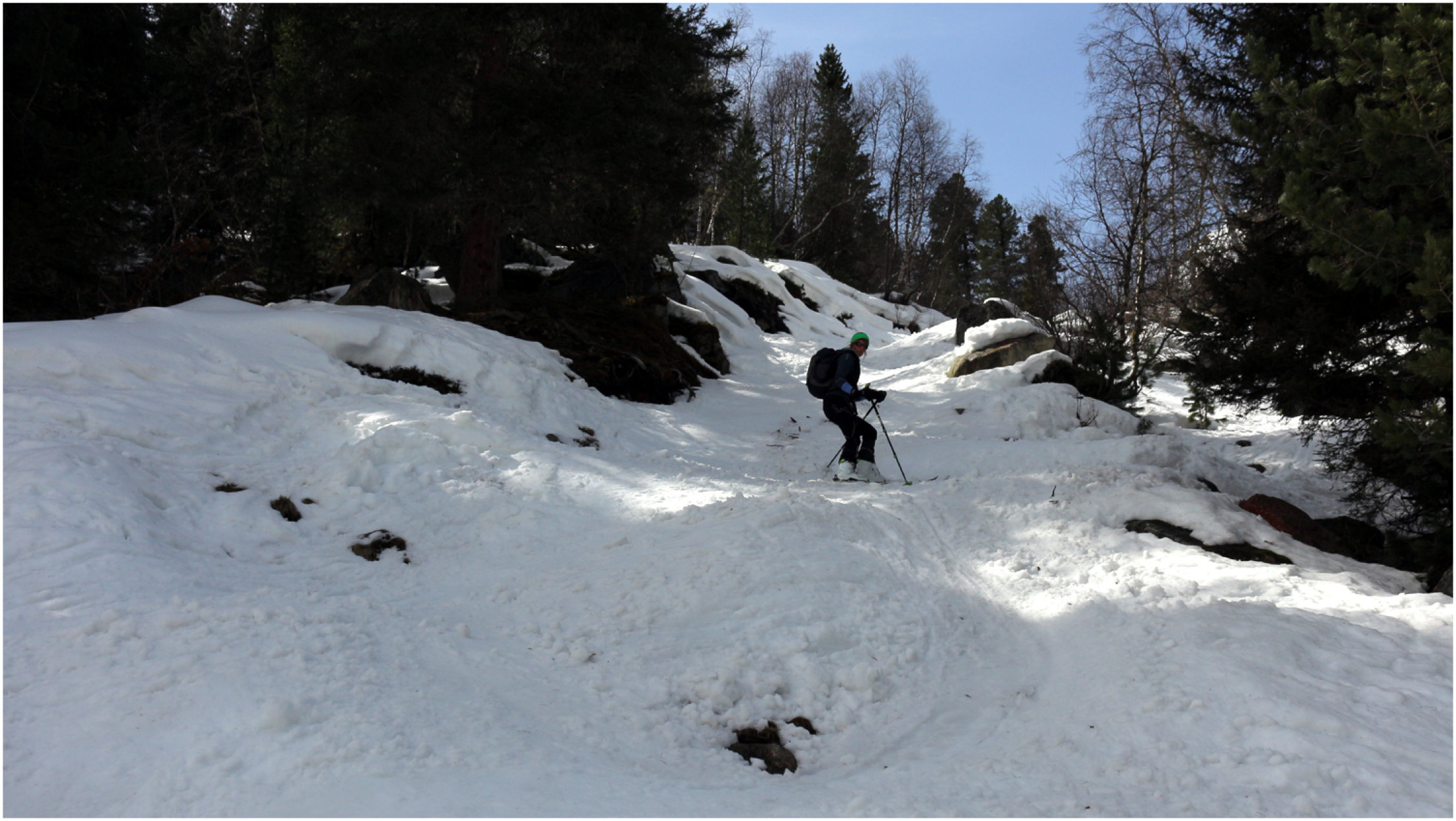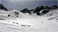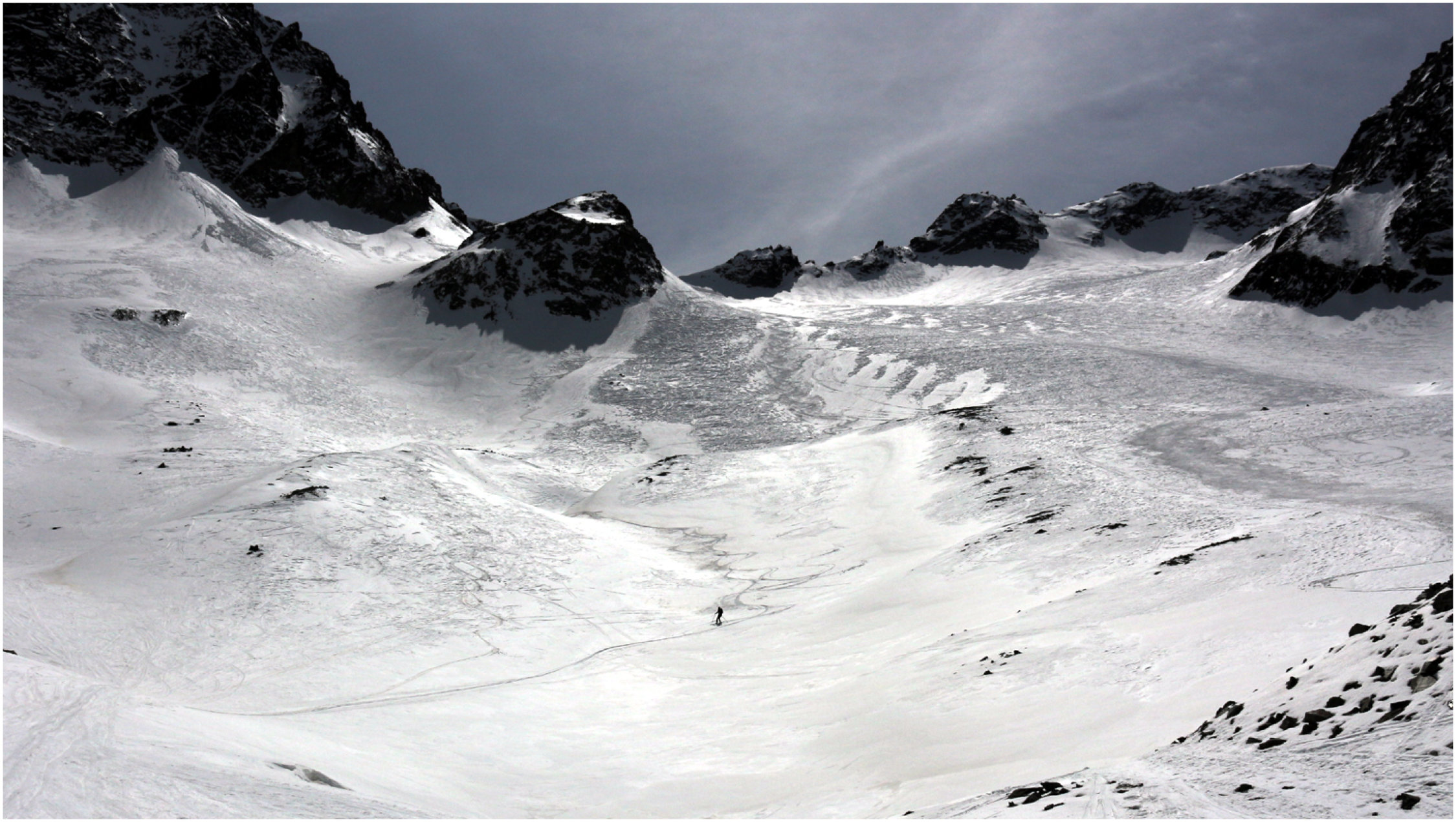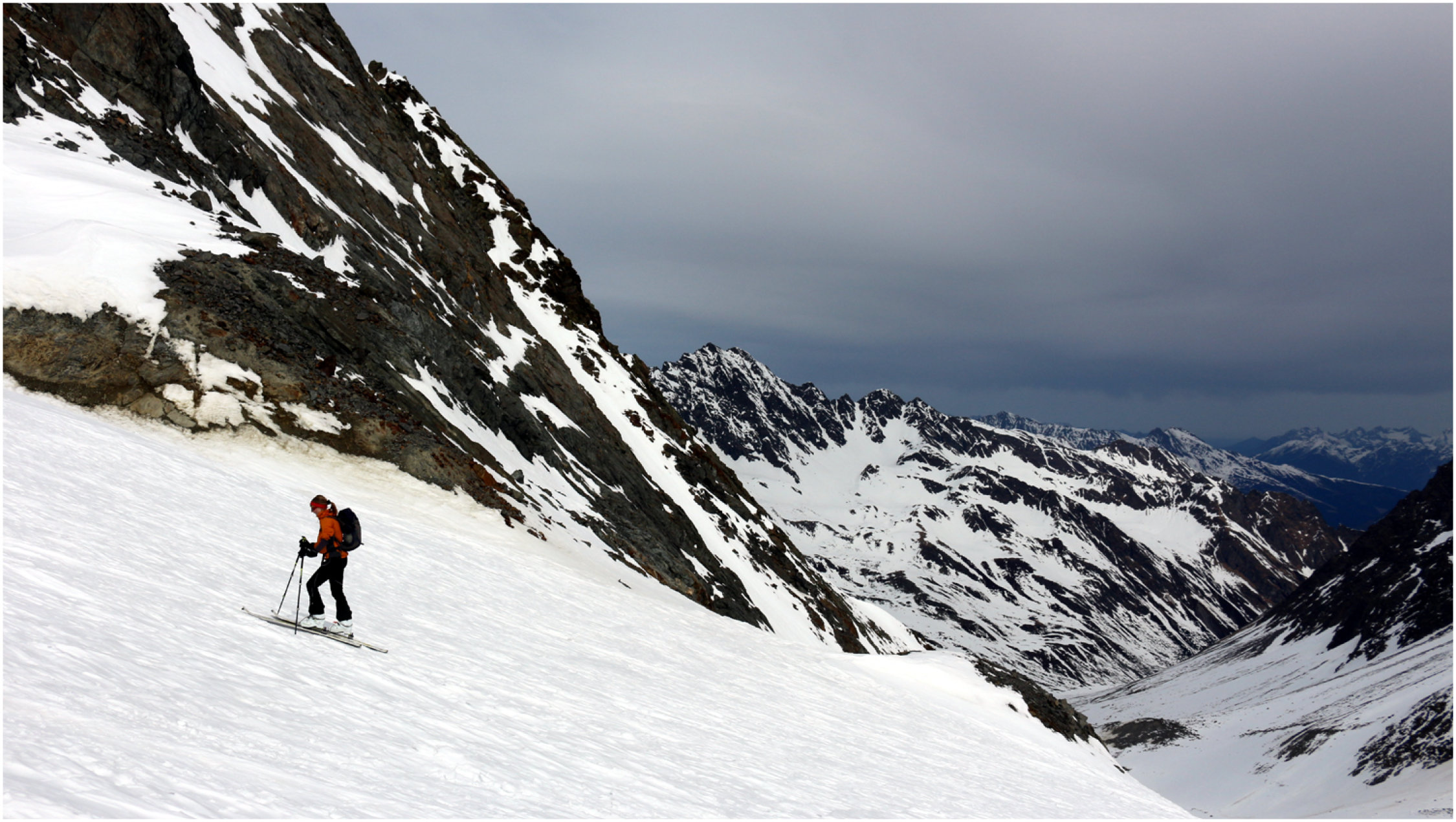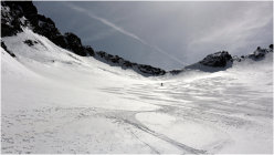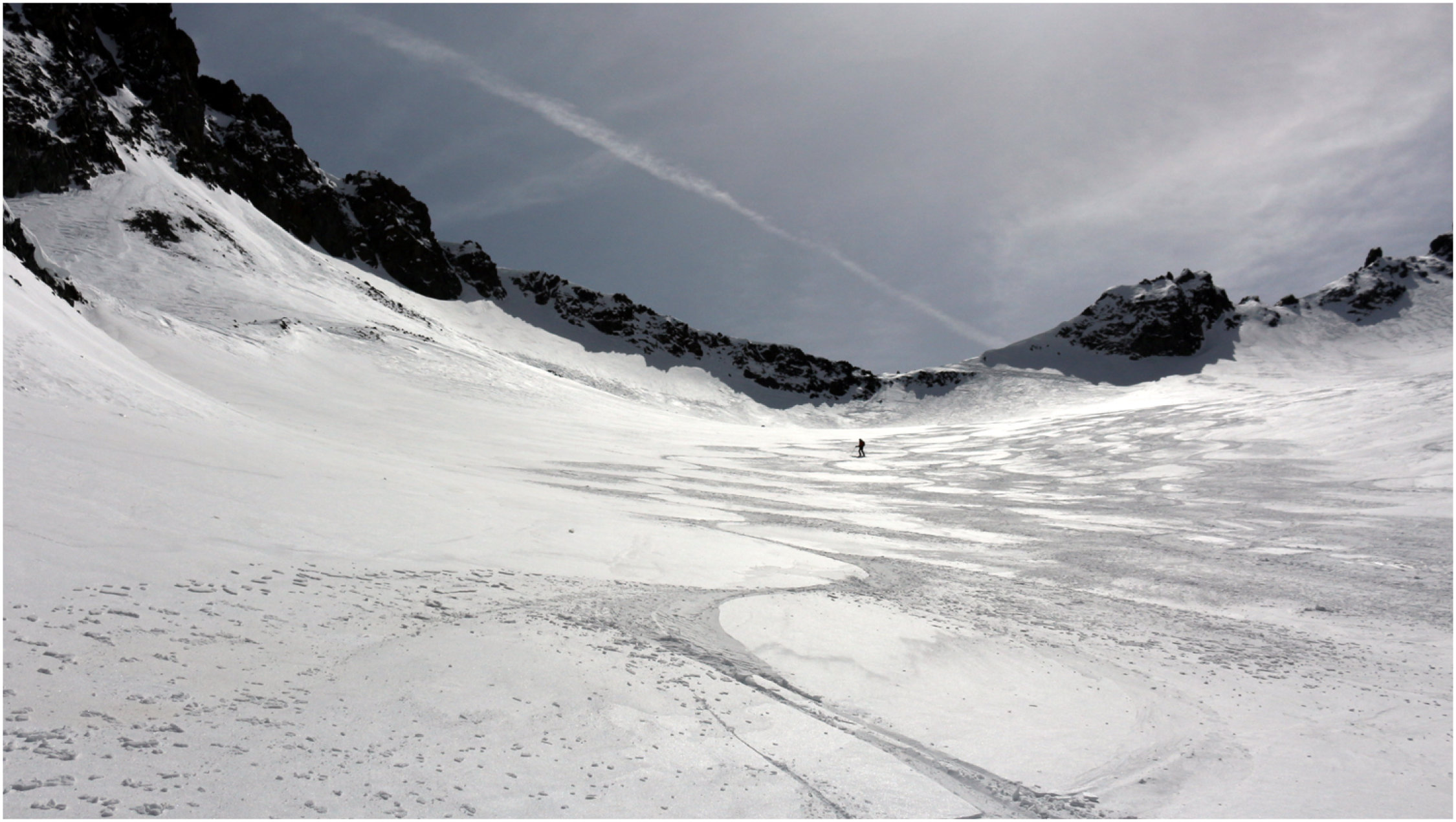 Vom Gipfel bis in den Talgrund gibts eine gut festgefahrene Piste, aber es lassen sich bei entsprechender Wahl noch genügend frei und firnige Hänge erwischen.