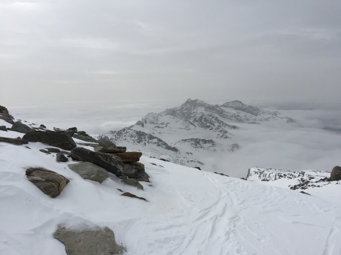 Wir sind dann nach Zermatt abgefahren. Der Grenzgletscher ist nicht gut zugeschneit und es gibt einige heikle Spalten zu überqueren. Auch rund um die Monte Rosa Hütte merkt man sofort, dass es diesen Winter nicht allzu viel Schnee gegeben hat. Zahlreiche Steine ragen aus dem Schnee, die man in anderen Jahren nicht gesehen hat.