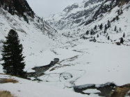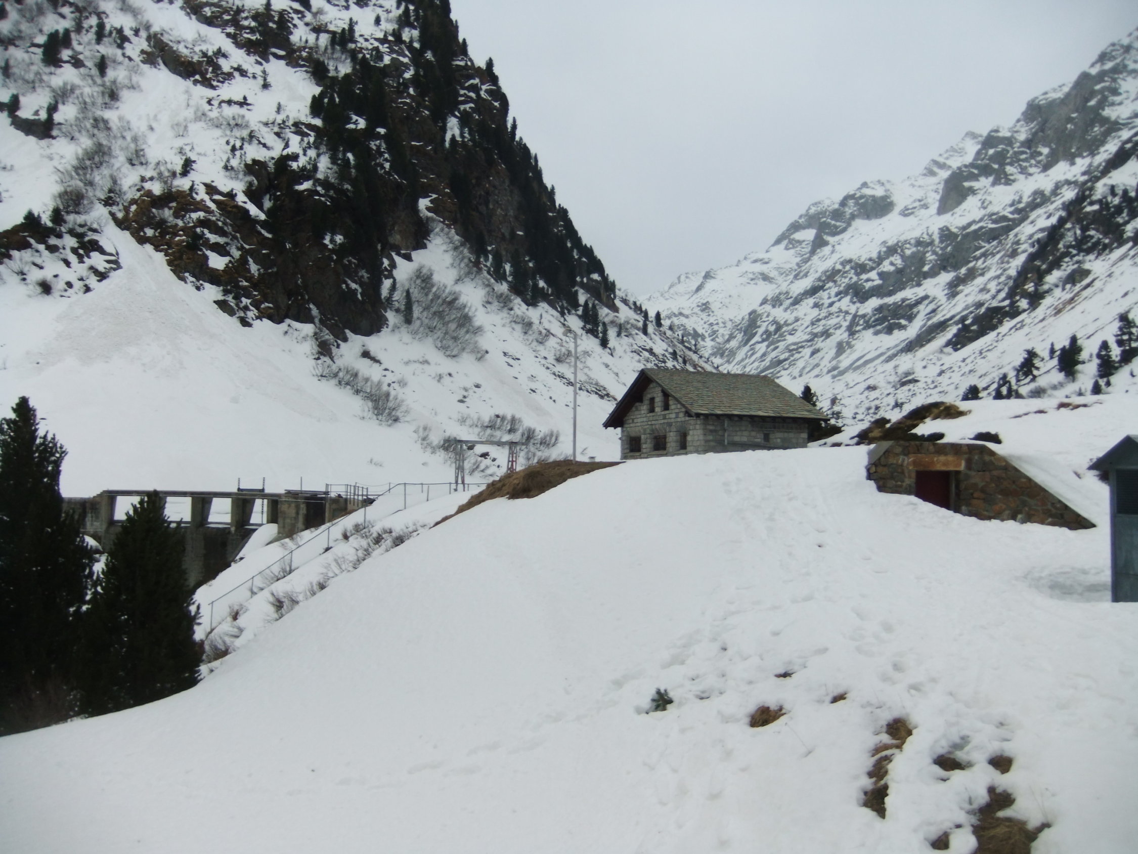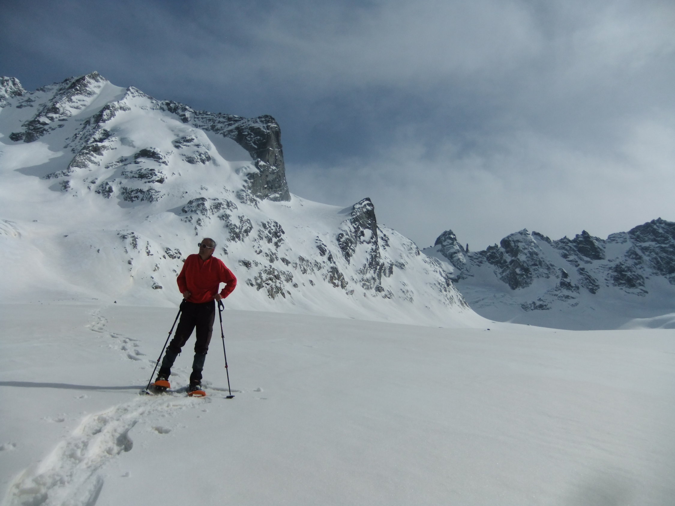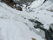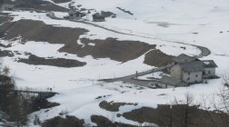 Tourenbeginn um 08:10 Uhr bei 4°. Teerstraße bis zur Brücke geräumt. Rechts daneben auf der Loipe noch genügend Schnee vorhanden. Auch auf der Schotterpiste zur Alp da Cavloc. Morgens griffig. Bis Mittag verdeckten Schleierwolken die Sonne. So wurde es erst nachmittags dann sulzig. Die meisten Lawinenhänge sind entladen.