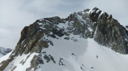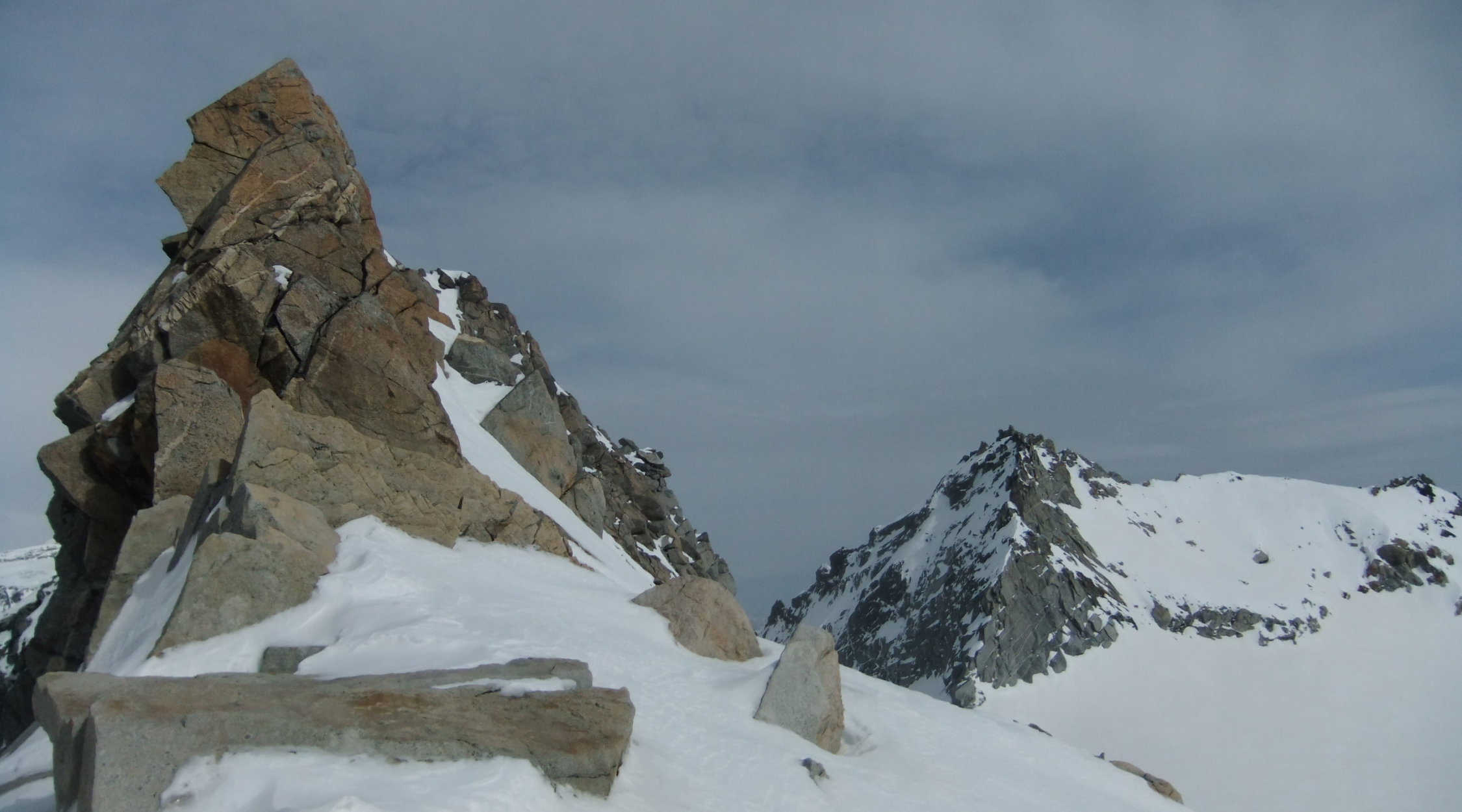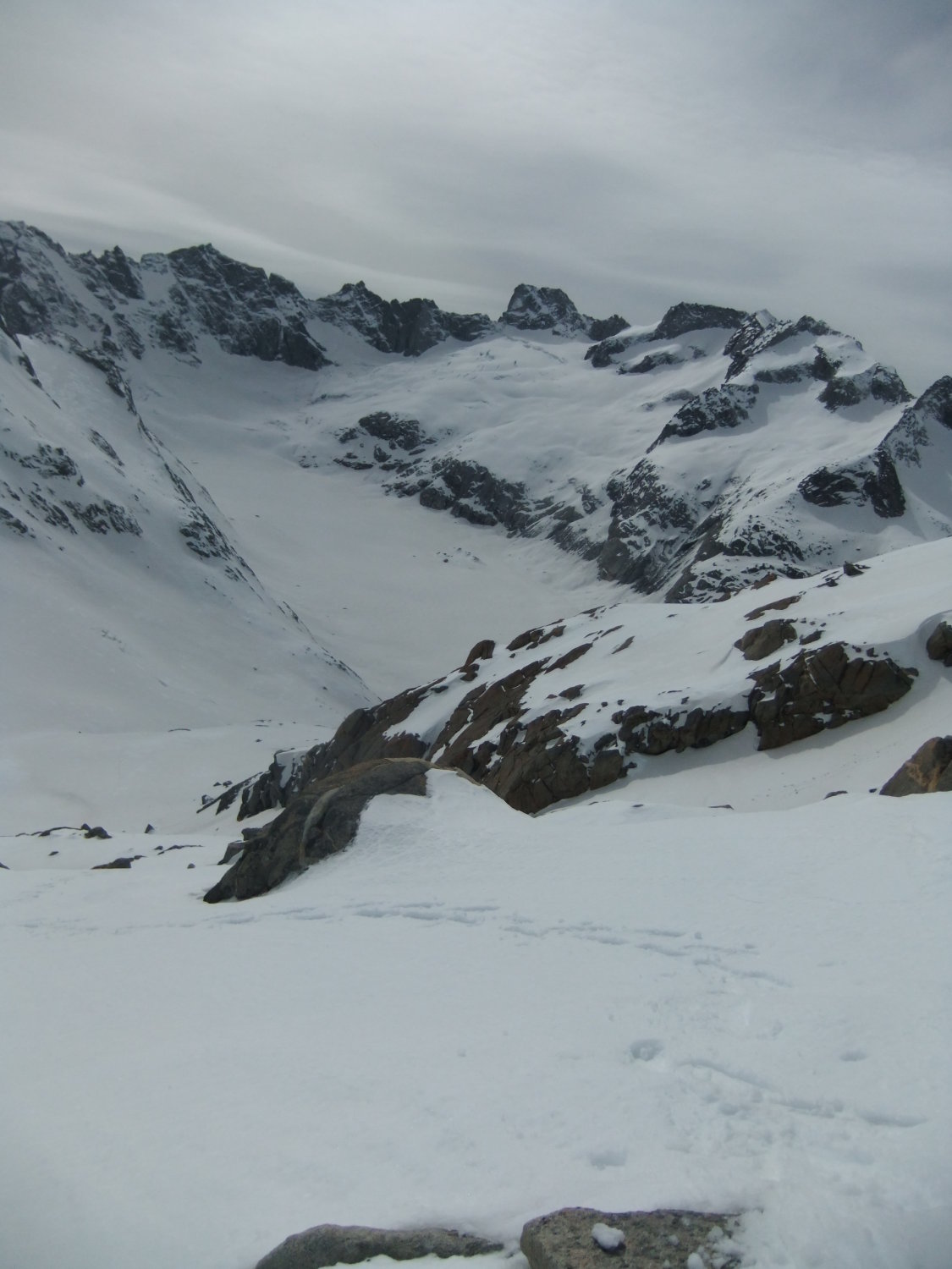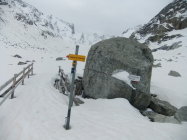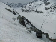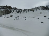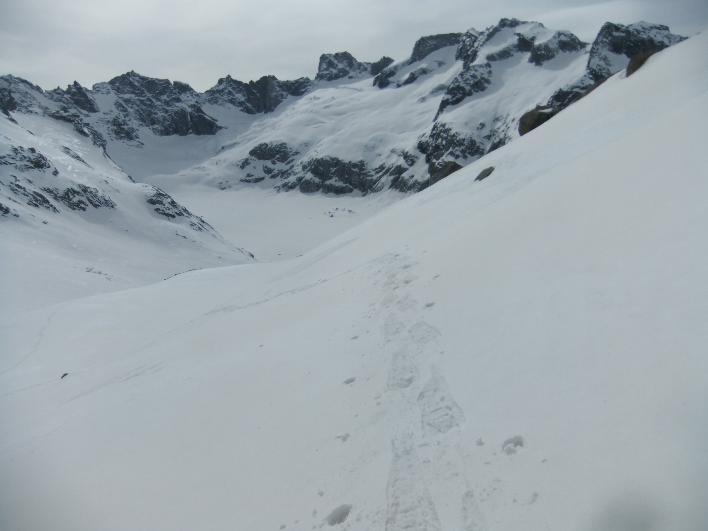 Im Aufstieg am Gletscher kurz vor dem kleinen Pyramidenstein kamen mir 5 Skitourenfahrer auf flachem Forno-Gletscher aus dem Süden entgegen. Unmittelbar danach 2 Skitürler, deren Spur sich zur Nordwand der Cima di Rosso zog.