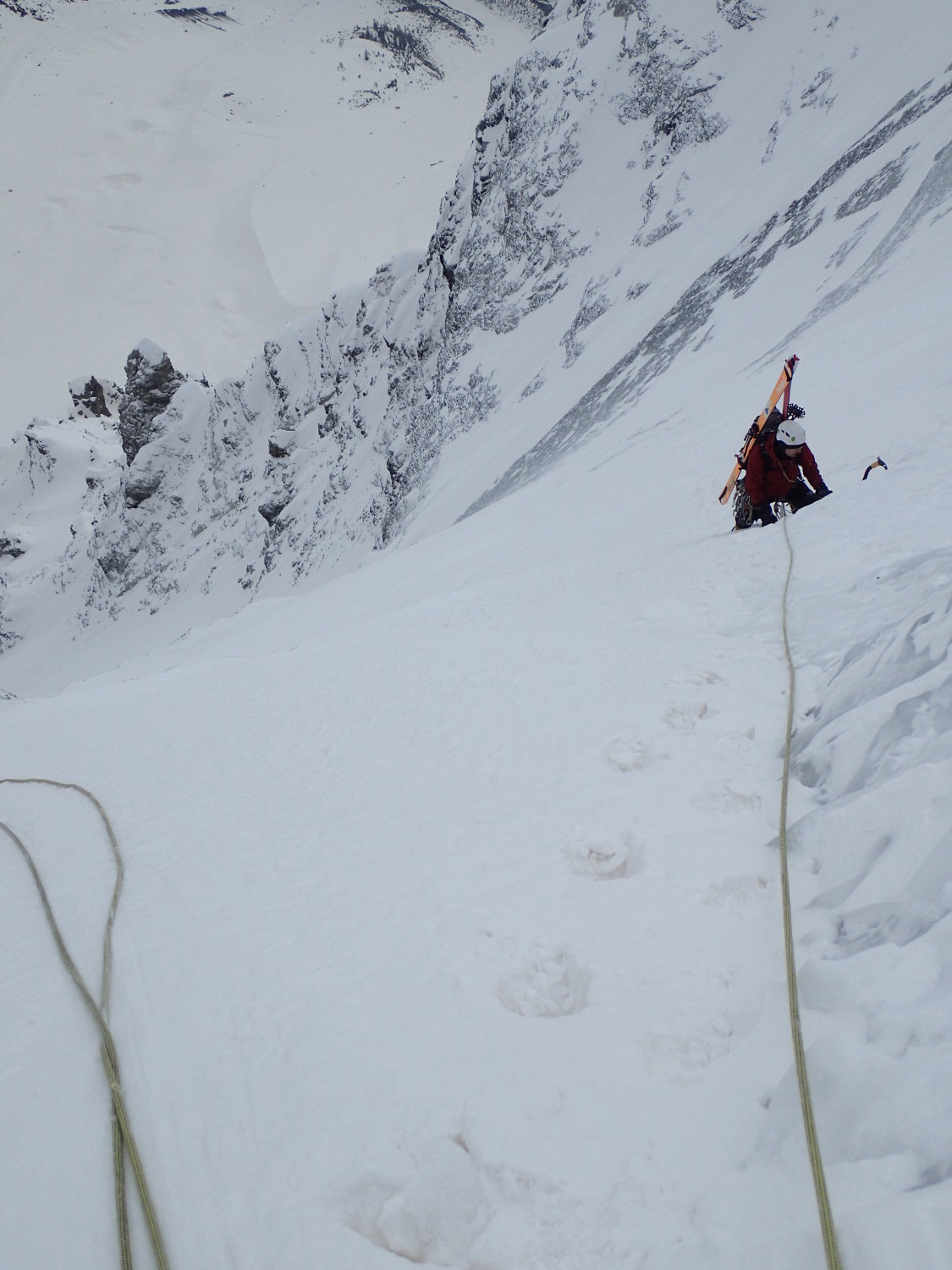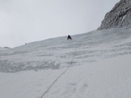 Zustieg von Sulden aus mit Skiern ohne Tragepassagen; im unteren und mittleren Wandteil überwiegend Stapfschnee, ab Flaschenhals großteils Blankeis; Einstieg um ca. 5:00, Ausstieg um ca. 11:30; kein Stein- oder Eisschlag; Abfahrt nach Trafoi aufgrund der heiklen Lawinenlage erst am nächsten Morgen; Nacht auf Ortlerbiwak.