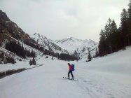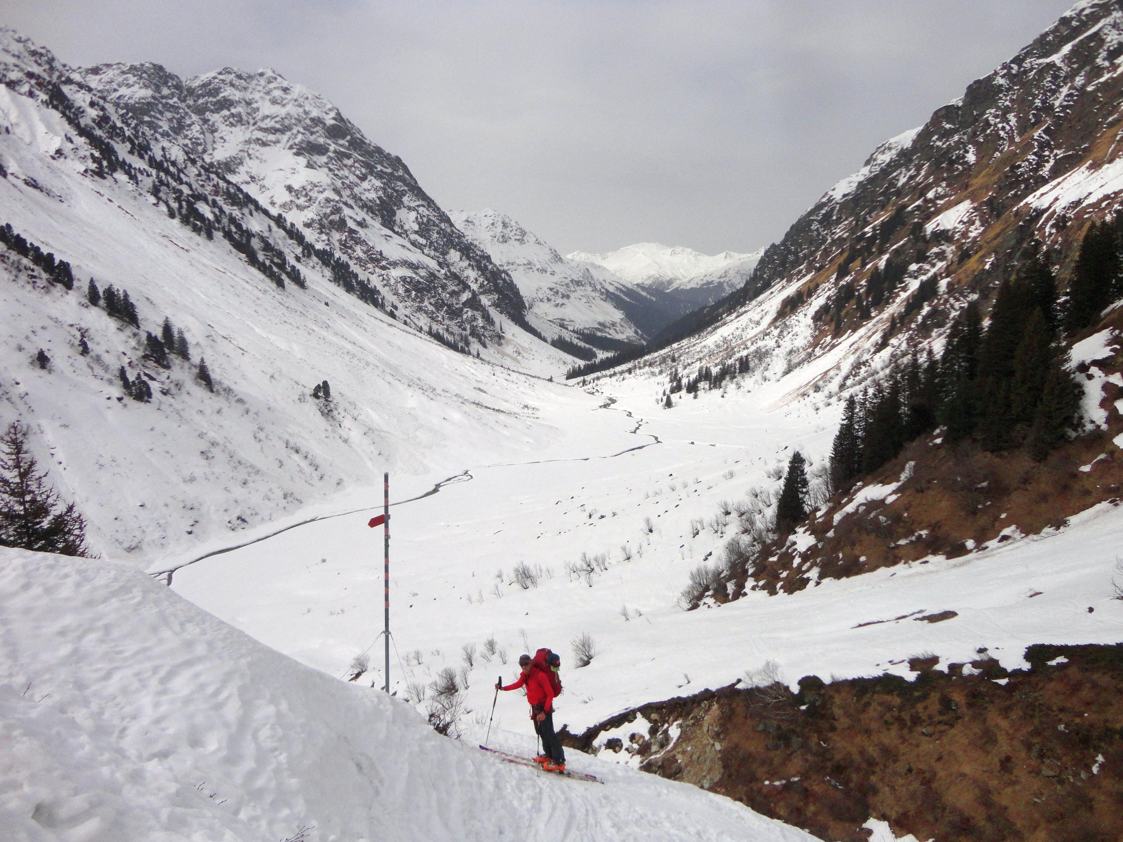 Zustieg Silvrettahütte: Geschlossene Schneedecke ab Alp Garfiun, im Wald einige kürzere Tragestellen. Wir sind auf dem Rückweg auf der Loipe bzw. den Resten davon noch bis kurz vor Monbiel gekommen. Aufstieg durch´s Galtürtälli zur Zeit unproblematisch, die grösseren Lawinen im Auslauf sind schon unten, oben eher flacheres Gelände.