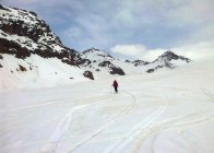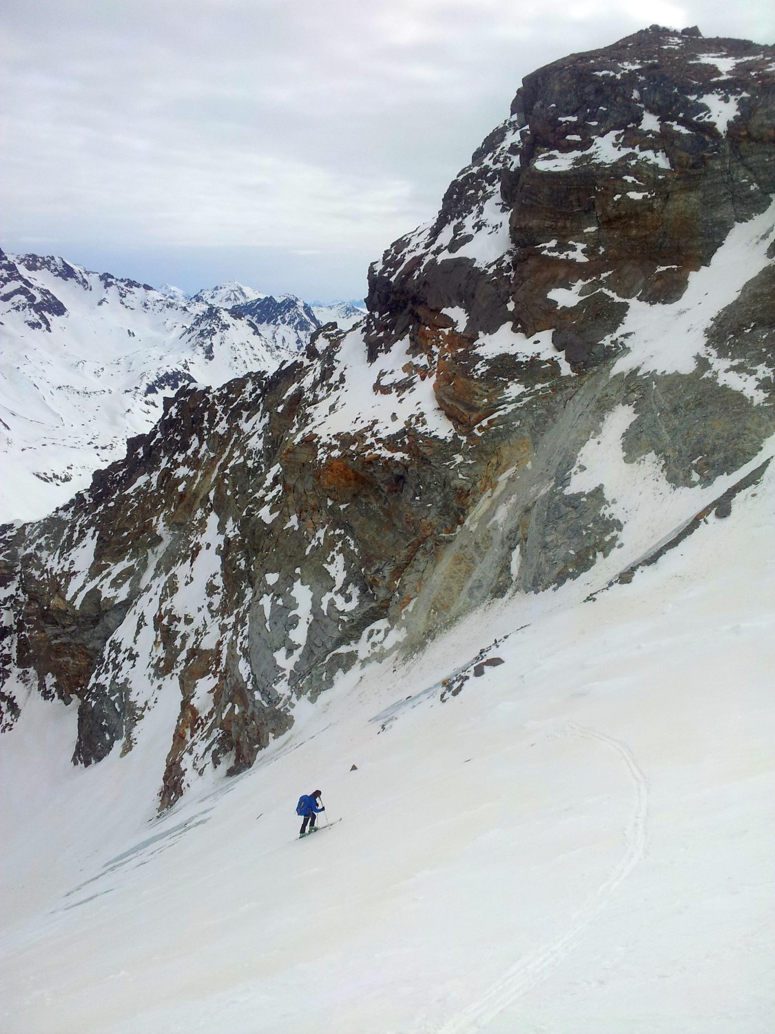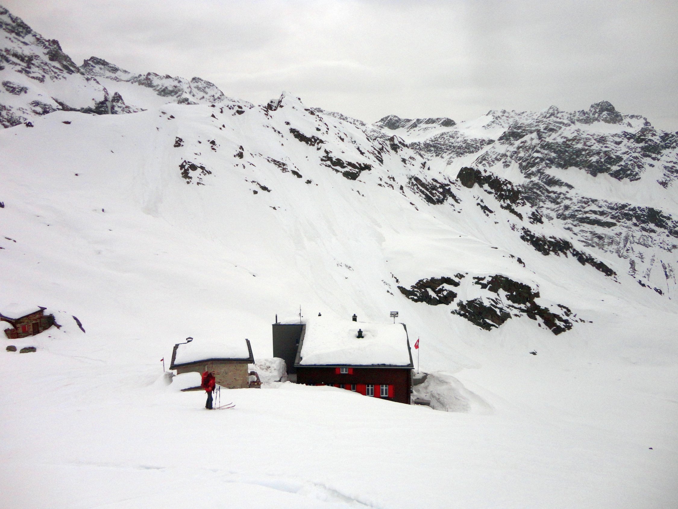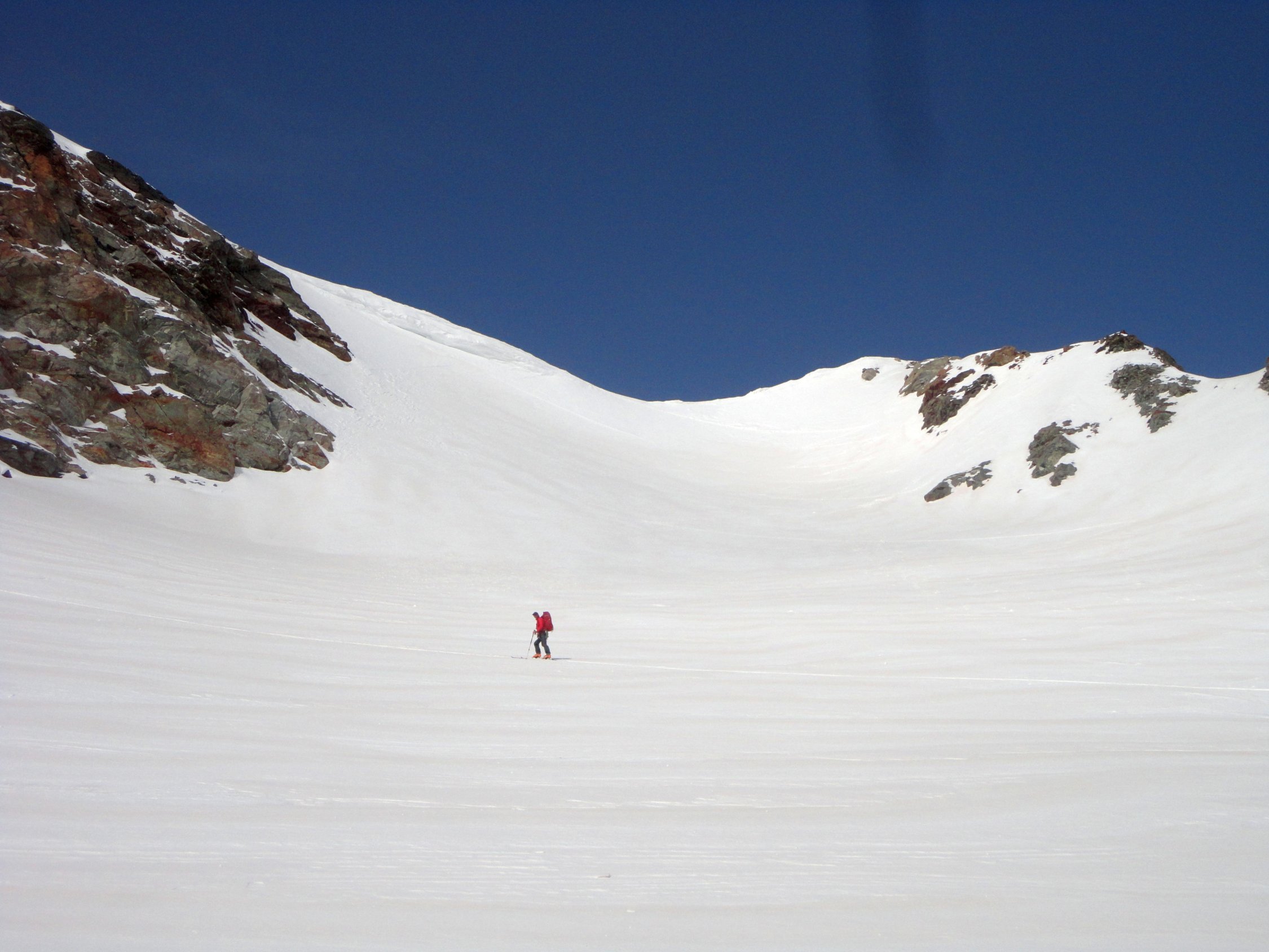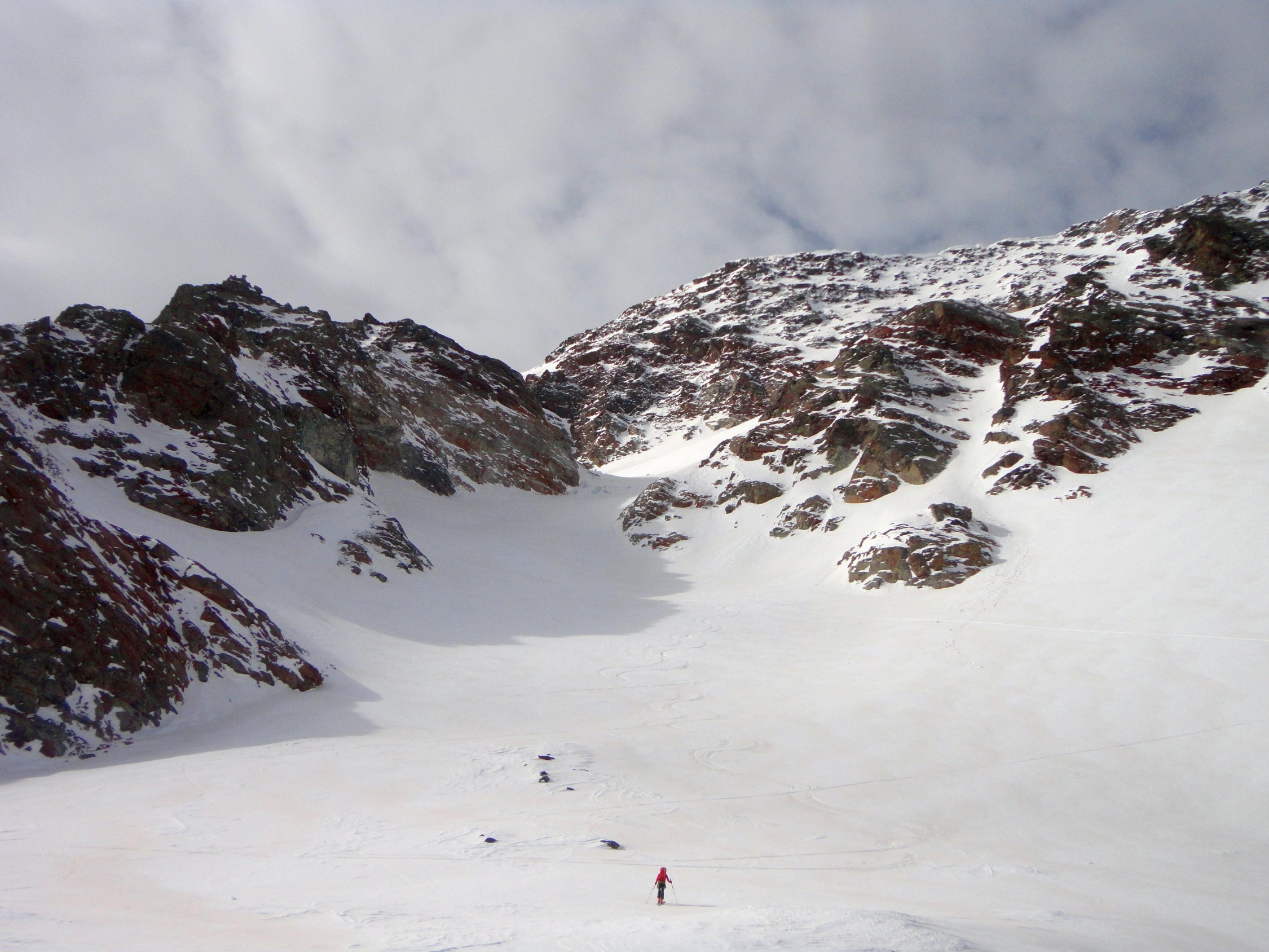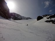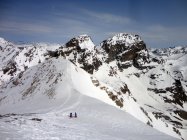Schnee- und wettertechnisch heute deutlich bessere Verhältnisse als am Samstag. Nachts offensichtlich gute Abstrahlung und morgens durchgefrorene Schneedecke (zumindest oberhalb 2.300 m). Abfahrt Gipfelhang leicht aufgefirnt, aber noch nicht richtig gesetzt, im nordseitigen Couloir pistenartig und am Gletscher schon leicht sulzig. Schnee oftmals etwas pappig.