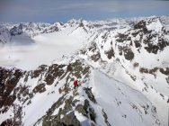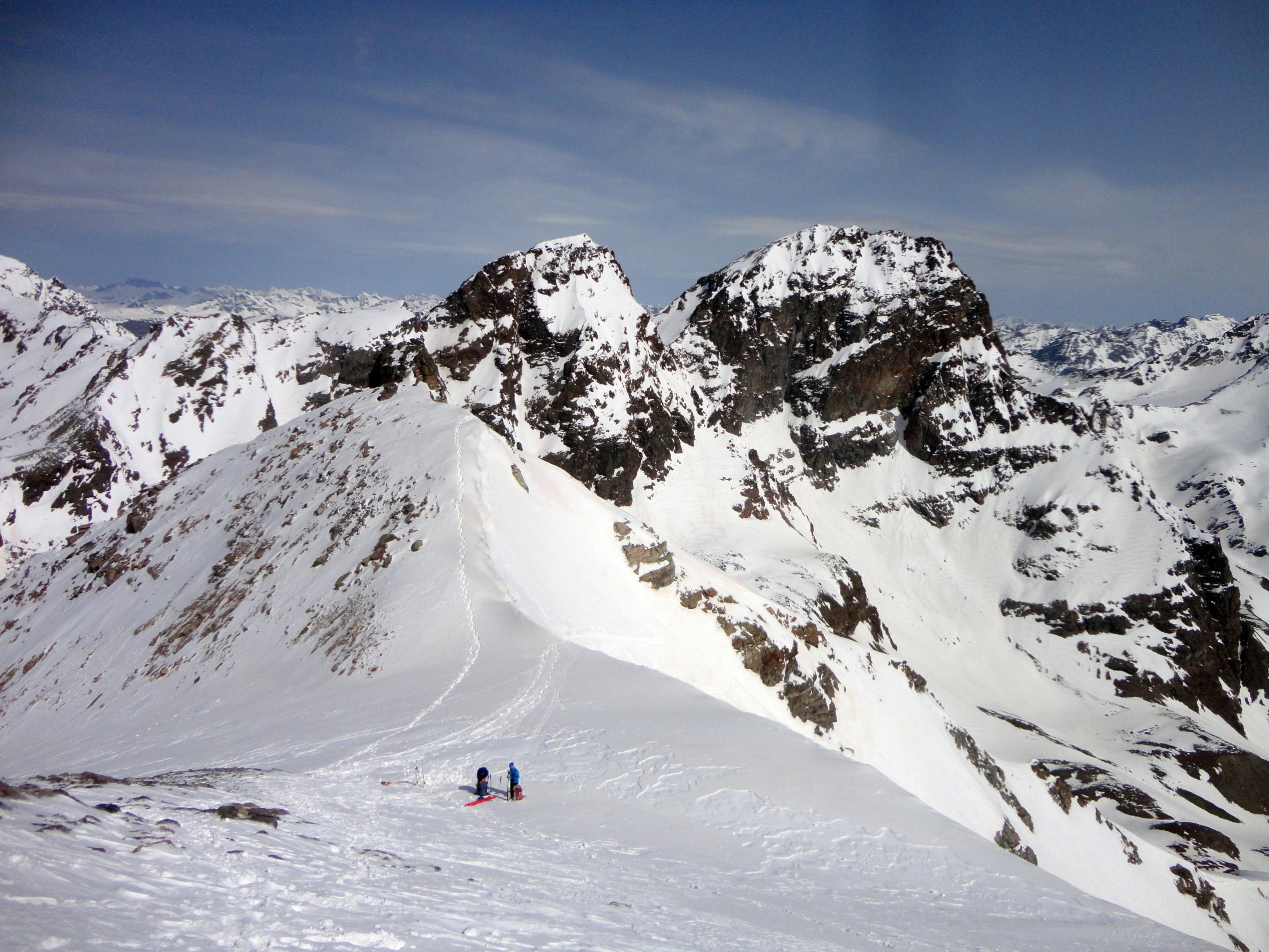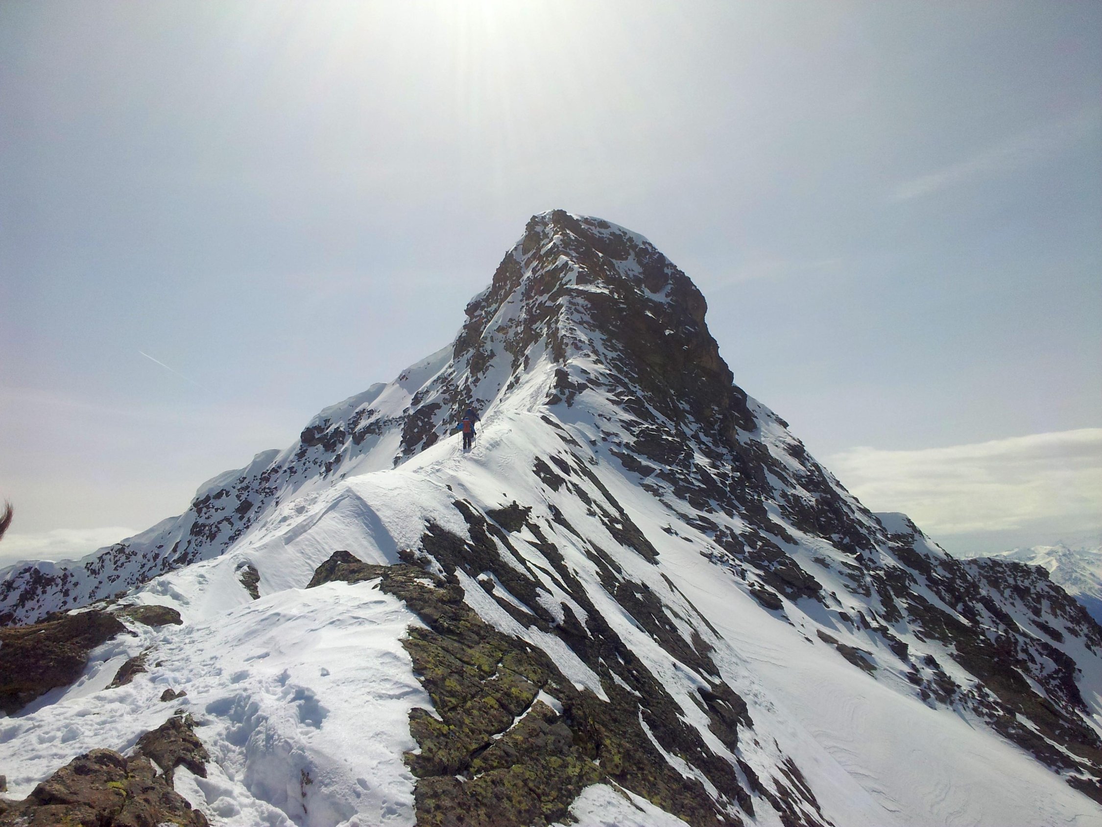 Gipfelaufstieg hat mittlerweile eine gute Spur und Trittschnee, Pickel und Steigeisen waren angenehm, aber nicht unbedingt notwendig. Die ursprünglich geplante Aufstiegsroute über die Nordwestflanke sah uns zu kritisch aus. Also vom Sattel Plan Mezdi nochmal 200 m runter in die Mulde von Plan Rai und auf dem Normalweg von der Chamanna Tuoi über die Nordostseite zum Gipfel.