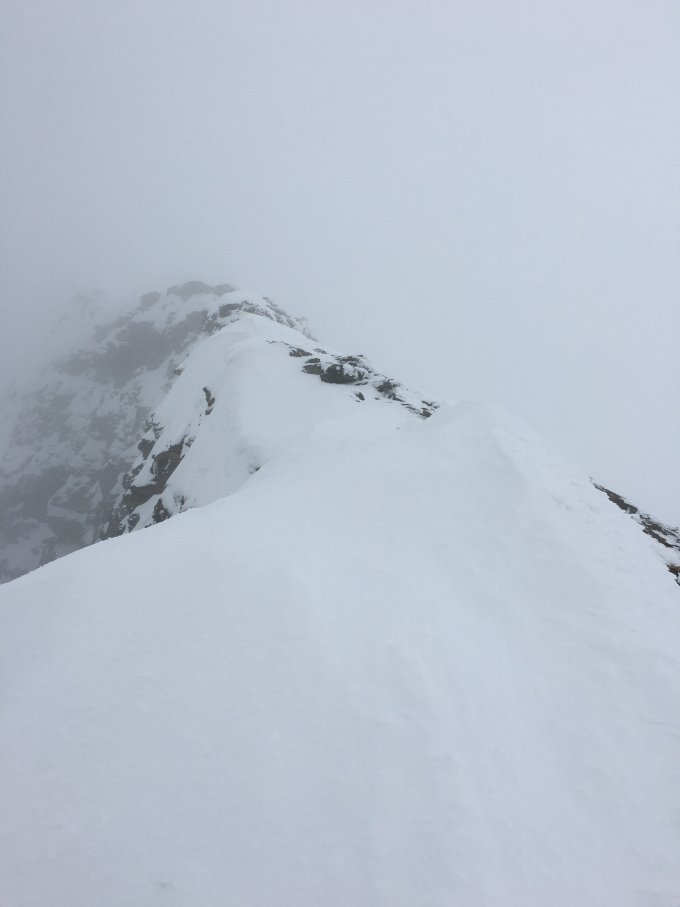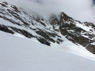 Die Rinne, die zum Gipfelhang führt, hat nur wenig Schnee und Eis, so dass man auf den Steinen aufsteigen muss. Teilweise etwas heikel, kann mit Frühlingsschnee nur besser werden.