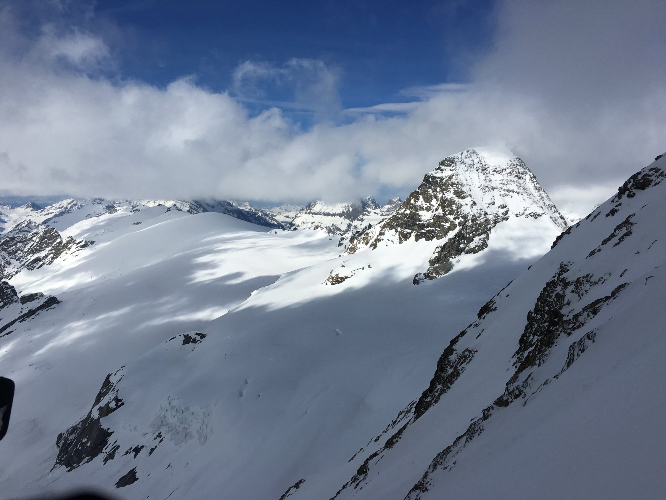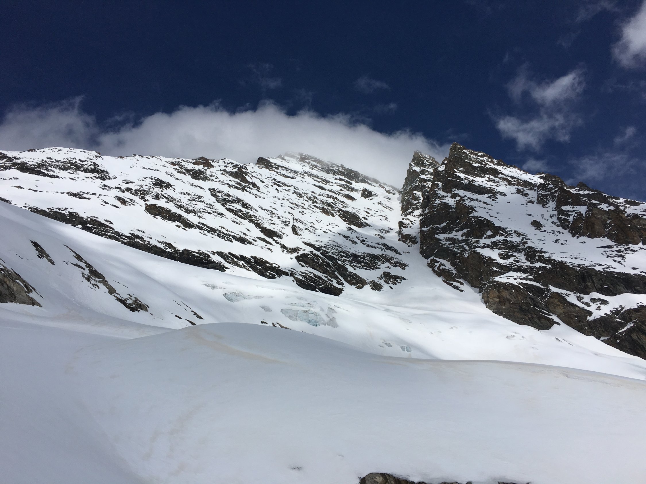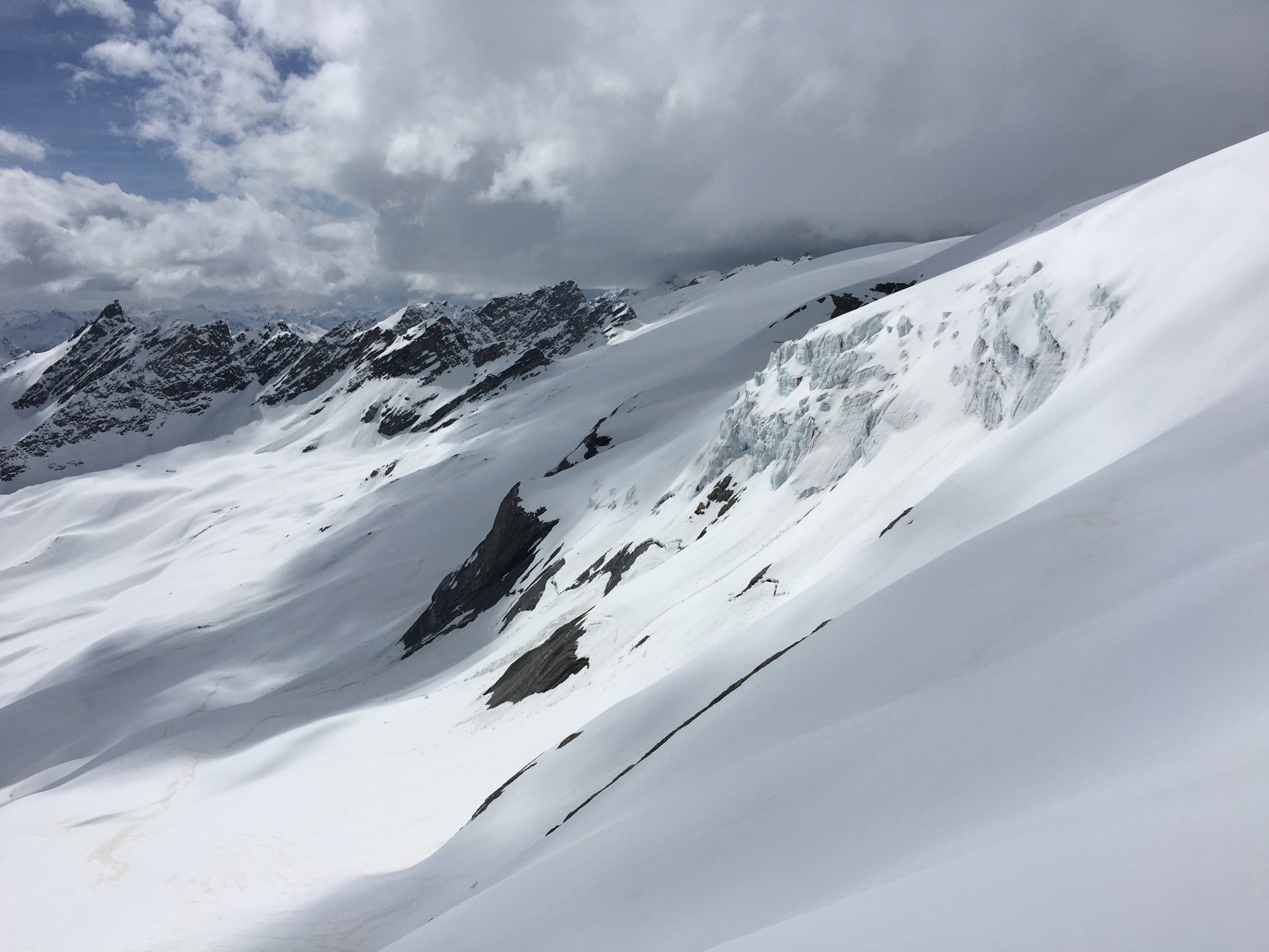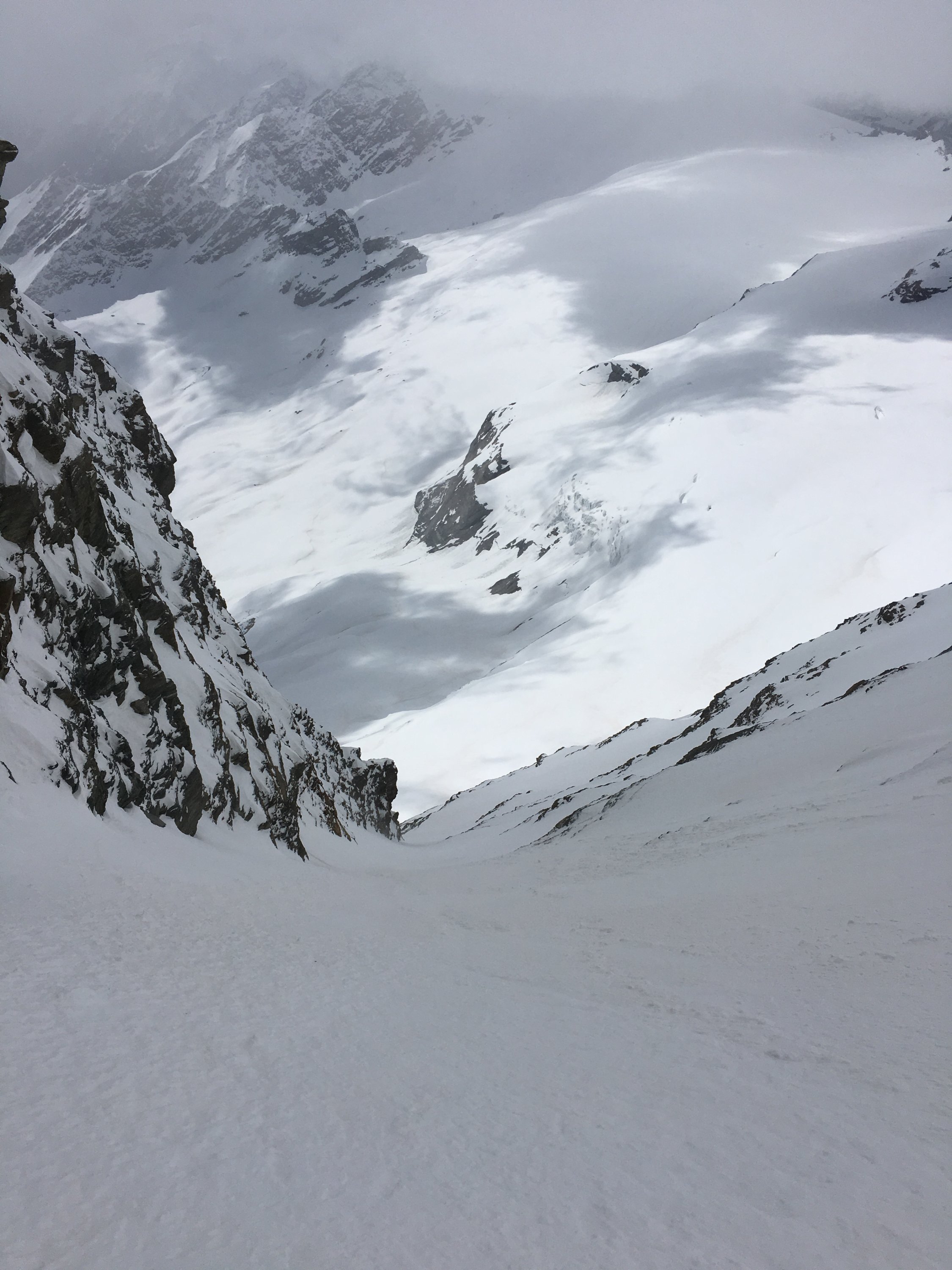 Allgemein gute Bedingungen. Der Schnee im Couloir selbst ist noch nicht richtig durchfeuchtet; zum Teil trifft man Bruchharst an. Sonst alter Presspulver. Unten im Couloir viele Lawinenschneekugeln.