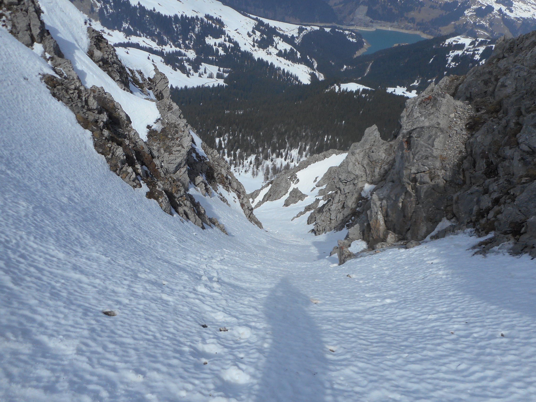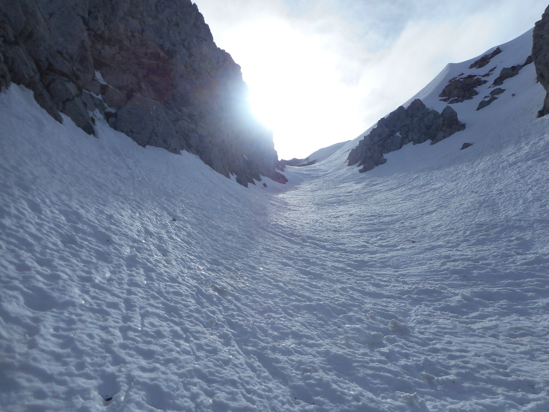 Abfahrt: Abfahrt um 11.00 Uhr war perfekt. Der Schnee hat im Couloir immer getragen, und es bestand keine Gefahr vor Nassschnee-Lawinen. Wir waren uns beim Start nicht sicher, ob es möglich ist, das Couloir zu verantworten. Ansonsten wäre ich wieder die Normalroute abgestiegen.