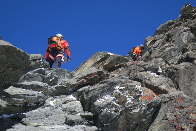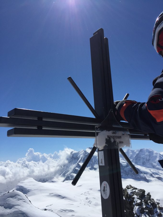 Bis kurz vor dem Allalinpass seilfrei, danach am Seil weiter, unter dem ersten Felssporn durch, unter dem zweiten Felssporn ebenfalls durch, hier ist es dünn über den Spalten, aber am Seil geht es, einer von uns ist eingebrochen, am Seil jedoch problemlos rausgezogen. Weiter hoch zum Skidepot auf ~4000m mit Steigeisen das Schneefeld hoch, hat Blankeis drin, teilweise dünne Schneeauflage. Wichtig nicht das ganze Schneefeld rauf! Linkerhand raus, über Felsen hoch, alles im trockenen Fels hochgeklettert, Schlingen und Stangen weisen den Weg. Alte Spuren sind teilweise in schmalen Schneefeldern sichtbar, sieht aber nicht gut aus, Fels ist bedeutend besser. Oben dann auf den Grat und diesem unschwer aber luftig folgen zum Gipfel mit Kreuz.