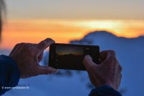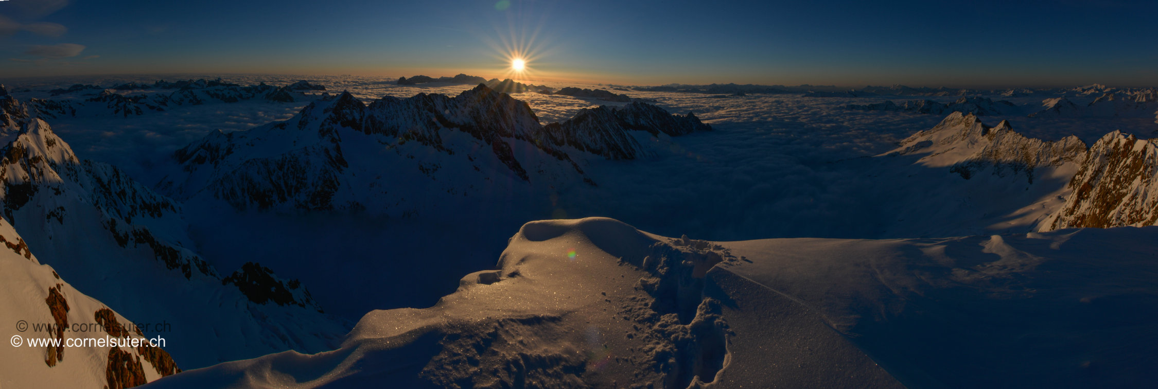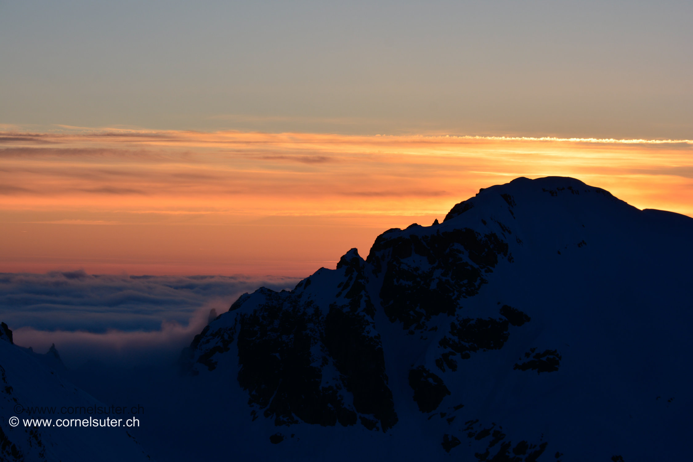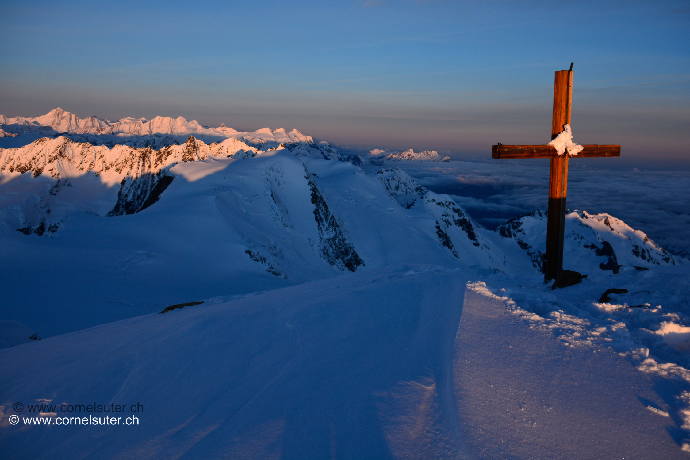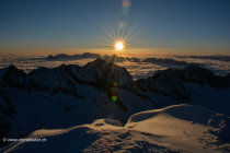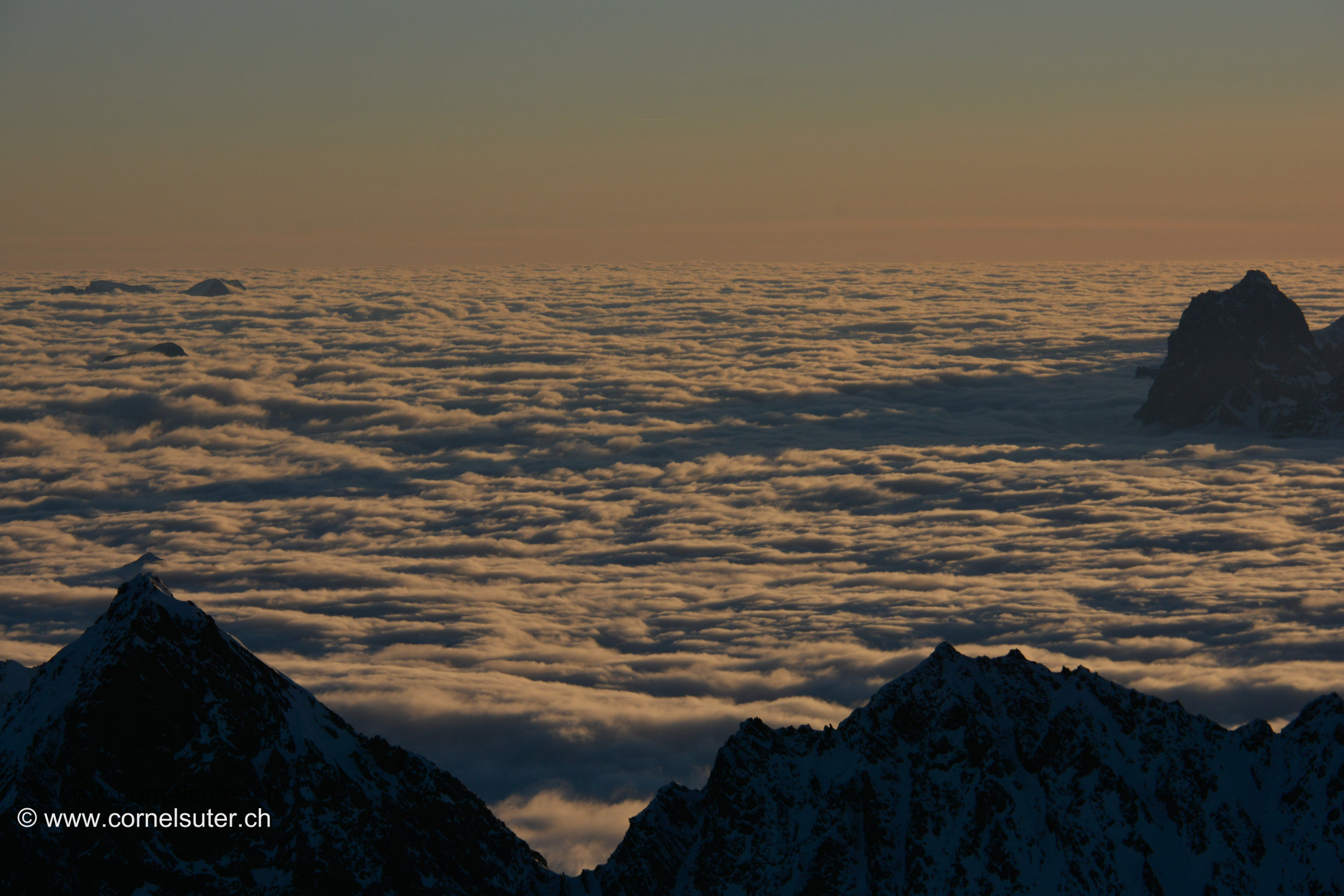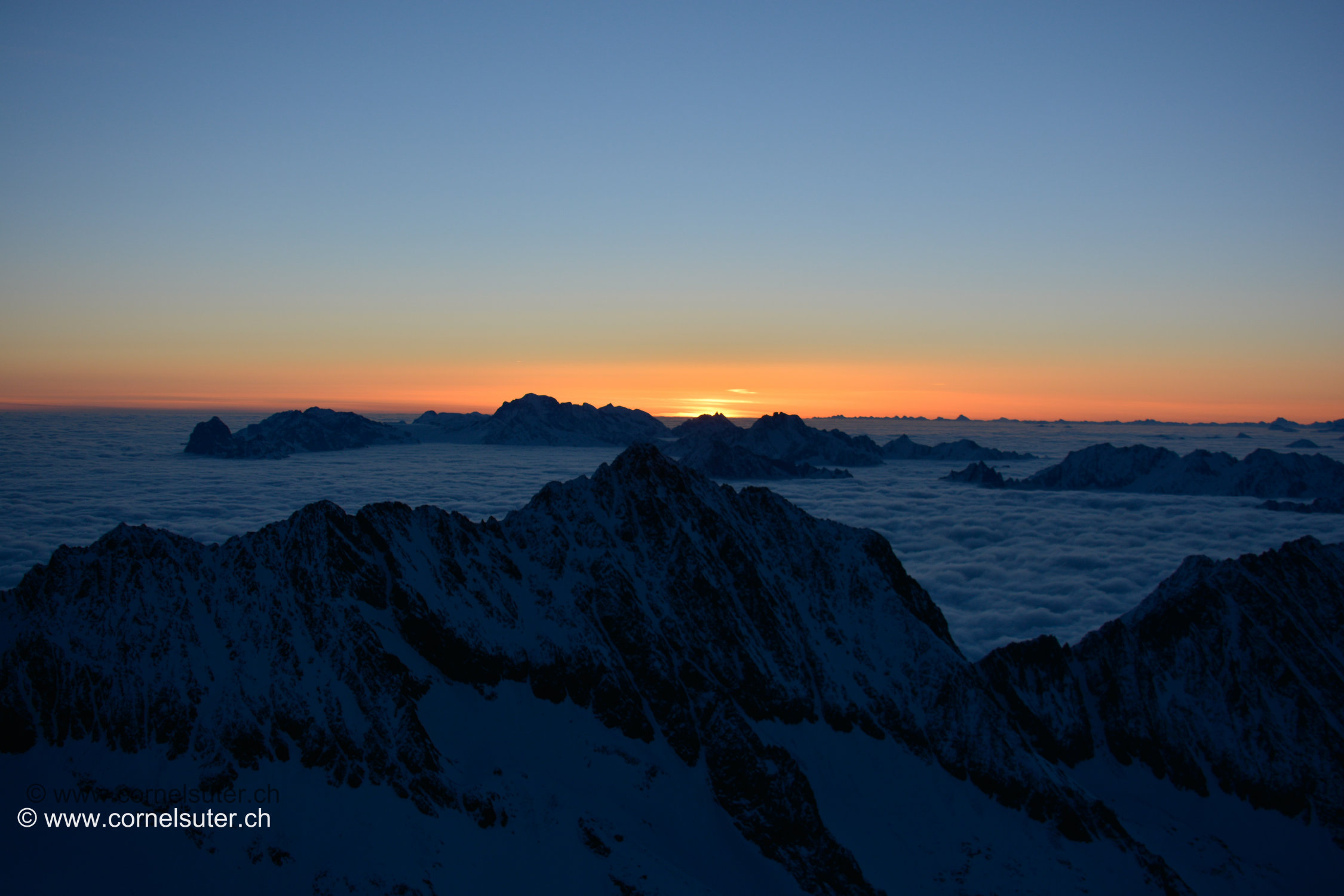 Ankunft auf dem Sustenhorn noch vor Sonnenaufgang. Etwas später erwacht nun auch der Tag in einem fantastischen Sonnenaufgang mit einem Nebelmeer bis hinauf auf ca 2400m.