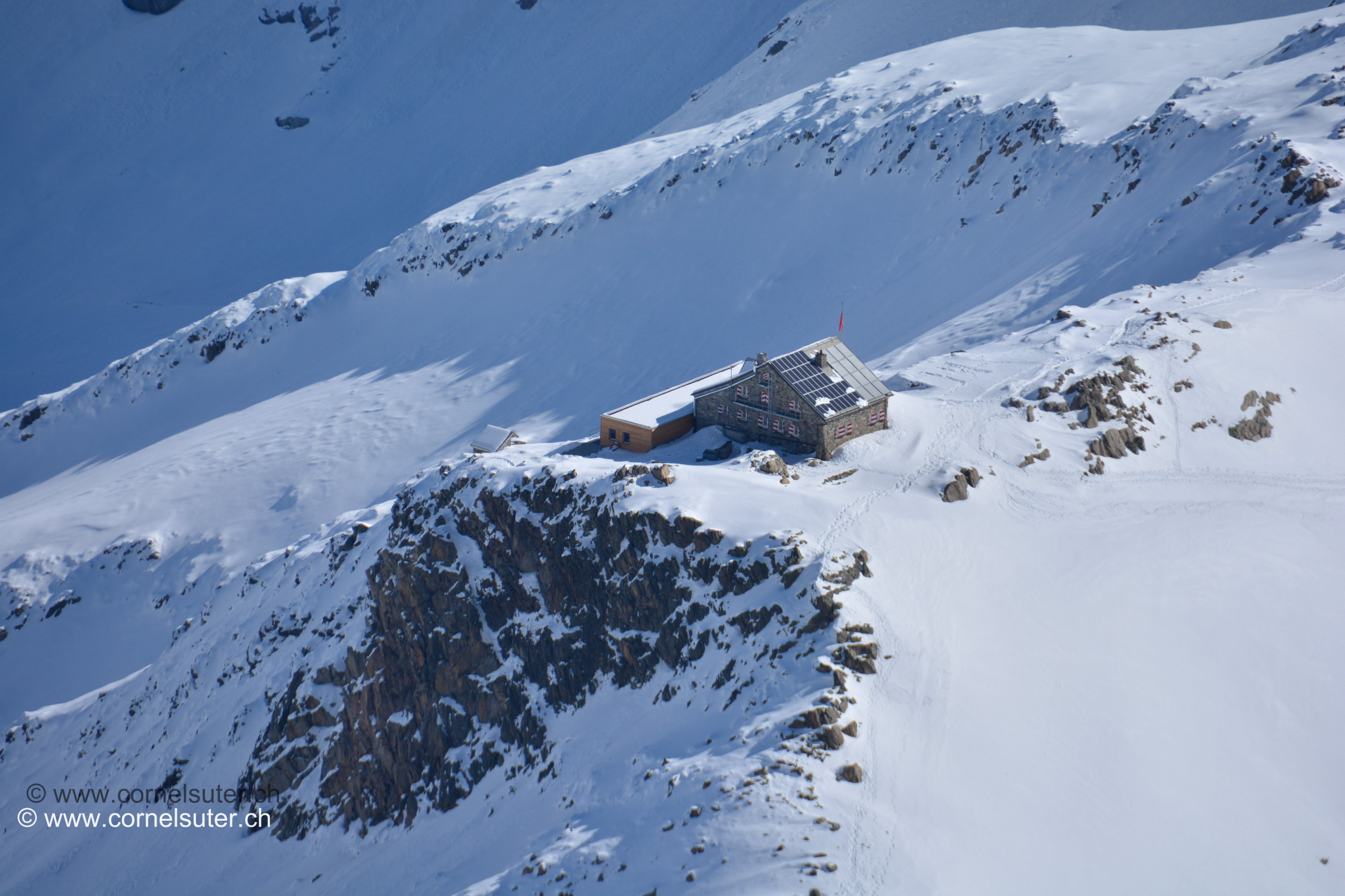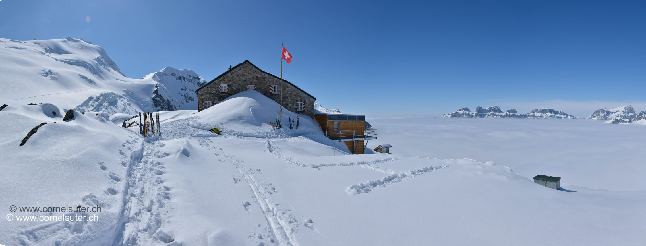 Die Querung oberhalb Chööbärgli hinüber zum Steigletscher ist gut machbar. Im Aufstieg bei der Steilstufe gleitet der nasse Neuschnee teilweise auf dem Altschnee hinunter. Nach dieser Stufe hatte man den Nebel durchbrochenes war einfach nur Sonnig, schon bald erreicht man die Tierberglihütte 2798m, welche einen sehr schönen geräumigen Anbau erhalten hat.