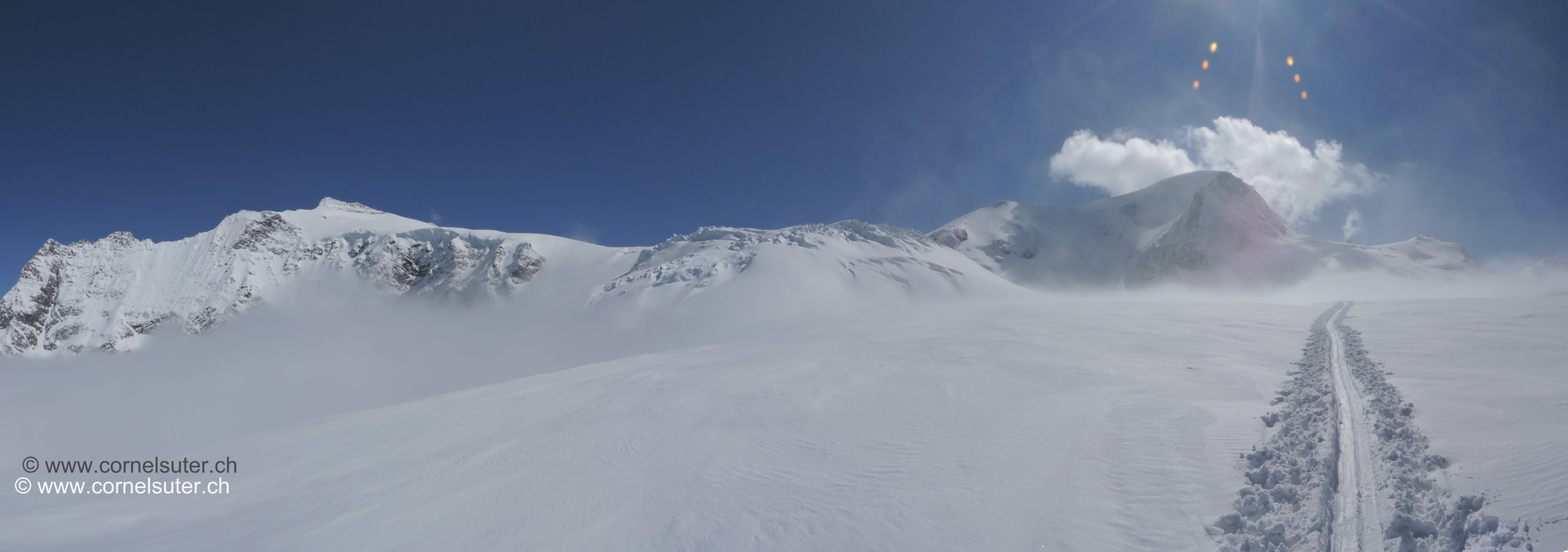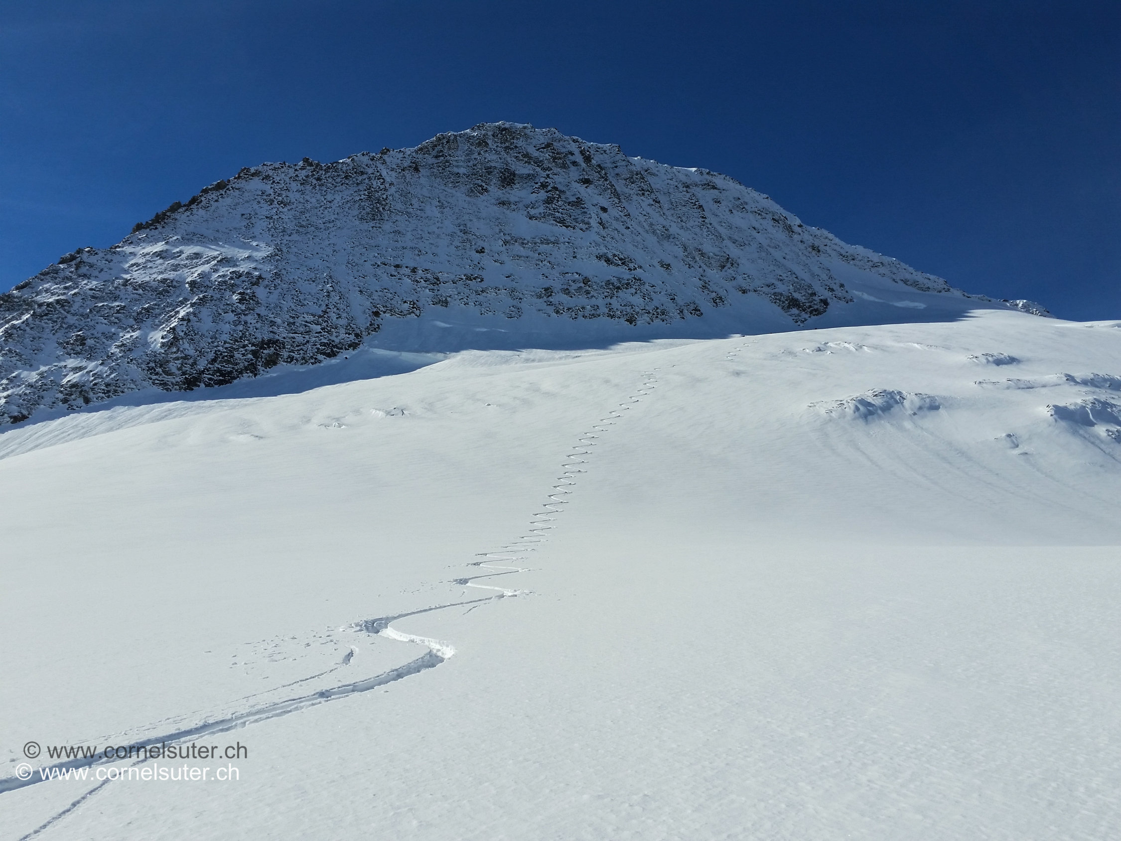 Angekommen in der Grossen Mulde östlich vom Gwächtenhorn, noch ein Aufstieg zum Mittler Tierberg. Die Spur vom Vortag war noch zu erkennen der Wind hat die Spurt mit Schnee gefüllt, daher regelmässig aus der Spur gerutscht, folglich eine neue Spur gelegt.