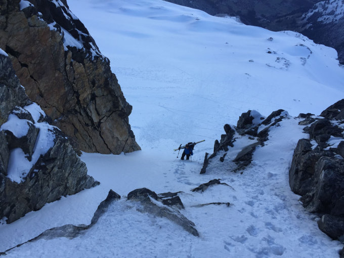 Unten wählten wir die Abfahrtsvariante "Hüttencouloir". Diese wies einige etwas exponierte Passagen auf und man musste einige Stellen zu Fuss absteigen.