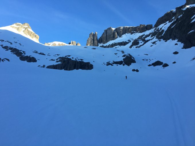 Perfekte Verhältnisse. Start 5:45, Schnee tragend gefroren, gelegentlich rutscht der Neuschnee auf der gefroreren, Saharastaub- bedeckten Schicht ab, bei Erwärmung kritisch zu betrachten. Fussaufstieg zum Gipfel problemlos, die ca. 10 m Kletterstelle im 3. Grad ist exponiert (siehe Bild). Der Kalk ist dort z.T. splittrig und plattig, ggf. Seilsicherung, wer sich unwohl fühlt. Es kann sich dort stauen, ggf. Bei der Abfahrtsplanung berücksichtigen. Abfahrt um 11:15 ab Skidepot, ab P 3003 via Route 270a auf optimal aufgefirnter Schneedecke. Es gibt sicher schlechtere Möglichkeiten, Sonntag Mittag zu verbringen... (Es war einfach genial)