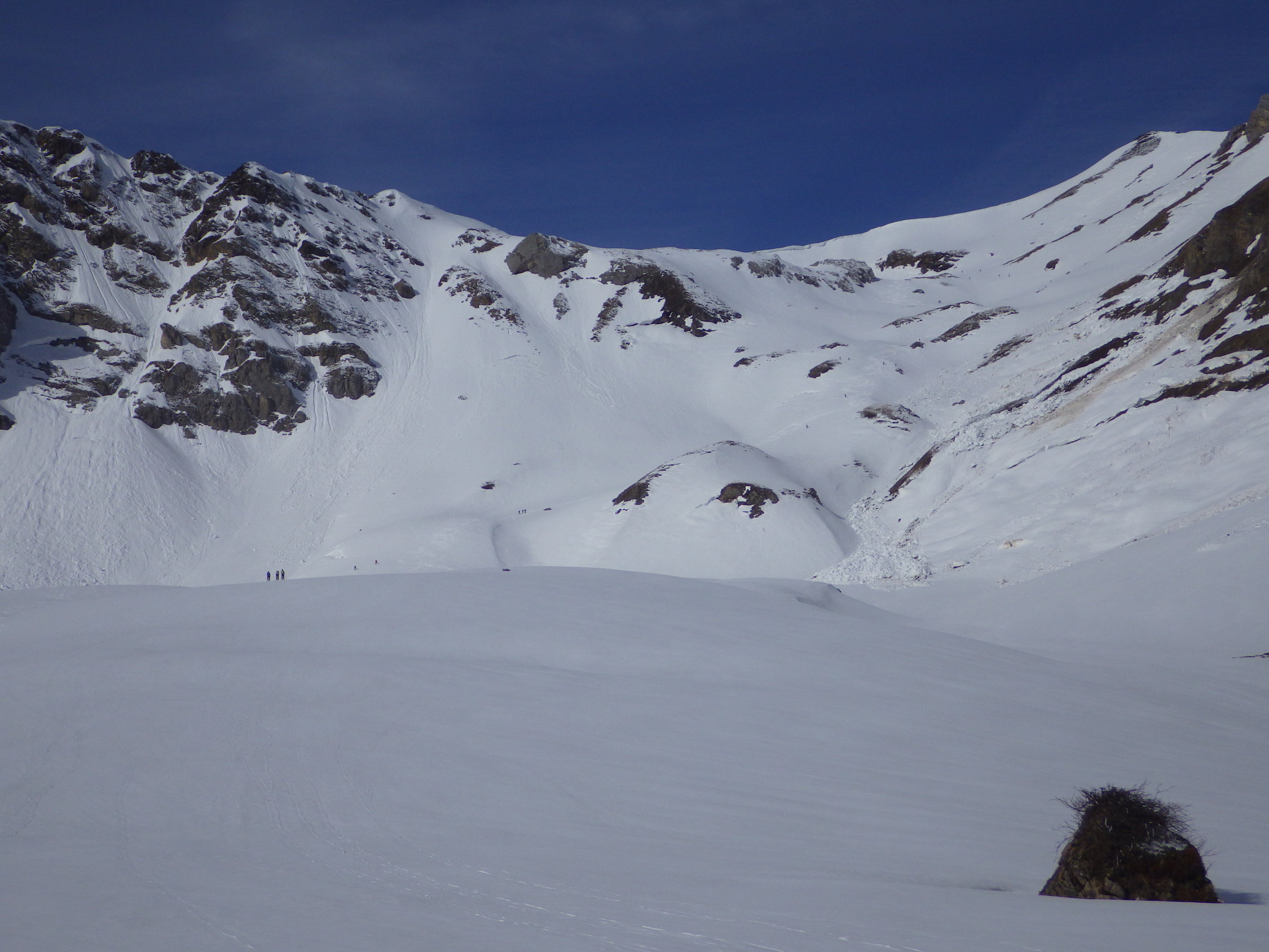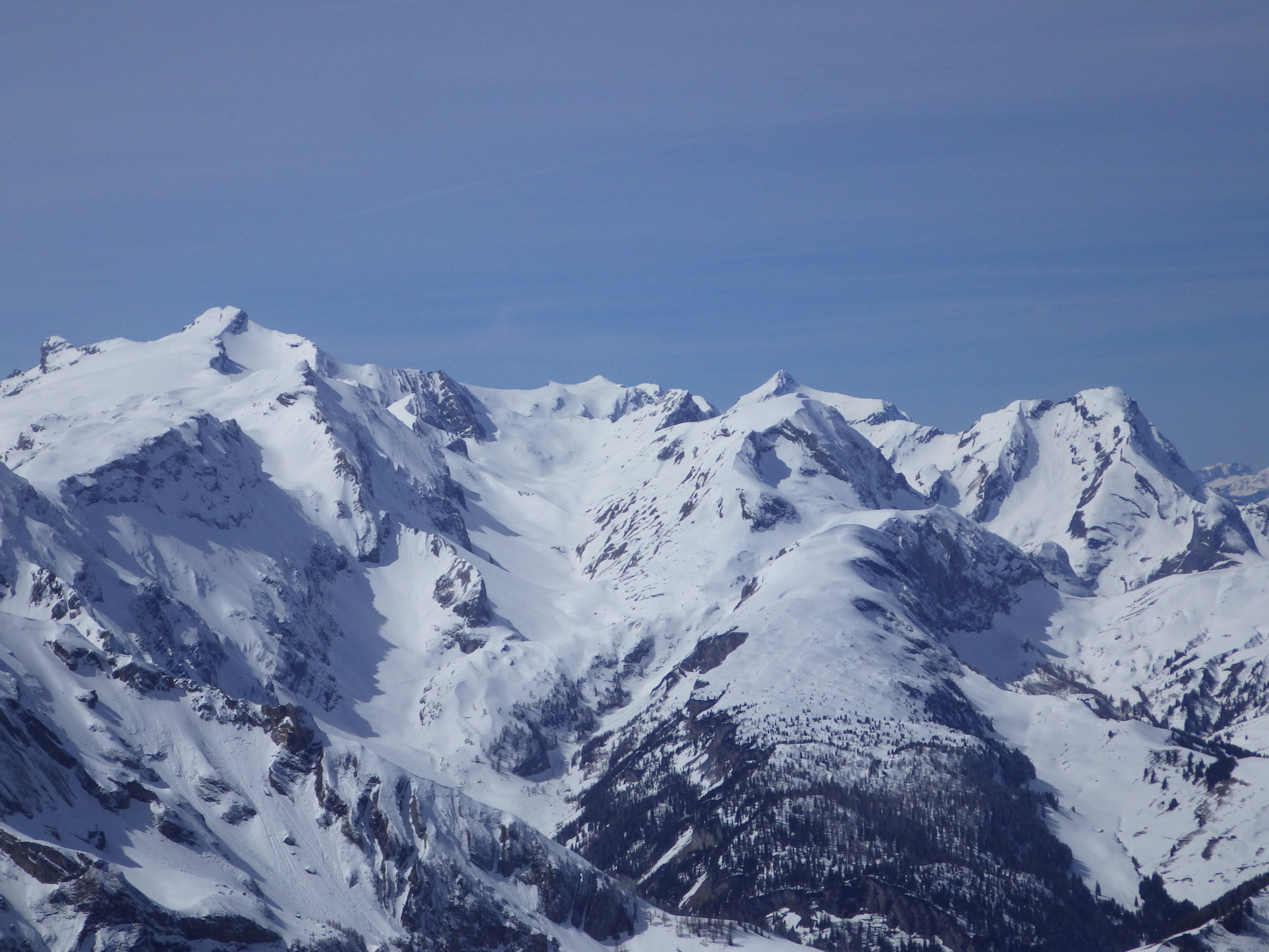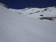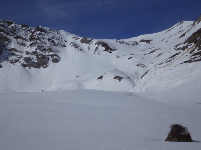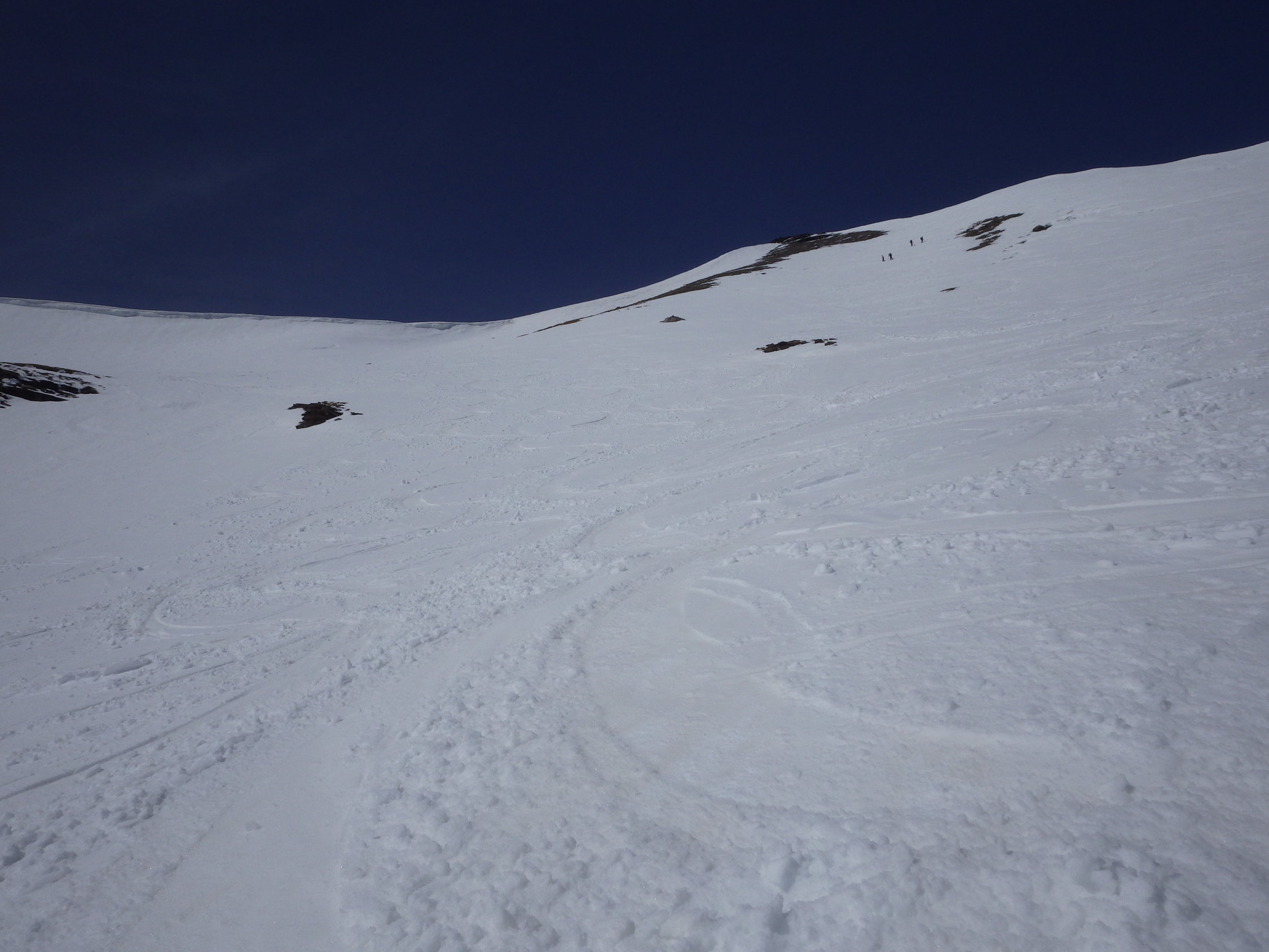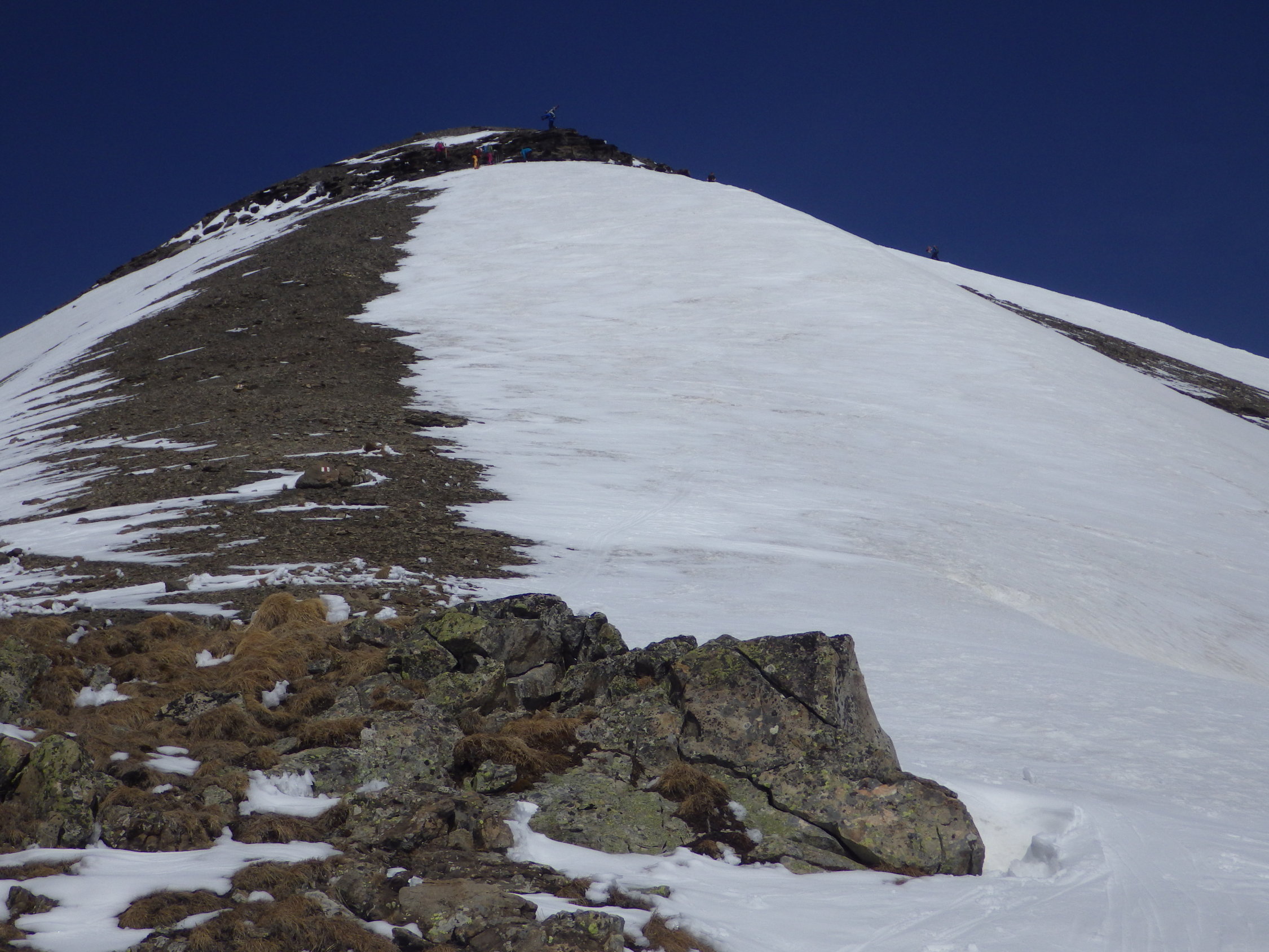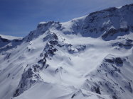 Der Gipfelhang wird zunehmend aper werden (siehe Foto). Es liegt aber noch viel Schnee im Gebiet. Bis zum Betriebsschluss am 01. Mai sollten die Bedingungen gut bleiben sofern es keine extreme Wärmeperiode gibt und die nächtliche Abstrahlung funktioniert.