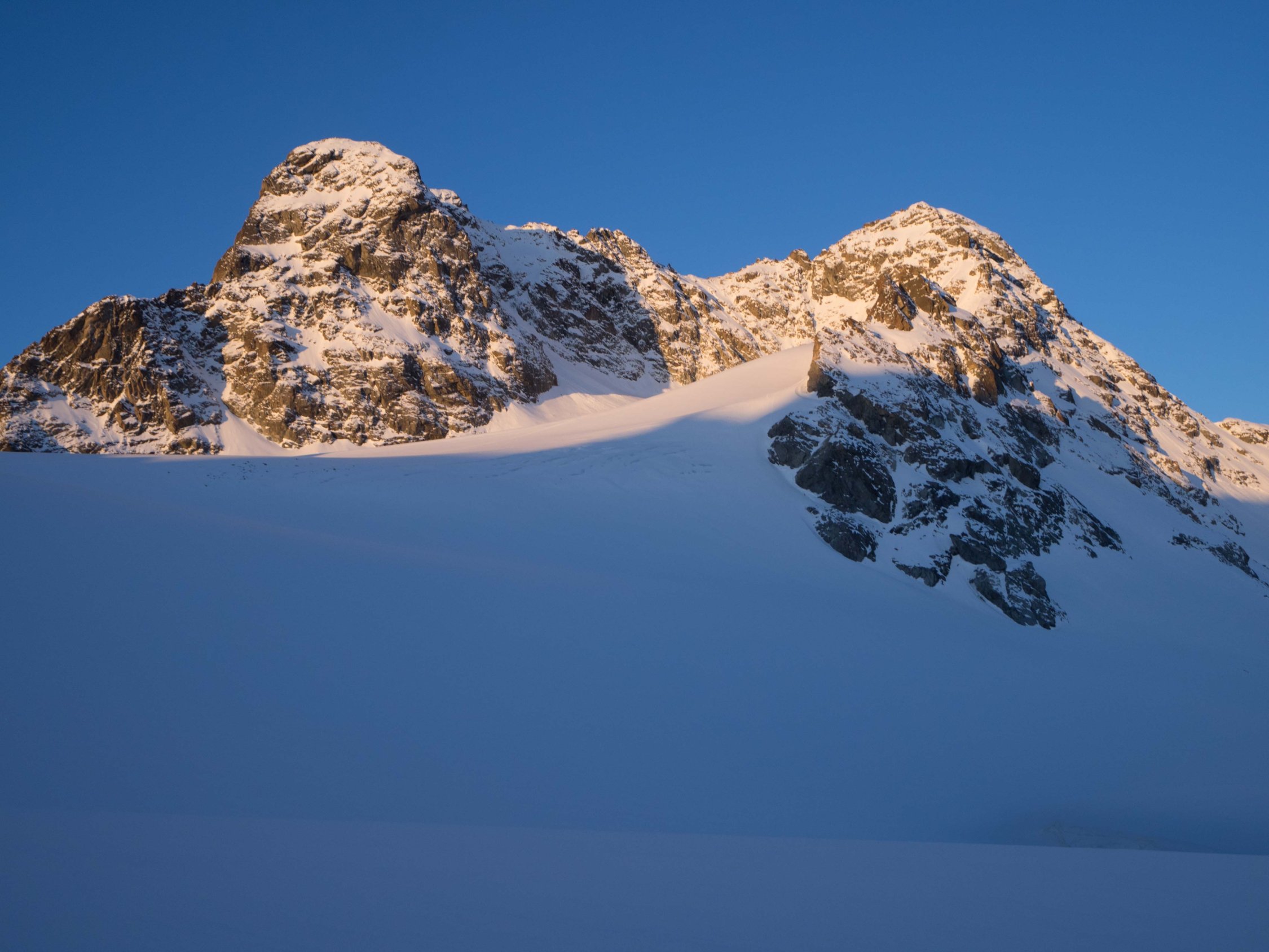 Aufstieg von der Keschhütte auf den Piz Kesch: Gute, tragende Schneedecke bis zum Skidepot. Gipfelflanke zur Zeit einfach zu begehen. Der Neuschnee von Freitag/Samstag hat sich bereits gut gesetzt und verfestigt. Es hat eine gute Trittspur und die Kletterstellen sind alle schneefrei.