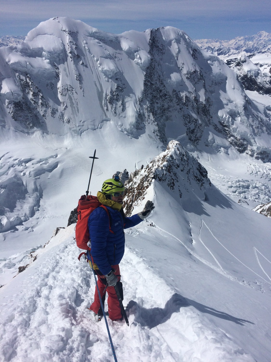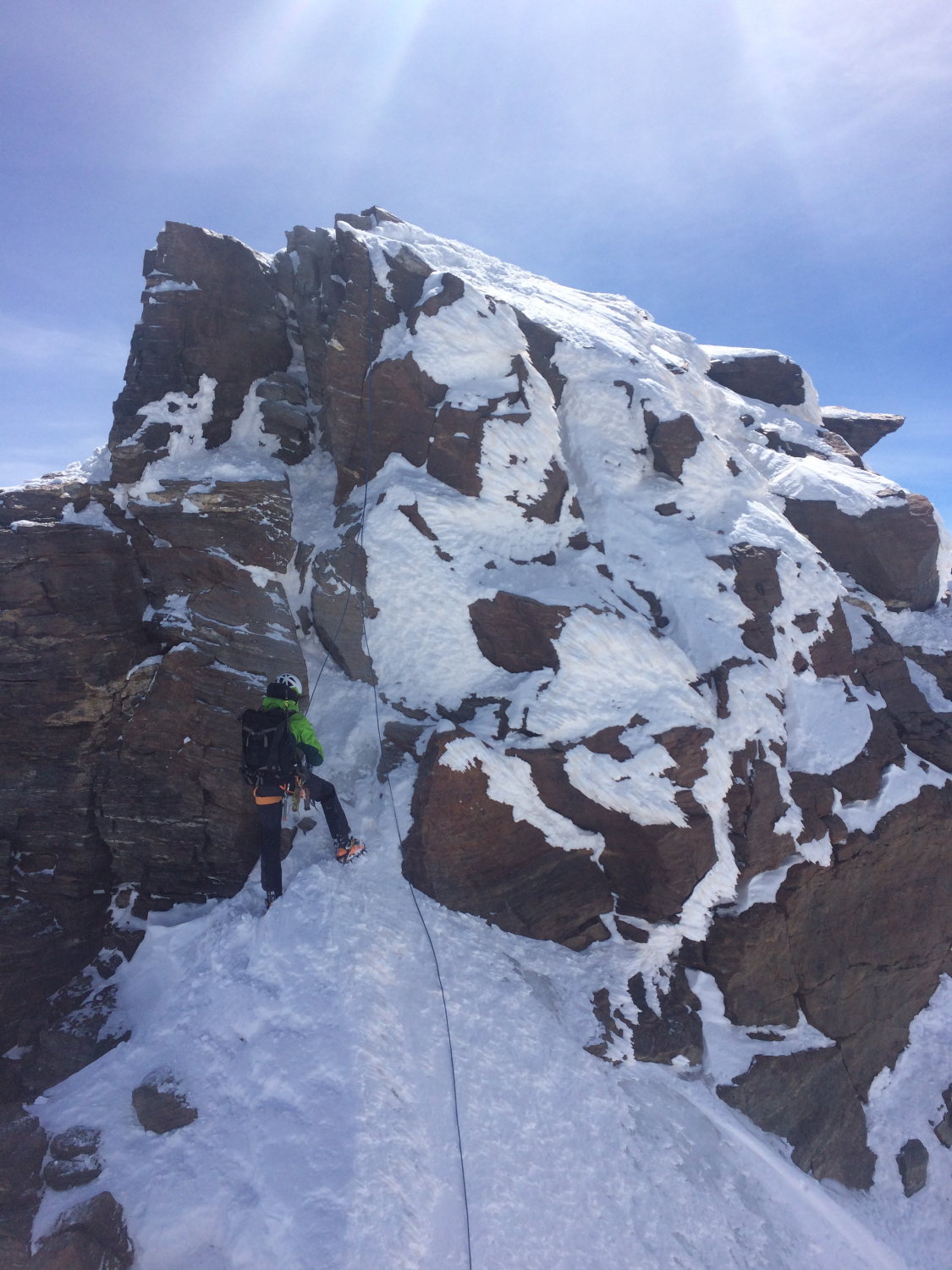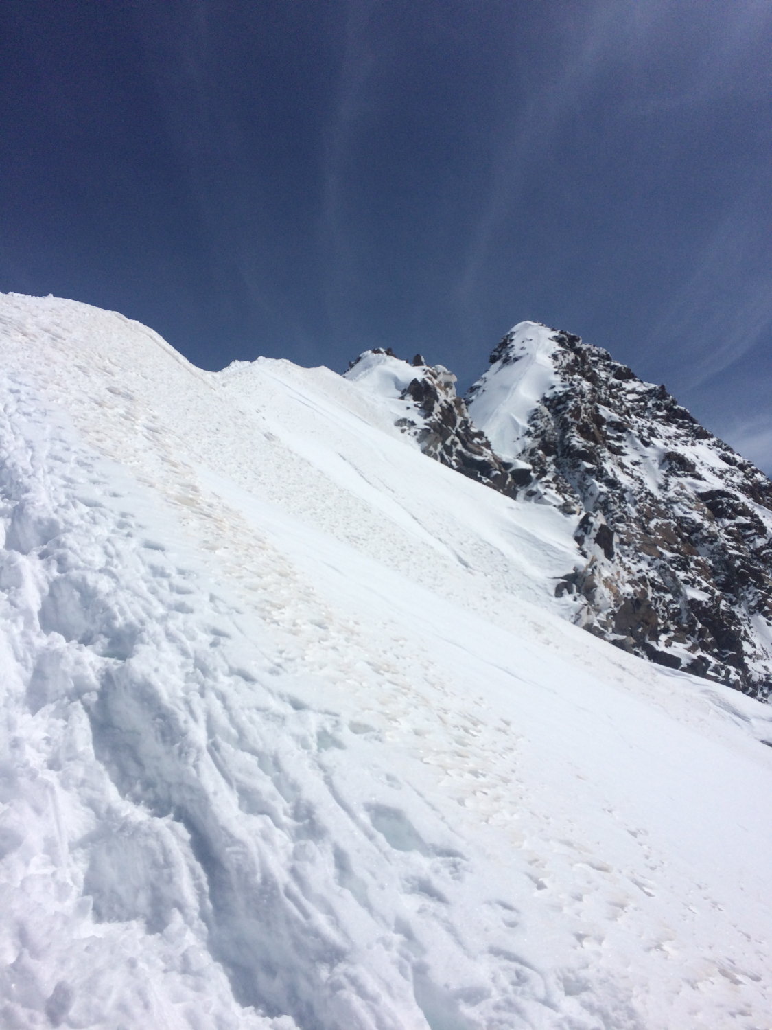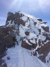 Der Westgrat wies reichlich Neuschnee auf und wurde von 2 Seilschaften vor uns dankenswerterweise neu und recht mühsam gespurt. Auf dem Westgrat selbst kehrten weitere Seilschaften um, so dass wir kurz nach zwei jungen Franzosen alleine am Gipfel waren und nach uns nur noch eine 3er Seilschaft kam. Abstieg problemlos über den Grat zurück zum Skidepot am Sattel.