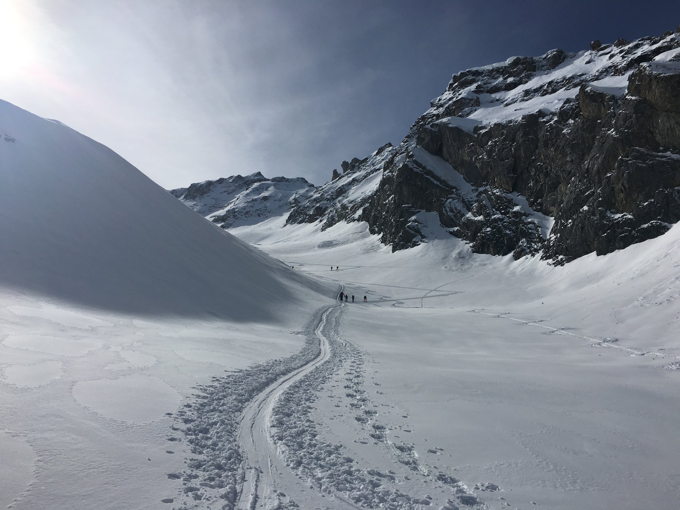 Spur sehr gut, am Frühstücksplatz Skis kurz getragen. Mit gutem Trittschnee problemlos.