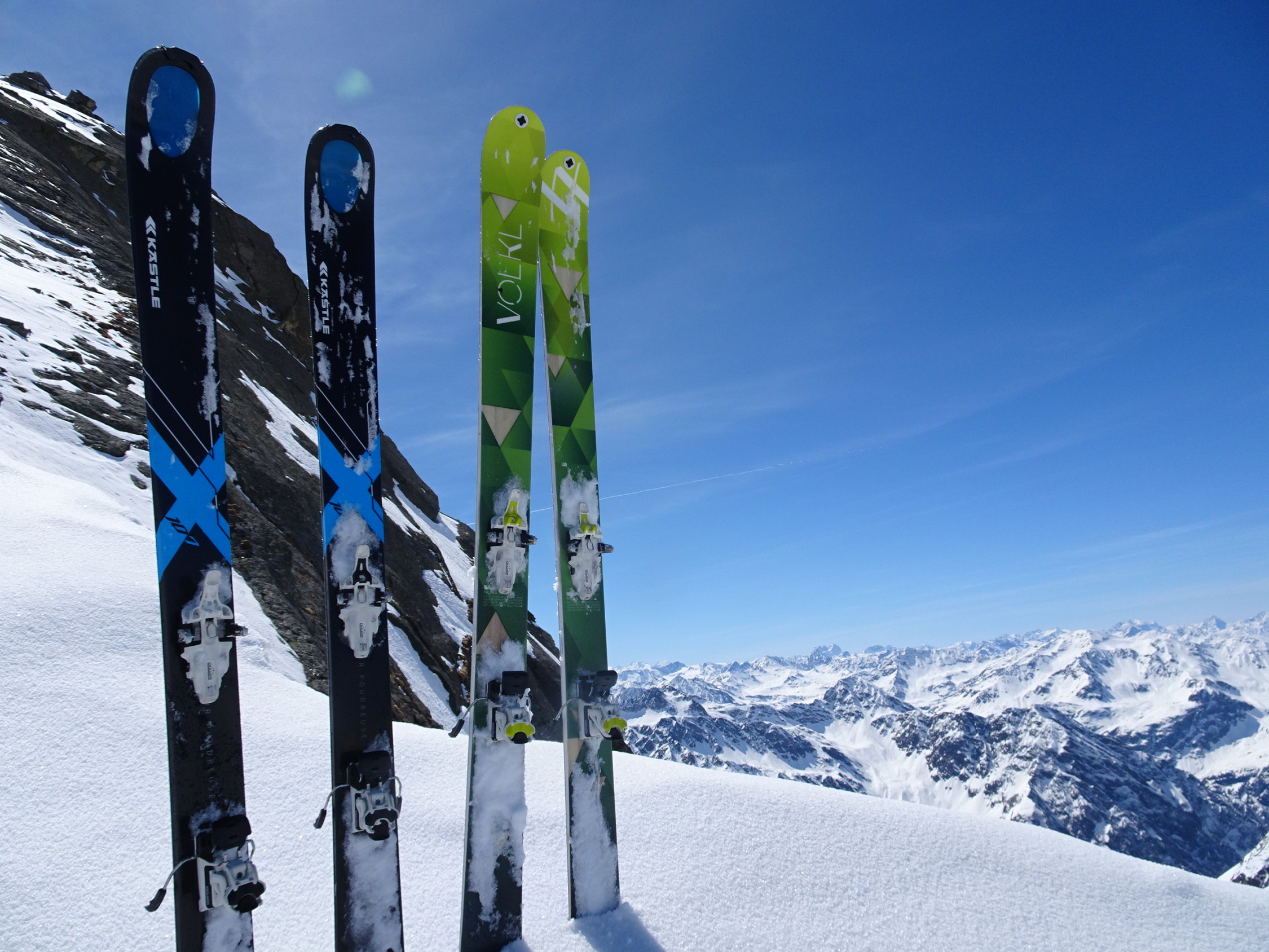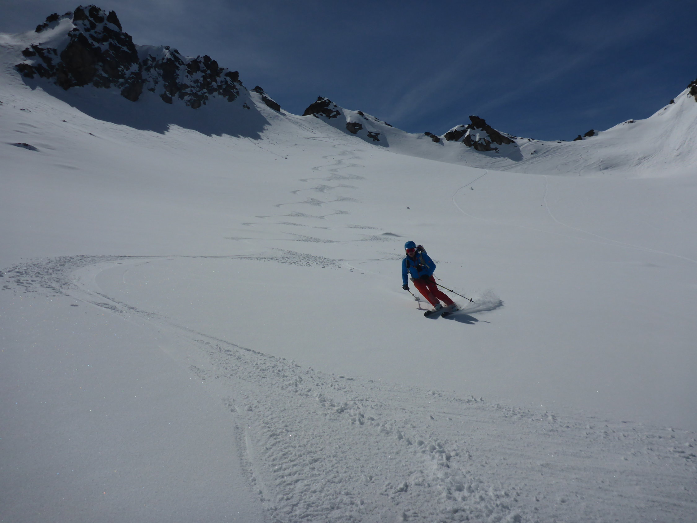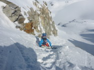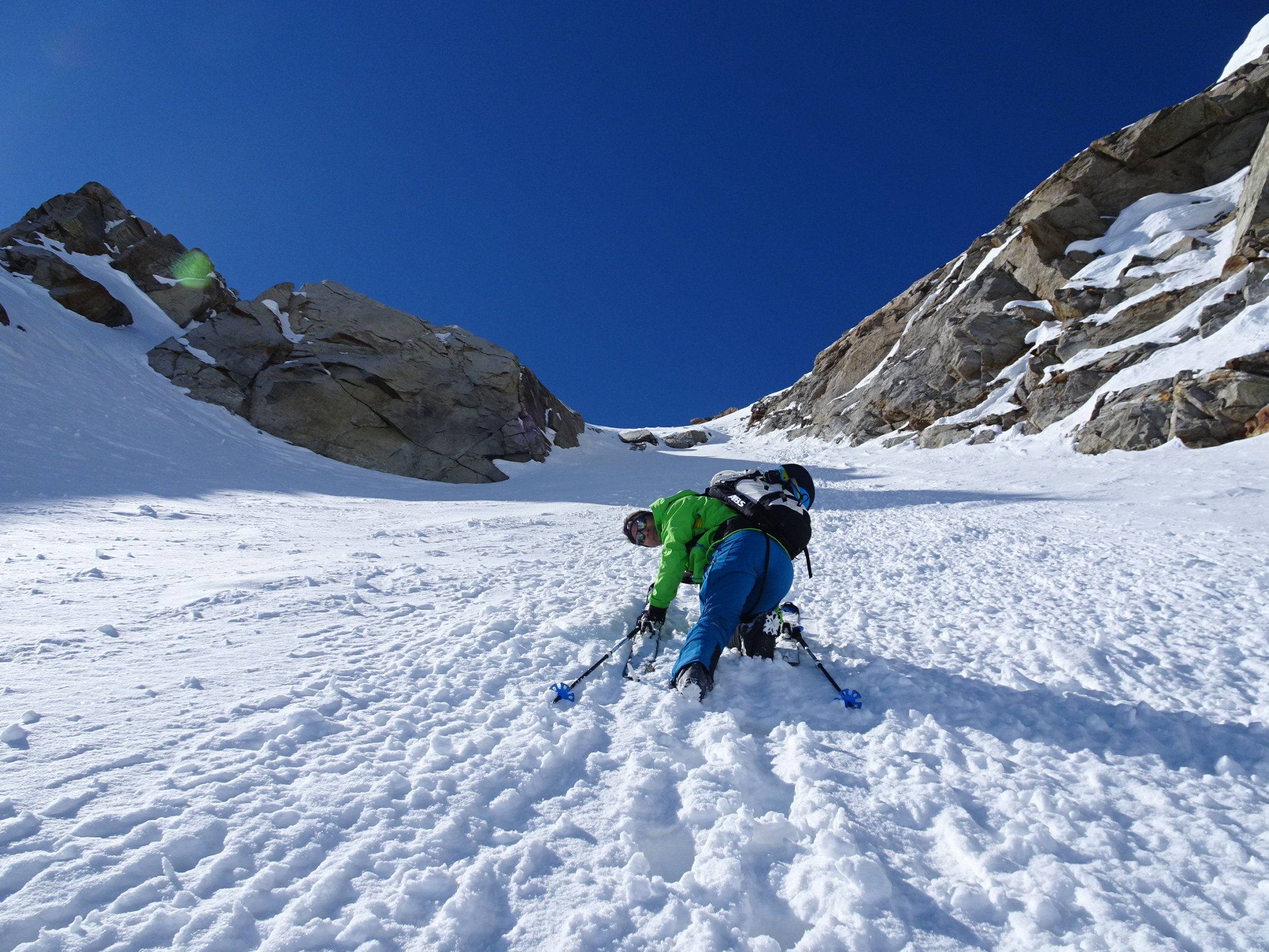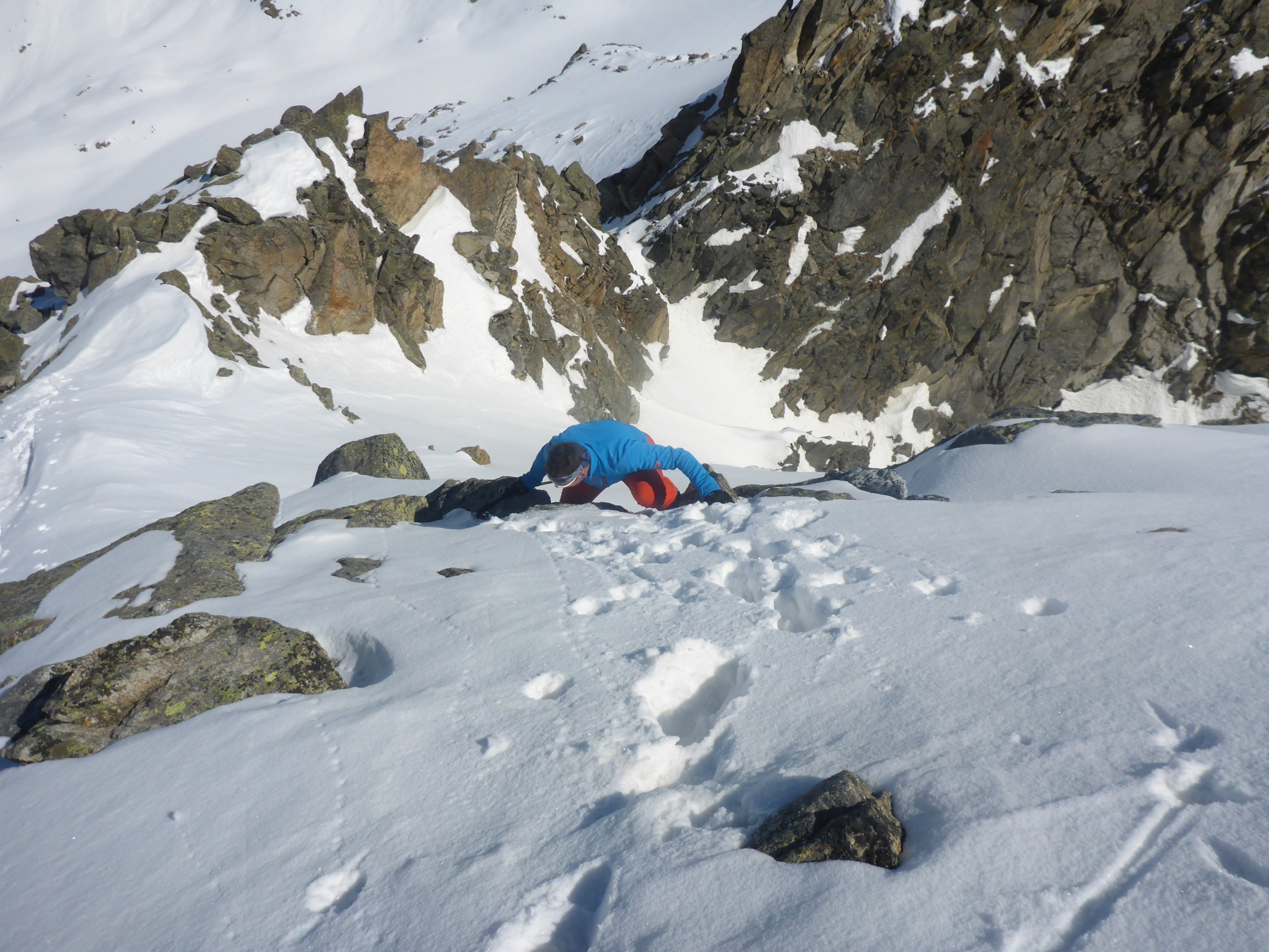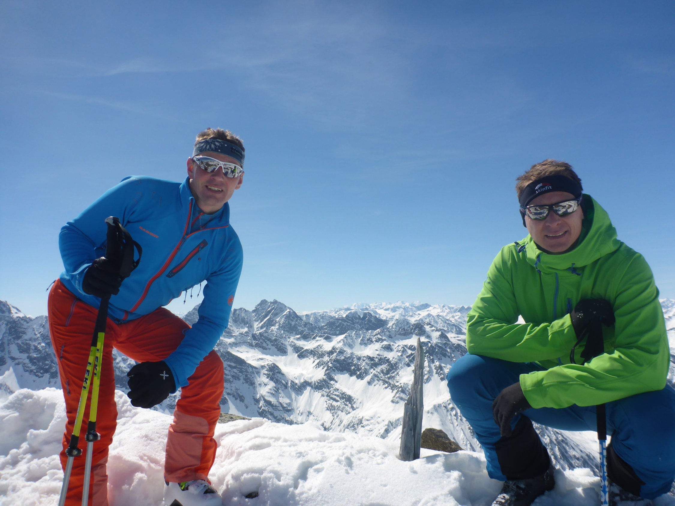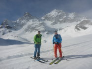War nur zu Fuß machbar (Harscheisen zuhaus) - hochstapfen mit Ski in der Hand. Oben dann auf dem Plateau wieder Ski anlegen und hochfellen zum Skidepot. Dann bis Gipfel in einfacher Kletterei gut machbar. Waren heute als erste oben. Abfahrt Seehorn Steilhang durch Sprung über kleinen Felß möglich. Dann unten Seegletscher schön zu fahrende Pulverauflage, dann begann es gerade aufzufirnen. Weiterer Aufstieg zur Schweizer Lücke. Abfahrt Schweizer Gletscher bei Pulverschneeauflage - weiters über Kromergletscher schon aufgesulzt.