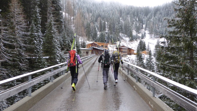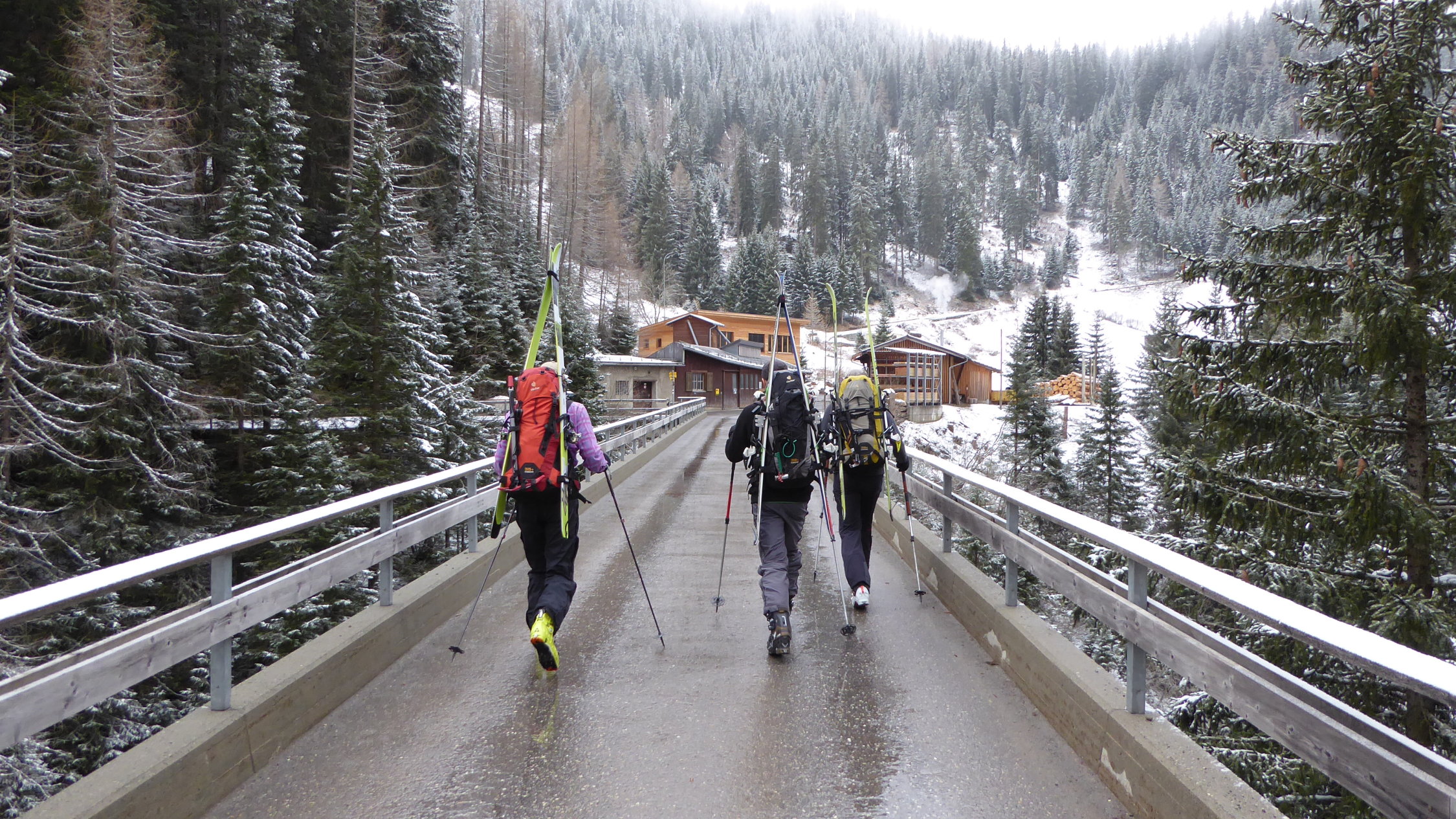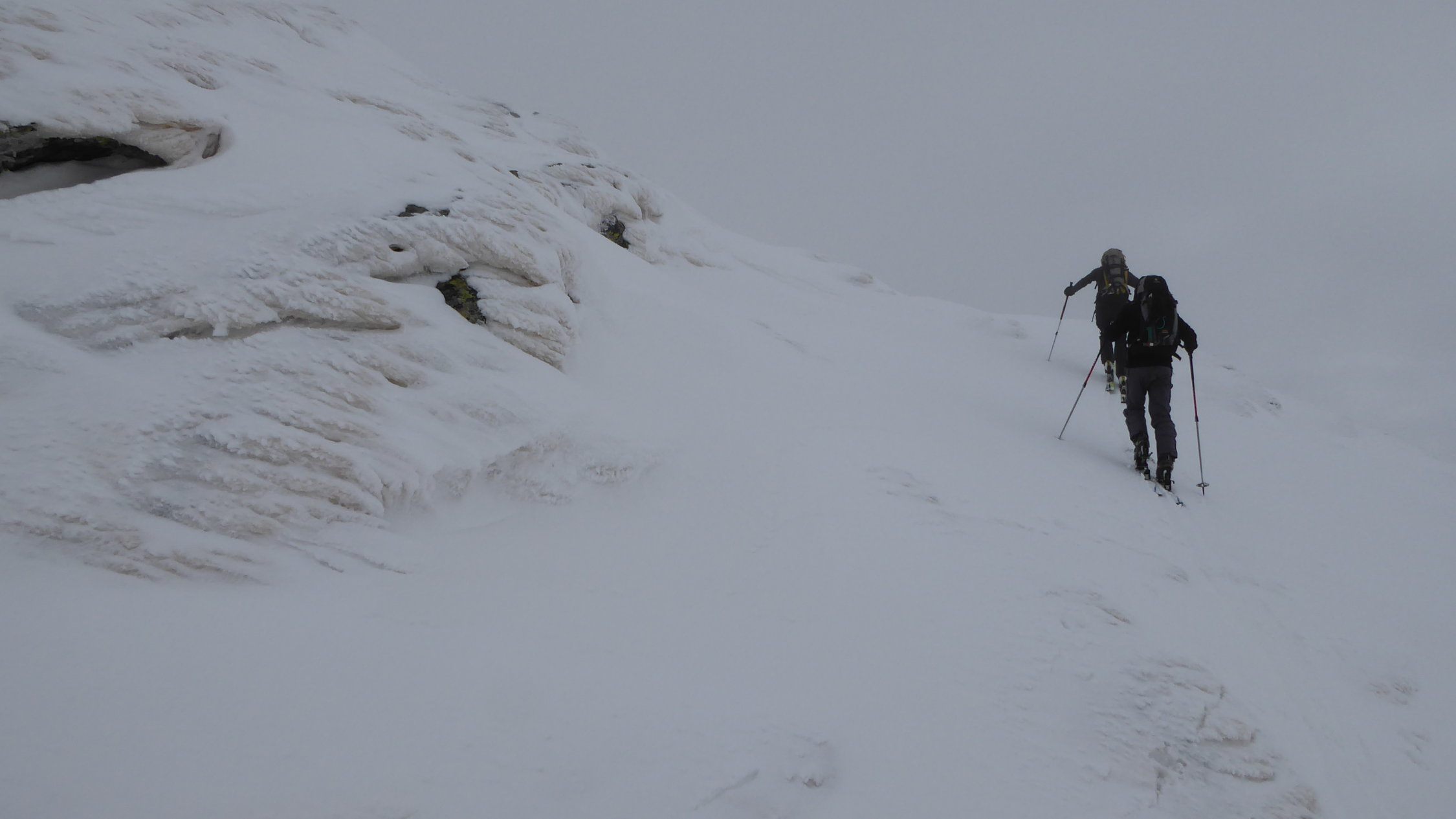 Zuerst müssen die Ski ca. 200 hm auf der Alpstrasse getragen werden,danach geht es mit dem Schnee vom Vortag gerade so. Schnee stark durchfeuchtet.