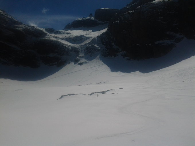 Vom Abzweiger Lauchernstock - Ruchstock Harscheisen angenehm, bis dort ging es ohne. Aufstieg mit Harscheisen bis zum grossen Stein knapp 100 hm unter der Nordsattel. Dort auf Steigeisen gewechselt. Aufstieg mit Steigeisen problemlos, sowohl bis in den Nordsattel als auch über die Rampe aufs Gipfelplateau. Gipfelplateau nicht mehr mit durchgehender Schneedecke. Abfahrt Richtung Nordsattel nicht durchgehend möglich, darunter bis weit in den Nachmittag hart (da lange im Schatten) deshalb Abfahrt über die Nordostseite. Auch dort kurze Tragpassage beim Seil, ansonsten gute Verhältnisse (oberhalb Felsstufe stellenweise noch pulvrig, unterhalb schön zu fahrender Frühlingsschnee). Traverse zur Bannalper Schonegg geht gerade noch mit Ski, für direkte Abfahrt ab Schonegg müssen Ski jedoch ein Stück runter getragen werden.