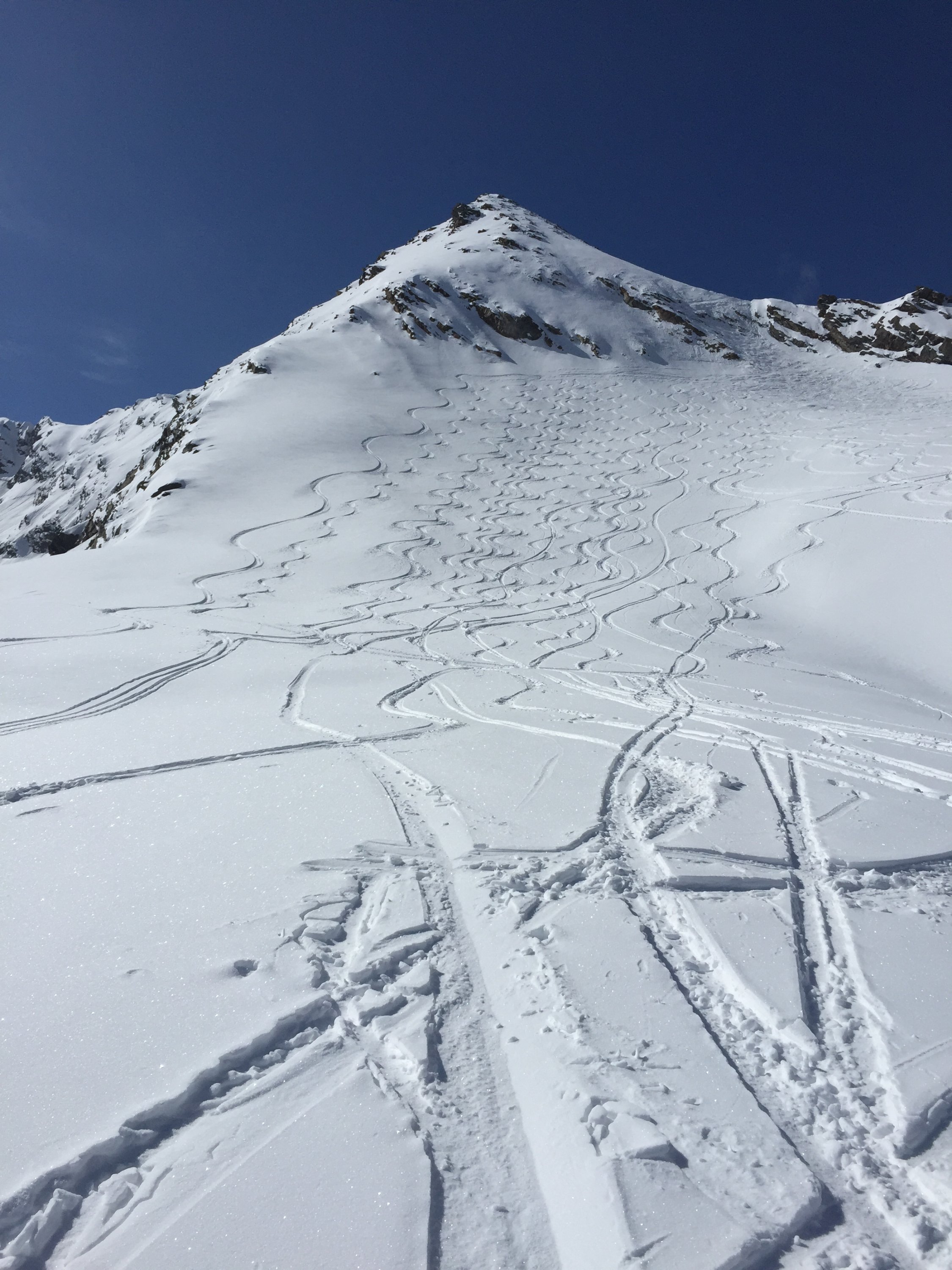 Die Gipfeflanke ist für eine Befahrung im obersten Drittel nicht zu empfehlen, zu viele Steine lassen das Manöver der Durchquerung eines Minenfeldes gleichen. Die unteren 2 Drittel der Gipfelflanke sind gut fahrbar. Der Grat im Aufstieg ist derzeit auch ohne Steigeisen gut zu machen.