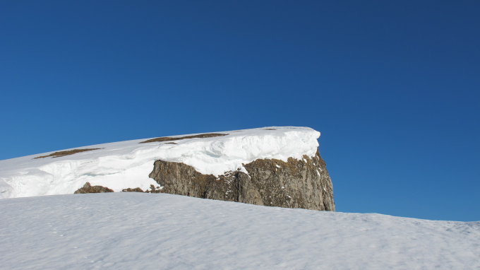 Tja das war heute überraschend gut. Von der Auenhütte kann man gerade noch mit den Skiern über die Piste (von unten links) aufsteigen. Der Felsdurchschlupf war hart gefroeren, aber es waren Stapfen im Schnee. Bei der Abfahrt nach Süden fehlt im Steilstück der Schnee, dann super. Gerade aus bis zur Schneegrenze abgefahren, dann weiter bei gutem Firn oder Sommerschnee zum Hählekopf. Besser ist es nach dem Süddurchschlupf direkt hinunter zu fahren, anstatt die schönsten Firnhänge mit Queren zu verschenken. Die Felsen der Südwand sind schon trocken und laden zum Klettern ein.