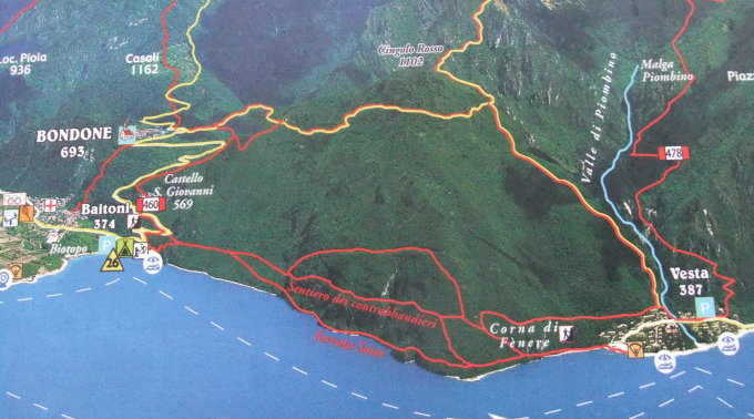Rückweg über geschichtsträchtigen „Sentiero dei Contrabbandieri“ mit der Felsecke "Punto di Confine". Hier verlief bis 1. Weltkrieg die Grenze Italiens zu Österreich-Ungarn. Im Felsen ist groß die Zahl „1753“ eingeritzt, wo dort die Grenze nach dem Abkommen von Rovereto im Jahr 1752 zwischen dem Österreichischen Reich und der Republik Venetien begann. Am 24.5.1915 überschritt die 6. Italienische Division von Judikarien auf diesem Pfad die Grenze und begann ihren Einmarsch in Südtirol.