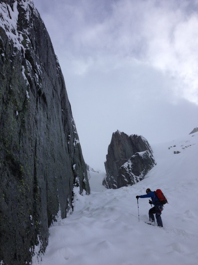 Im Aufstieg durch das Couli hat es immer wieder harte Schneeklötze unter den ca. 25cm Neuschnee. Die Route 750a geht ab Pt. 2120 direkt hoch über Felsplatten, dieser Aufstieg ist im Moment nicht möglich. Der ganze Schnee ist von den Granitplatten abgerutscht. Wird sind daher, mit unzähligen Spitzkehren durch das Couli weiter hochgestiegen.