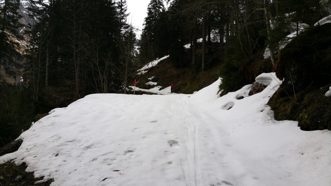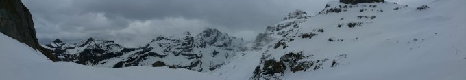 Strasse bis Griesalp befahrbar und schneefrei. Ab Griesalp haben wir die Skis noch eine halbe Stunde getragen, bis wir ab rund 1600, oberhalb des Lärchenbodens, auf eine mehr oder weniger durchgehende Schneedecke stiessen. Das Wetter hat gehalten: ständig gute Sicht, nur gelegentlich ein wenig Regen und sogar den einen oder anderen Sonnenstrahl eingefangen. Ab Dündenegg begann es zu ziehen und vom Sattel bis zum Gipfel waren wir im heftigen Südwestwind. Die Gipfelrast hielten wir kurz. Abfahrt um 12.00. Von 2500m bis 2100m schön fahrbarer "Sulz-Pulver", darüber Deckel, darunter Faulschnee.