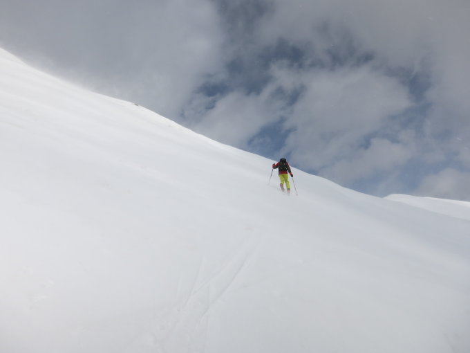 Leichter Regen auf der Engstligenalp beim Start. Spuren waren nicht notwendig da der ganze Hang überall recht hart und griffig war. Ab Mittelteil dann teils starke Böen. Hat mich 2 mal fast aus den Schuhen gehauen. Nicht über den Col sondern besser über den Gipfelhang auf den Gipfel. Abfahrt gut. Oben hart und griffig, dann leichte Pulverauflage, dann Bremsschnee über ca. 100 hm und dann schöner sulz. War heute ne gute Alternative zum stürmischen Wildstrubel.