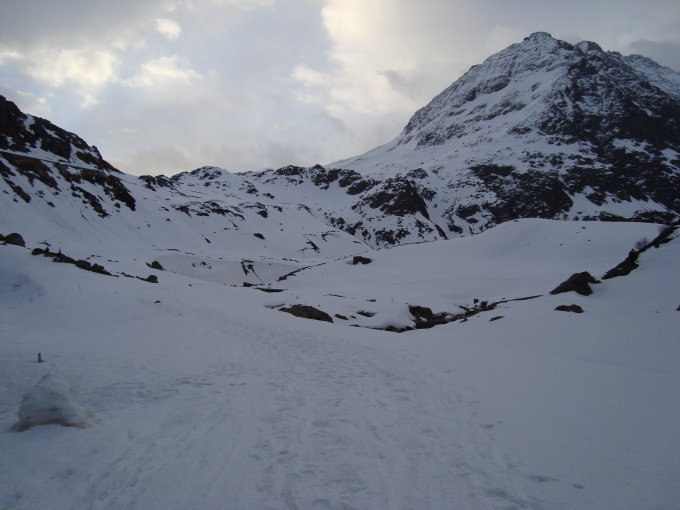 Bei unserem Start ca.6.30Uhr am Hotel Steingletscher ein paar Tropfen von oben, welche dann in Schnee übergingen, auch der Nebel sorgte für diffuse Lichtverhältnisse. Kurz vor der Traverse unterhalb der Felsen war dann kaum noch was zu sehen.