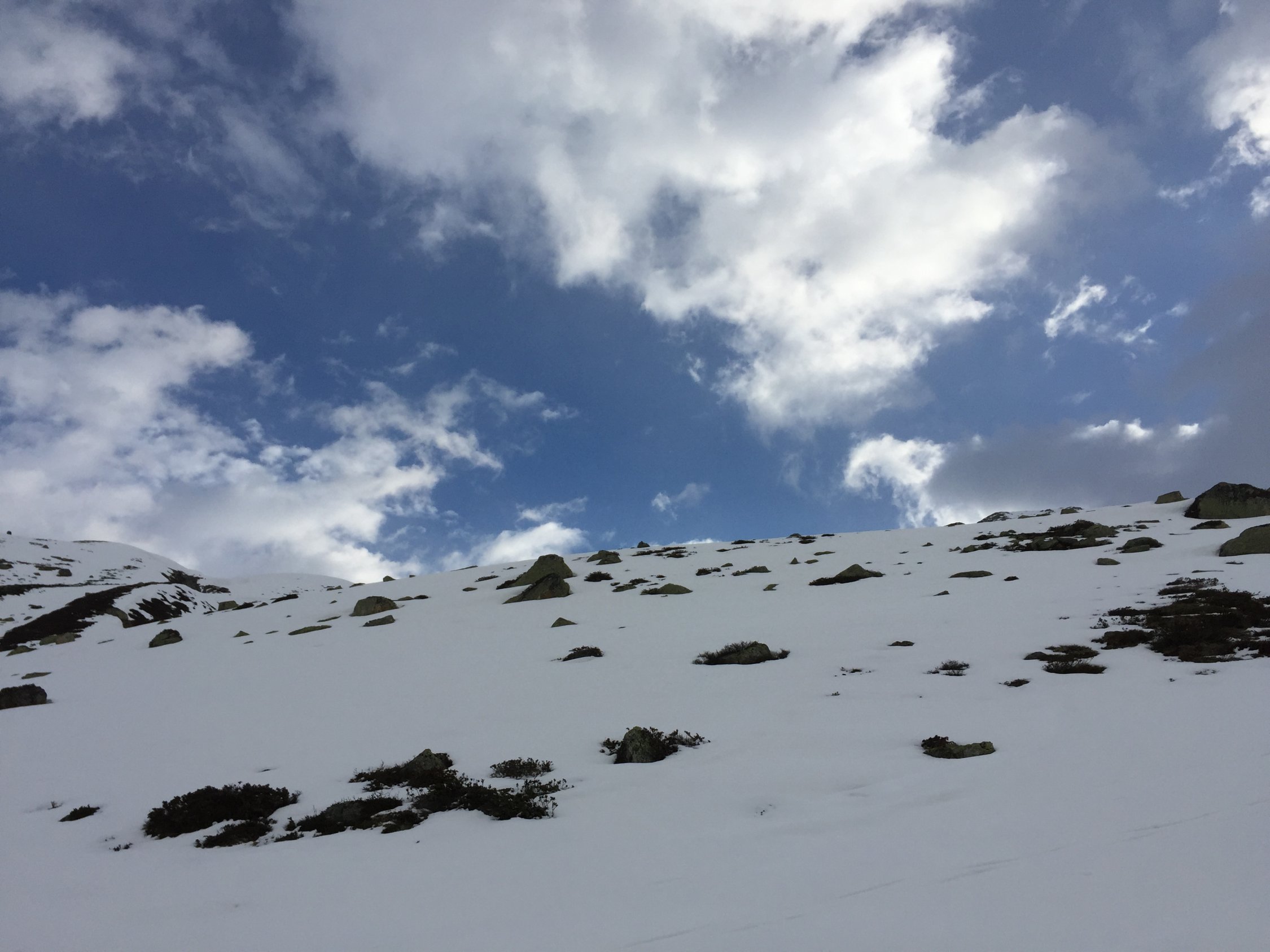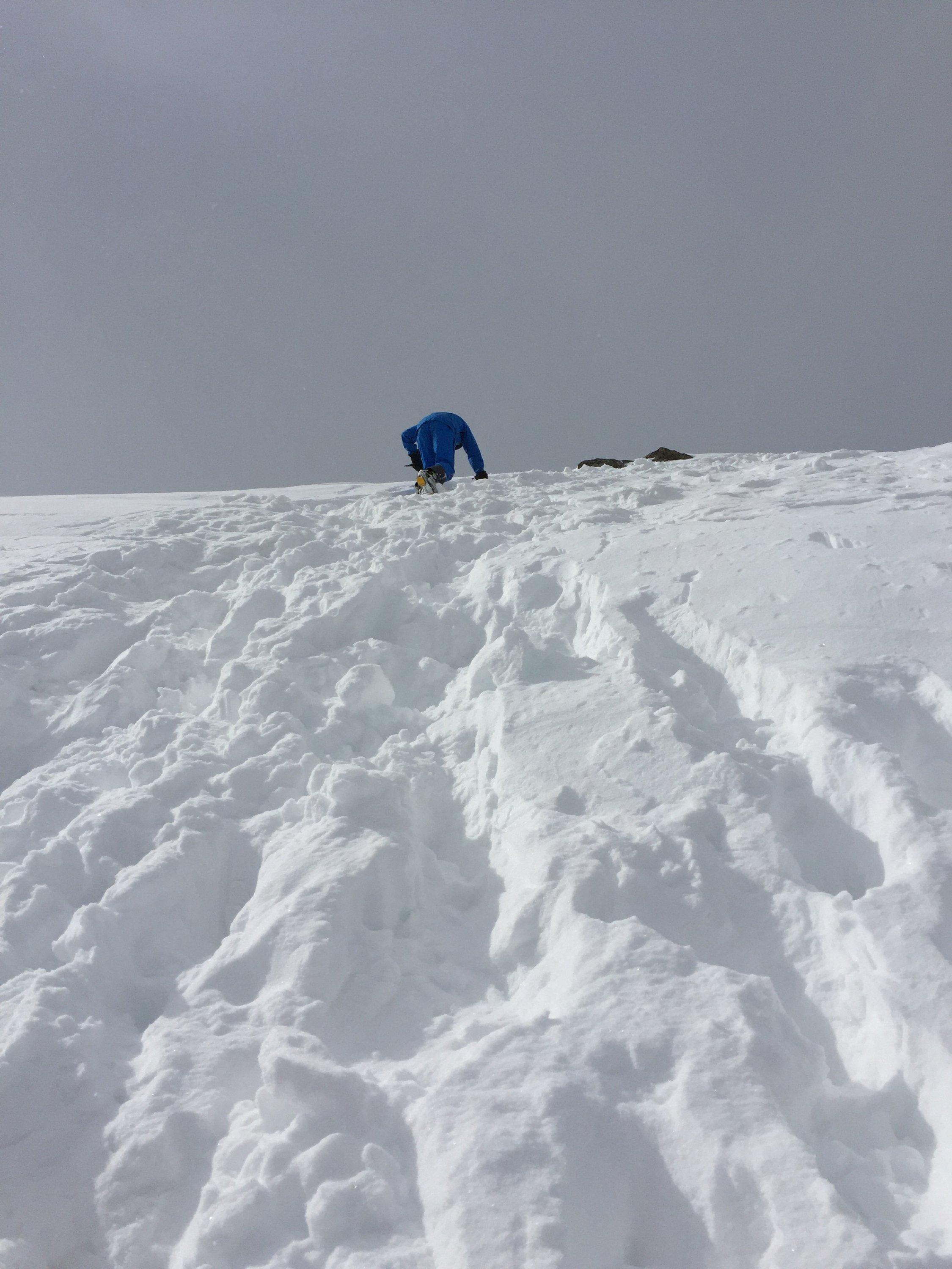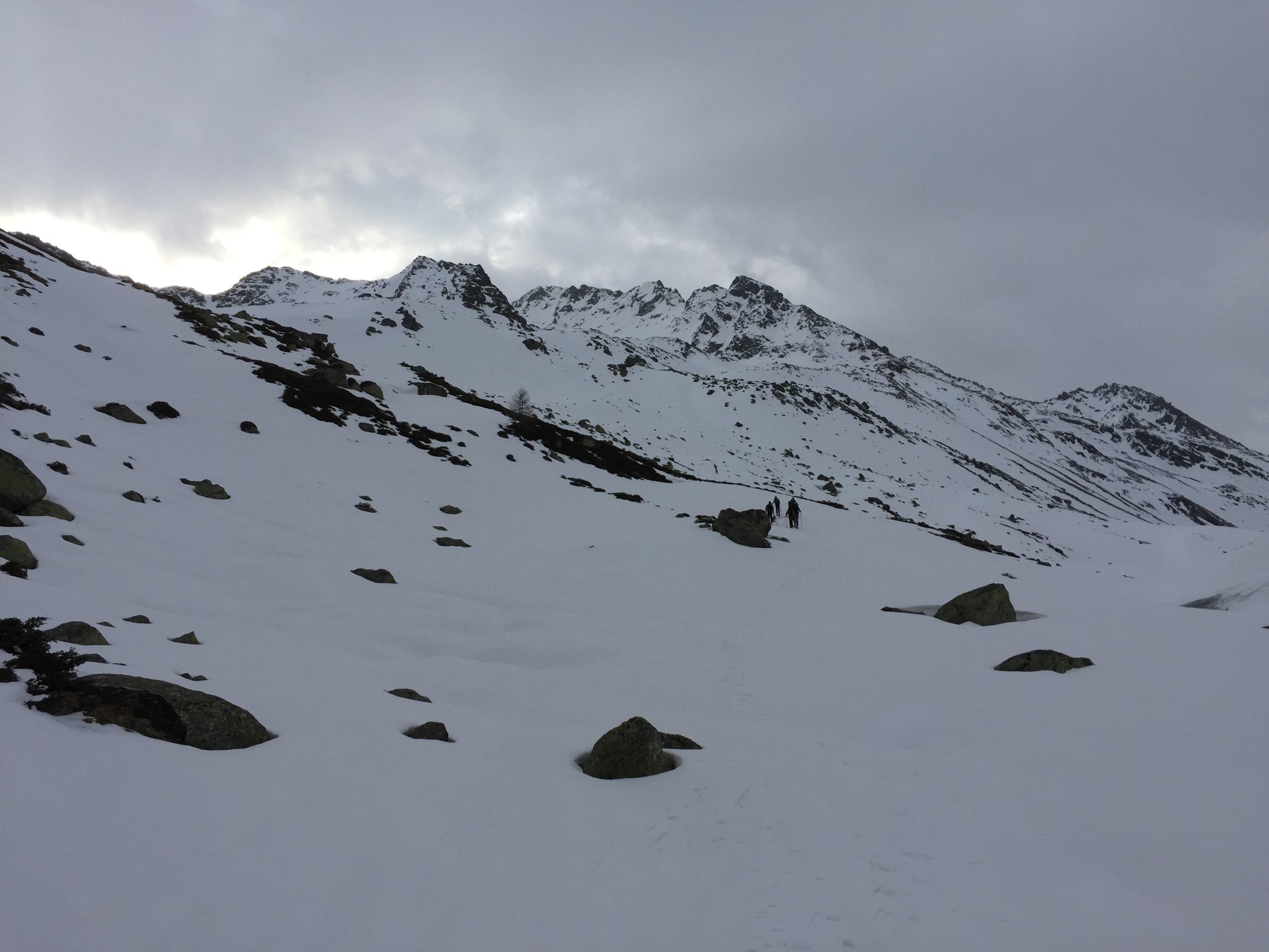 Die Passstrasse ist geräumt, aber die Barriere ist zu. Also mit geschulterten Ski bis vor das obere Wägerhus. Dann genug Schnee. Unten etwas weich aber tragend, weiter oben, ab ca. 2600m gut durchgefrohren. Die Spur ab Winterlücke quer den Hang hoch direkt zum Skidepot rutscht ab und ist kräfteraubend aber es ging. Unten durch vermutlich besser. Ab Skidepot mit Steigeisen hoch, einige gingen auch ohne, muss jeder selber entscheiden. Gipfelgrat gut begehbar bis zum Gipfel.