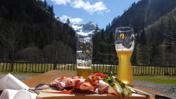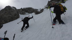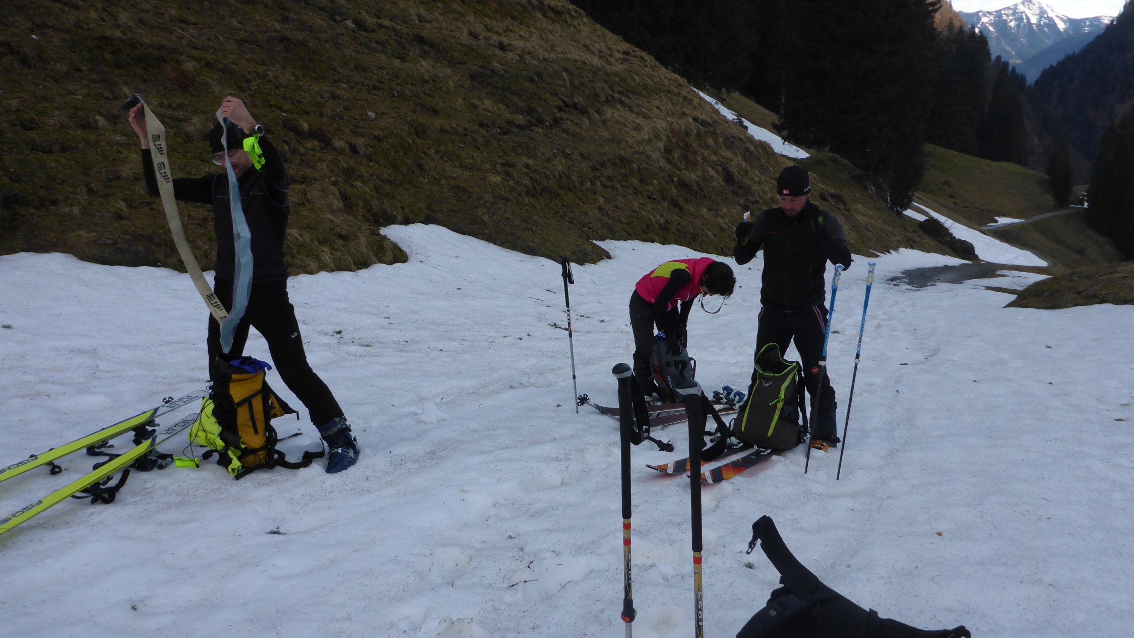 Mit dem Rad kann man fast bis zur Pointhütte fahren. Der Schnee ist ab etwa 1350m durchgängig mit Ski begehbar. Es hatte 2 Tage zuvor etwa 20 cm geschneit und aufgrund der Temperatur war der Schnee oben in der Gamswanne sehr weich und schwer. Aber noch fahrbar. Die Verbindung zum Untergrund ist überwiegend sehr gut. Die direkte Abfahrt aus der Gamswanne durch die Rinne ist gut fahrbar, doch der Übergang ist bereits stark ausgeapert. Die Abfahrt ging trotz warmen Temperaturen recht gut, obwohl der Schnee ziemlich gebremst hat. Also Wachs nicht vergessen!