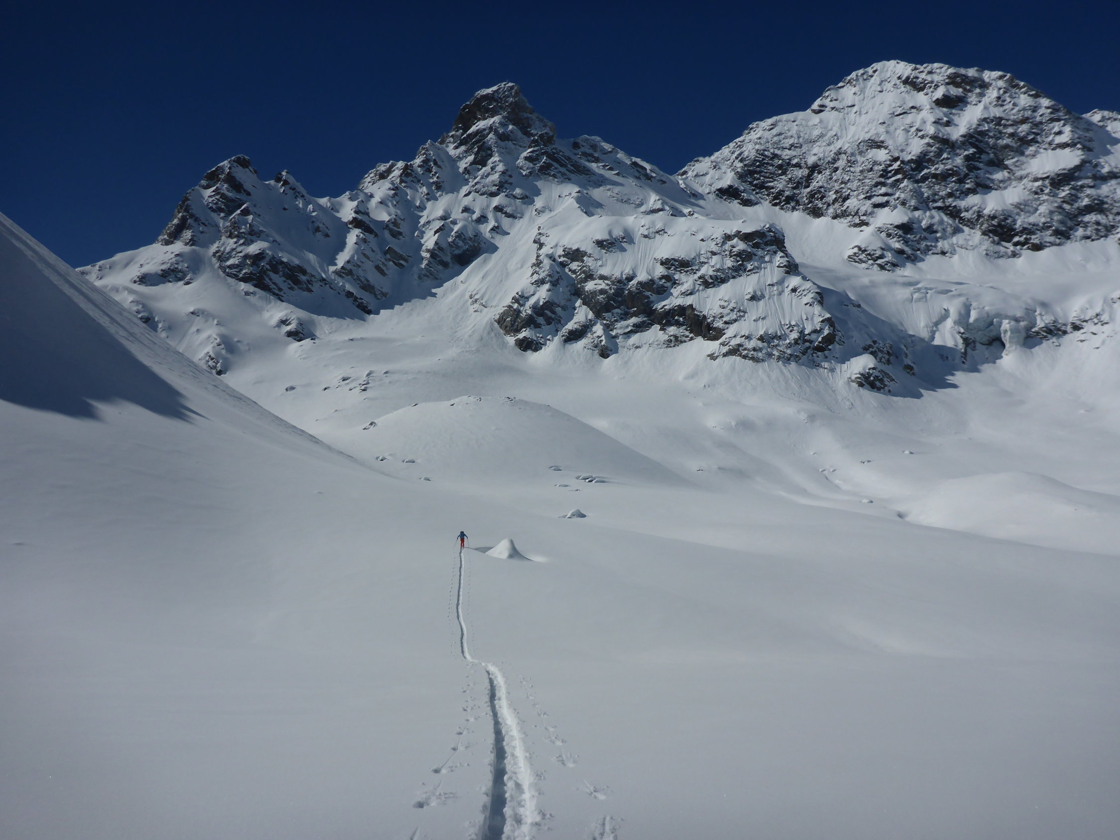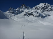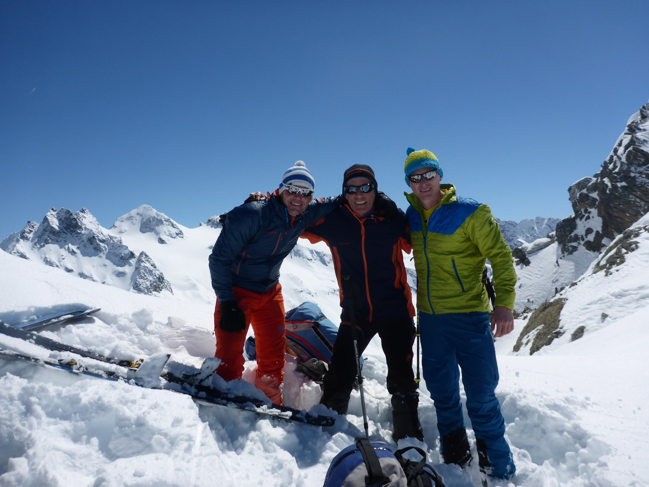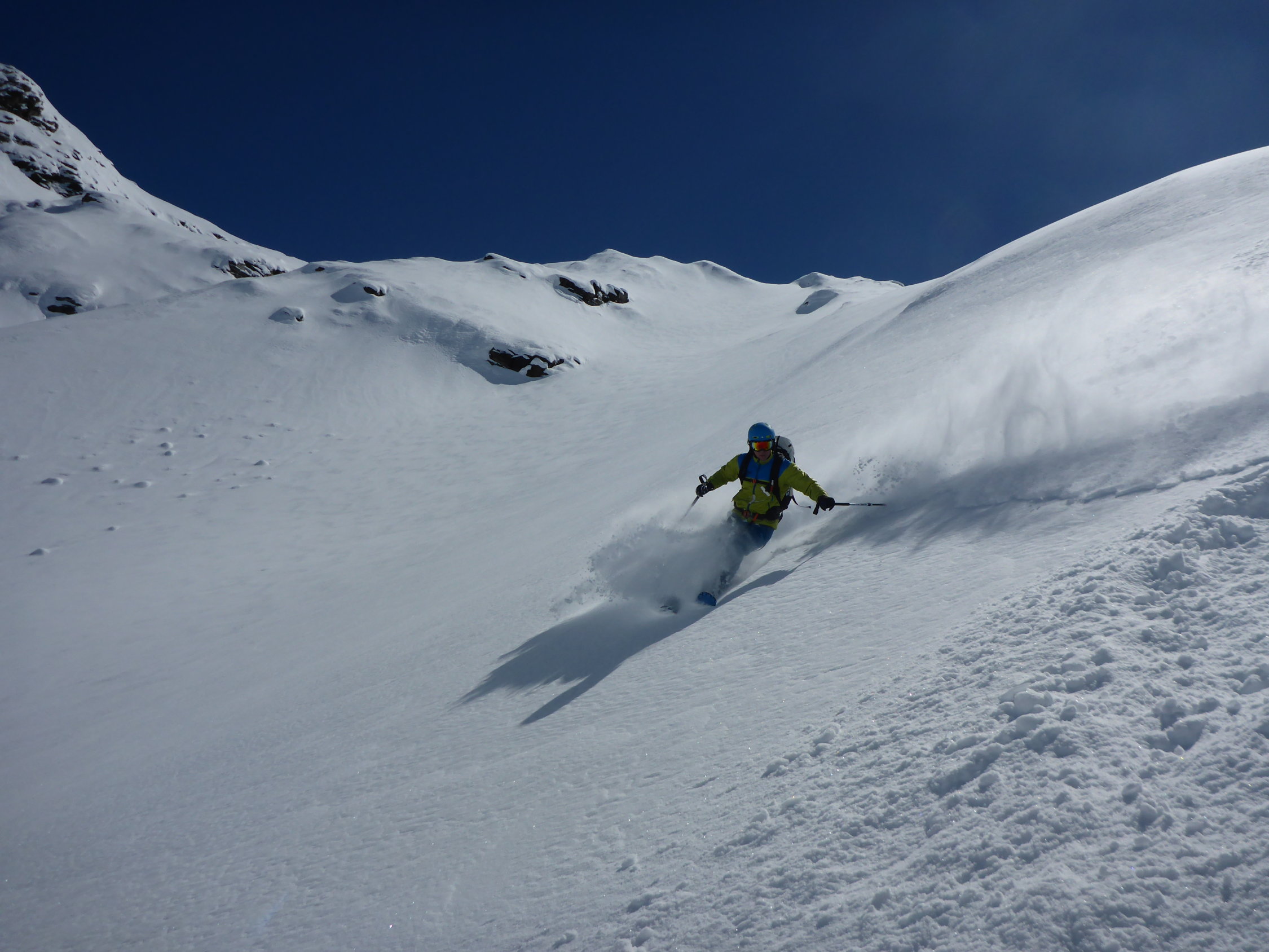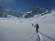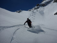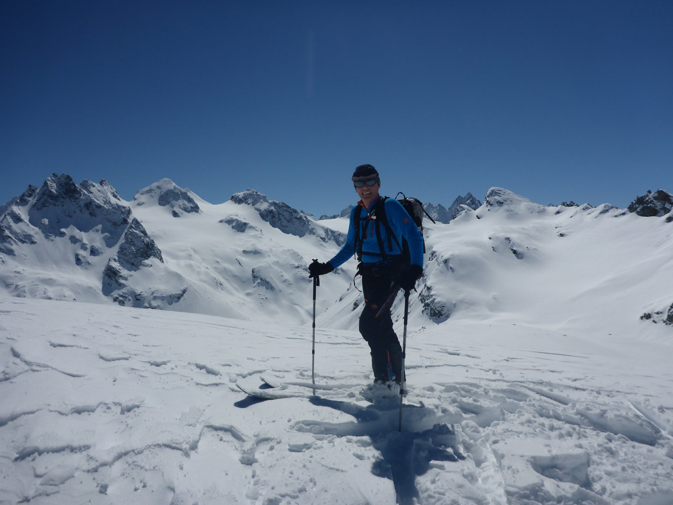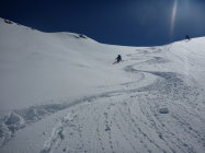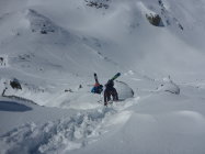 Ab Litzner Sattel noch etwas mit Ski hoch dann Ski auf den Rucksack und "hochwühlen". Gingen nicht bis an den Gipfel sonder in die Scharte rechts vor dem Gipfel da es einfach zu viel Schnee hatte - hier oben gut 50cm Pulver vom feinsten. Abfahrt ein Traum über die breite Rinne.