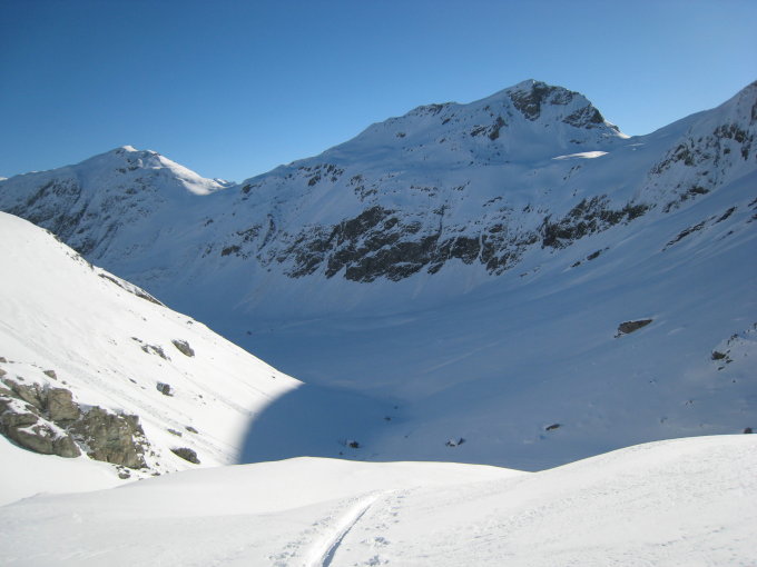 Im Vergleich zu gestern (Eintrag Leama) war es schon ein wenig bescheidener. Unten hart gefroren, ab 2400 dann je nach Exposition pulvrig bzw. harsch- und windgedeckelter Pulver, nicht so nett in der Abfahrt. Die 100Hm hoch zum Juferjoch windgepresst. Generell, die Spur war ab 2500m zugeweht, ab da dann stärkerer Windeinfluss - unerwartete Spurarbeit war angesagt. Vom Jufer Joch bis Gipfel wenig Schnee, hie und da auf der Strecke Steinkontakt in der Abfahrt. Aber man will sich diesen Winter nicht weiter beschweren...gab' noch ein paar tolle Powderschwünge. Lawinentechnisch heute alles im grünen Bereich.