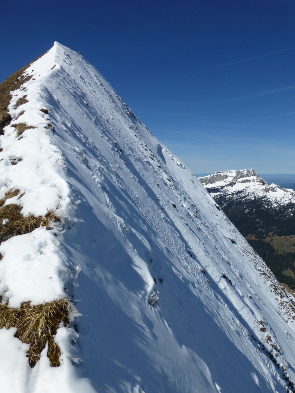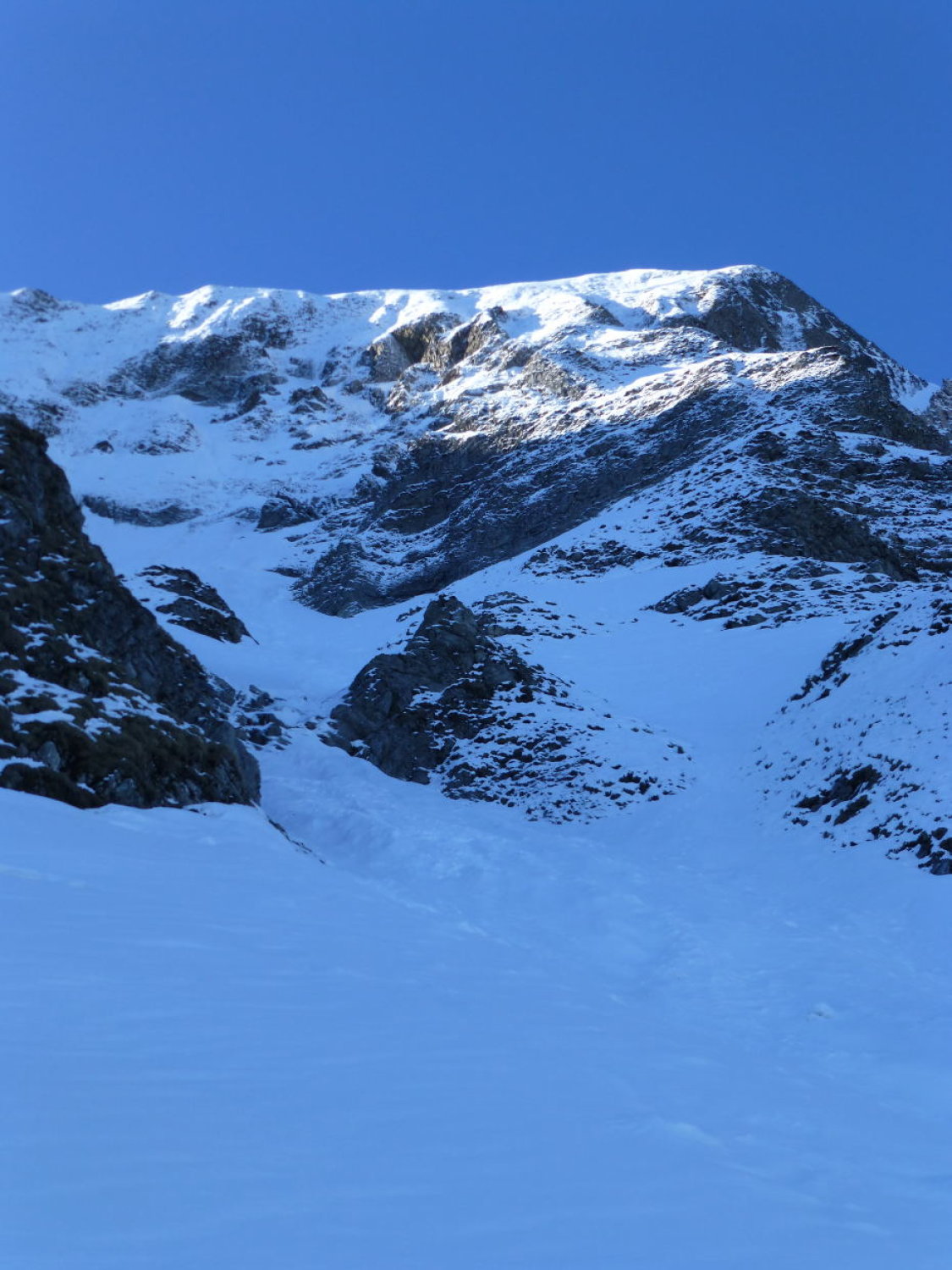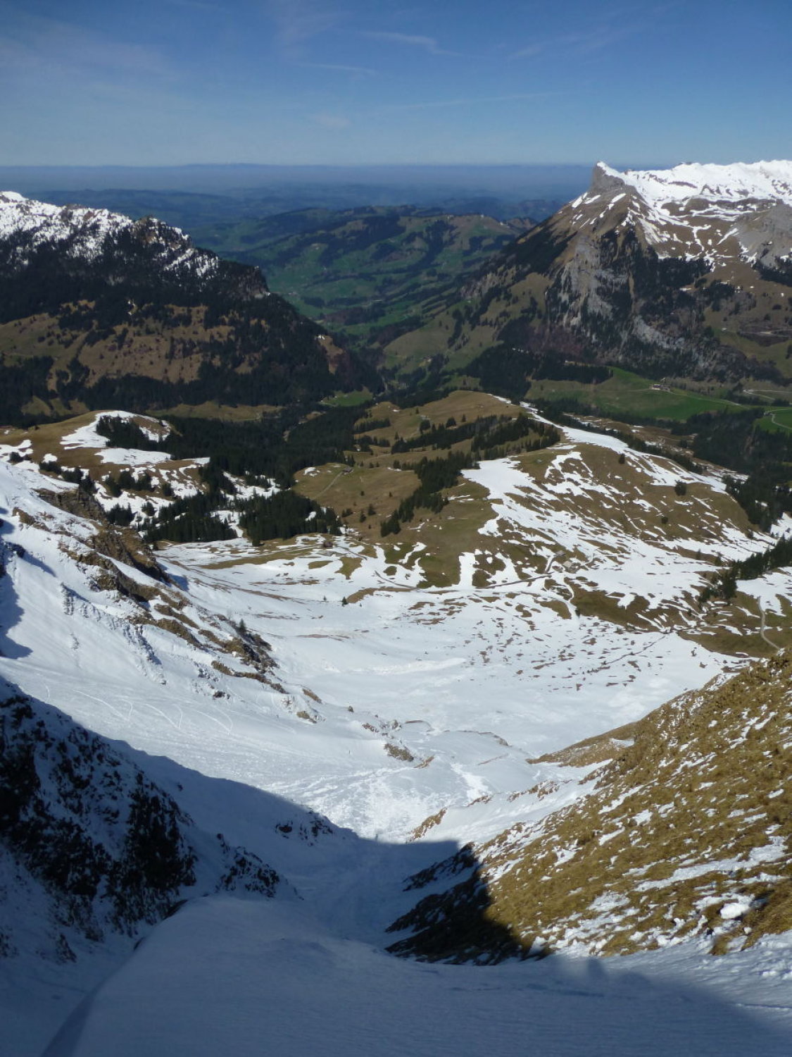 Nach klarer Nacht morgens kalt, dann bei leichter Bise sonnig und mild. Schnee ab 1300m: bis 1700m zuerst gefroren, dann Sulz, in der N-Flanke z.T. 5-20cm verblasener Pulver auf durchfeuchteter Unterlage (guter Trittschnee, für Abfahrt aber schlechter Grip), NW-Couloir oben hart und schlechter Grip (erste 60Hm abgerutscht), dann 5-20cm Pulver auf durchfeuchteter Unterlage und angesulzt. Mehrere ältere überschneite Nassschneelawinen v.a. in der unteren N-Flanke.