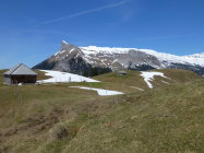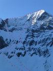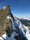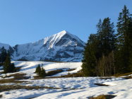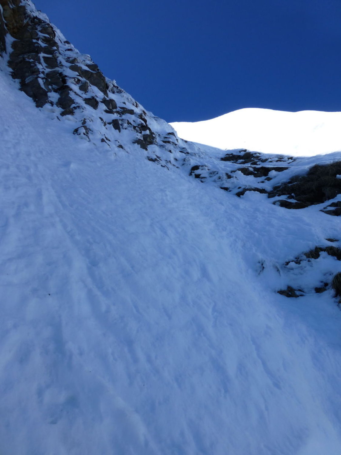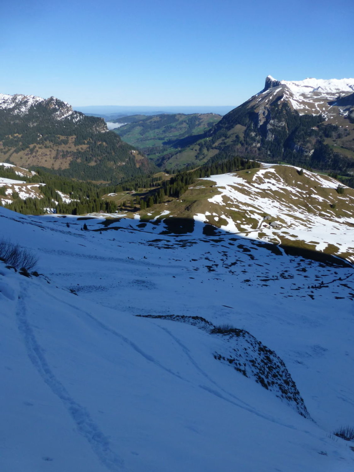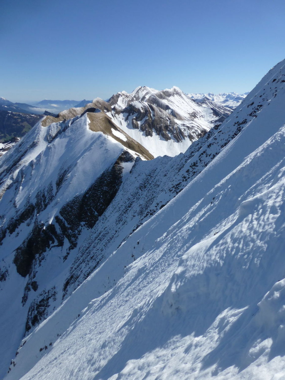 Nach klarer Nacht morgens kalt, dann bei leichter Bise sonnig und mild. Schnee ab 1300m: bis 1700m zuerst gefroren, dann Sulz, in der N-Flanke z.T. 5-20cm verblasener Pulver auf durchfeuchteter Unterlage (guter Trittschnee, für Abfahrt aber schlechter Grip), NW-Couloir oben hart und schlechter Grip (erste 60Hm abgerutscht), dann 5-20cm Pulver auf durchfeuchteter Unterlage und angesulzt. Mehrere ältere überschneite Nassschneelawinen v.a. in der unteren N-Flanke.
