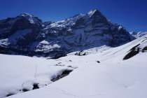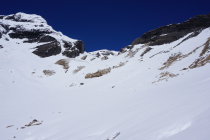 Bis zu Pass beim Aufstieg gefrorene Schneeobefläche, in der Abfahrt Sulzschnee, vom Pass bis zum Gipfel Bruchharst und nur wenig Schnee in den Steinen (Abfahrt wie durch ein Minenfeld), im Schatte des Schwarzhornes noch Pulverschnee.