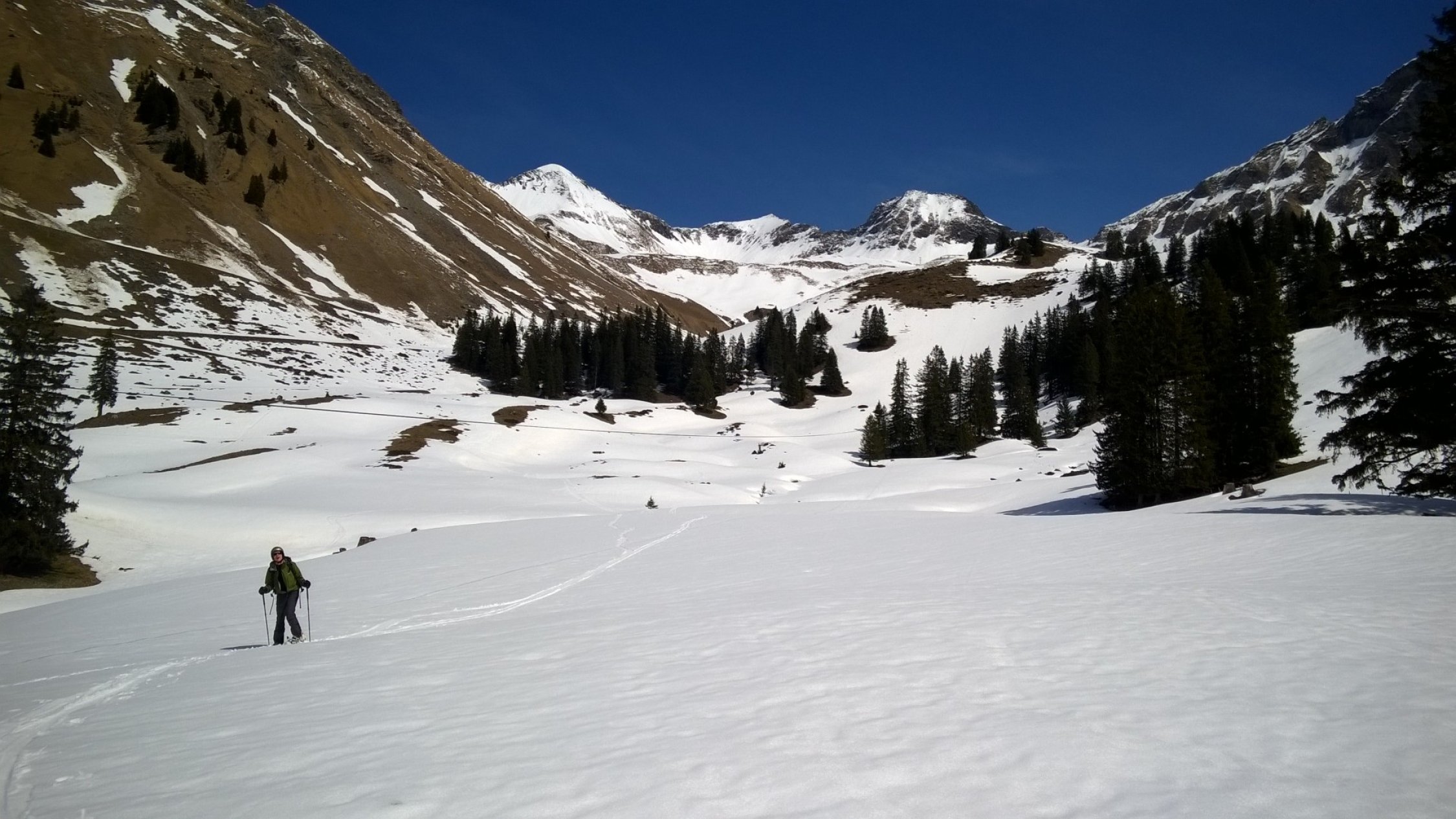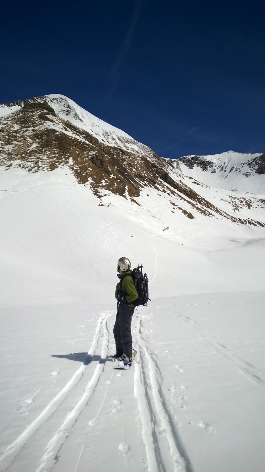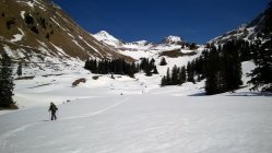 Schönen Sulz angetroffen. Am Mittag sollte man vom Gipfel abfahren. Von Fildrich Käserei kann man noch bis zur Höhe von 1440 m ü.M. auf dem privaten Sträßchen hoch fahren. Von dort muss man die Skier nur noch ein paar Minuten tragen, bis die geschlossene Schneedecke beginnt. Den Bach bei Punkt 1664 überschreiten. Zwischen Oberberg und dem Obertal hat es einige kurze apere Stellen.