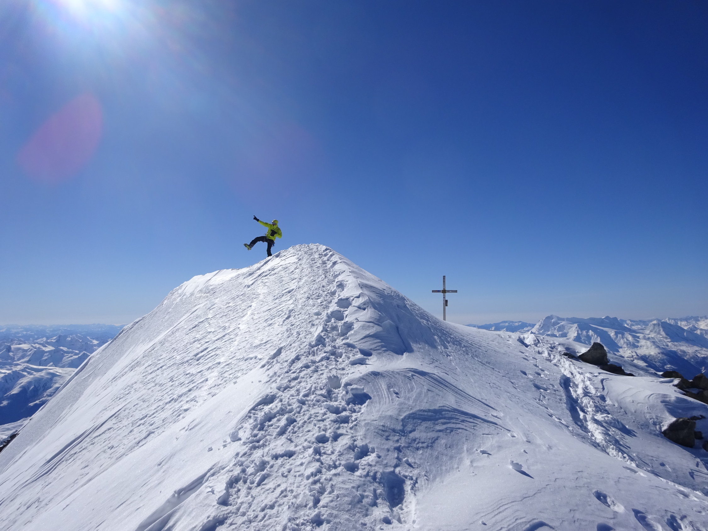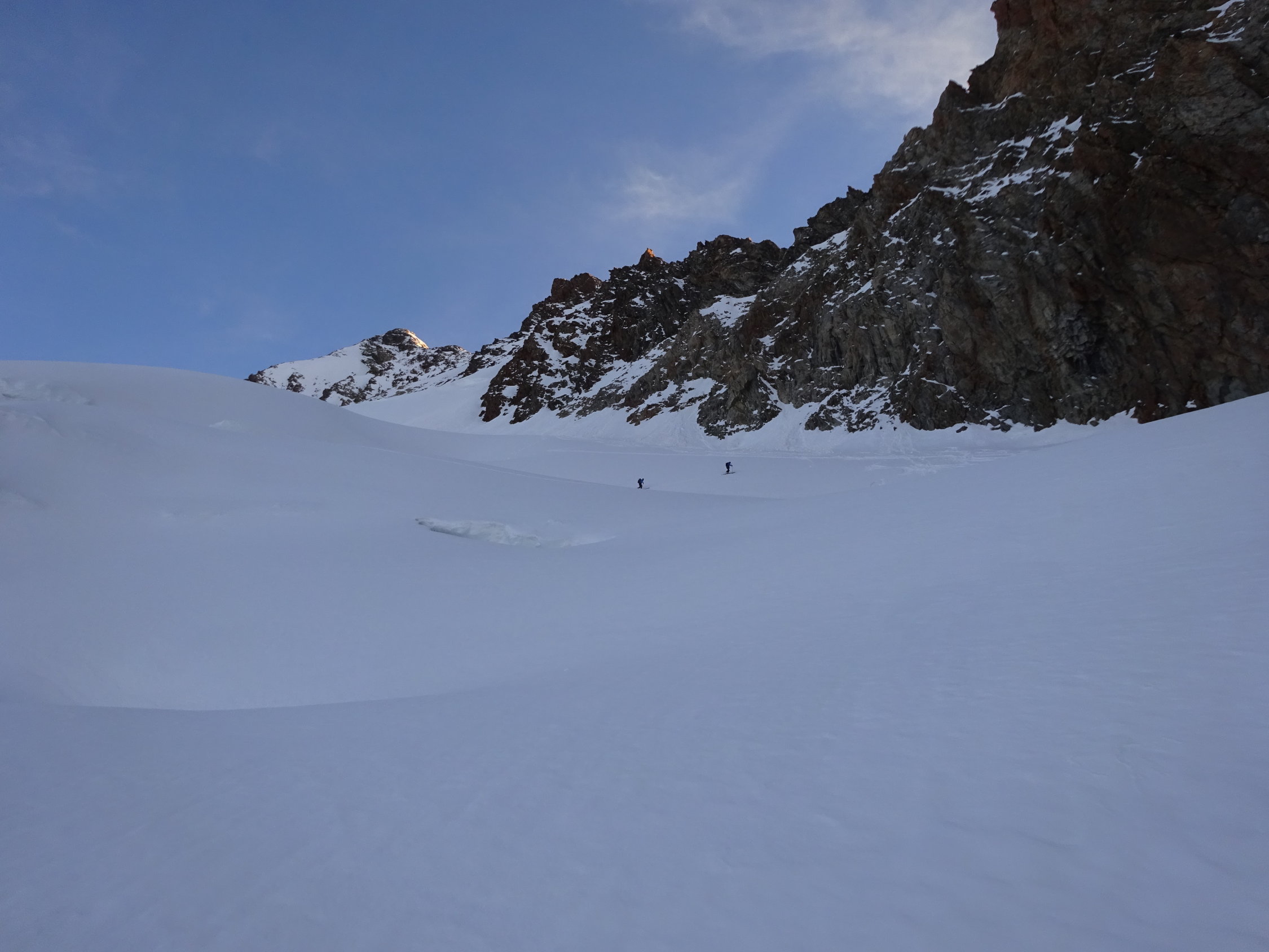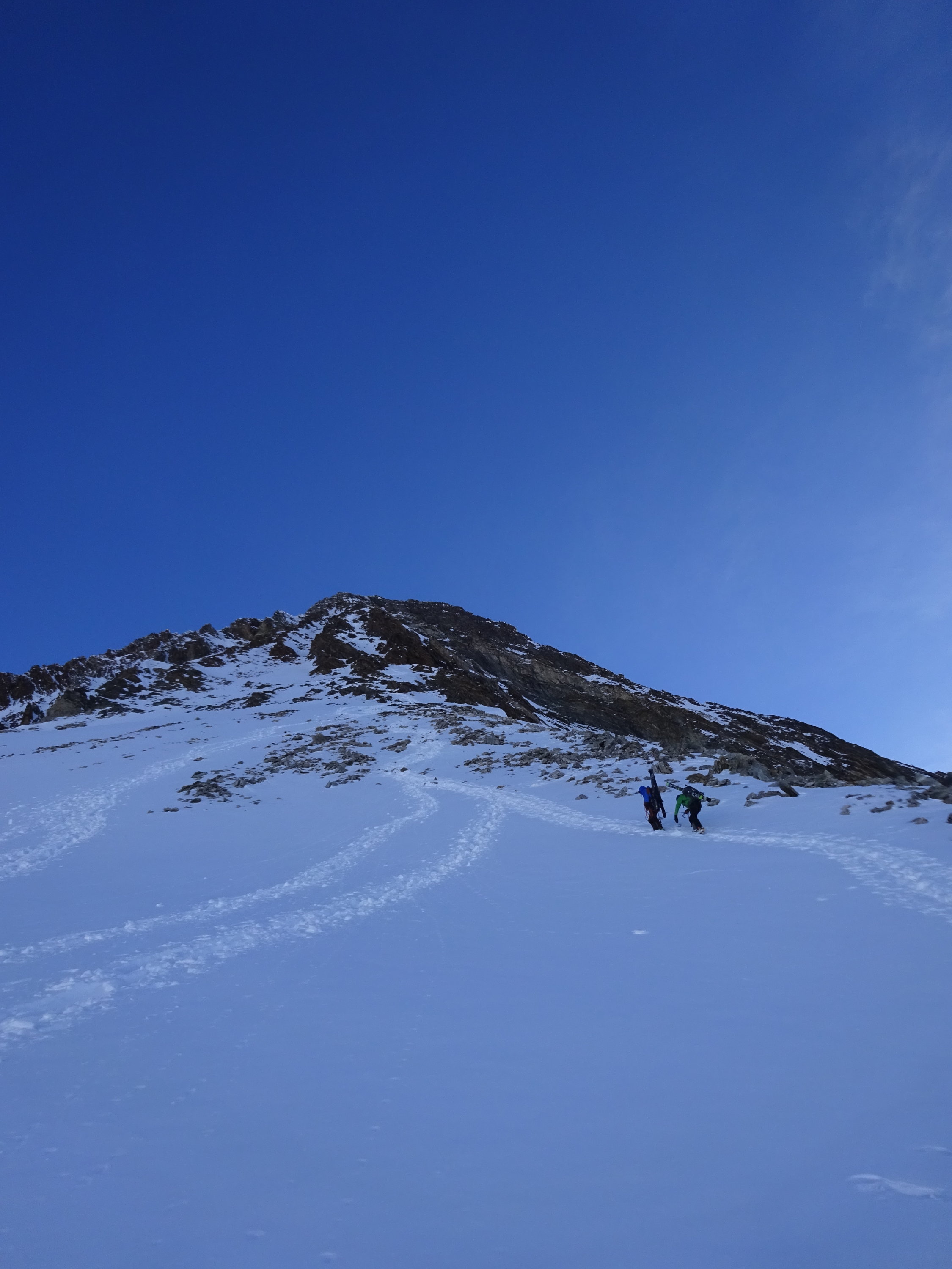 Top Verhältnisse beim Aufstieg über die SW-Rippe. Praktisch alles kann in kompaktem Trittschnee aufgestiegen werden.