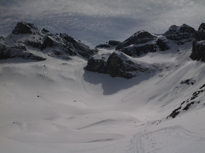 Ab dem Boden hinter der Schonegg neu gespurt, zuerst auf zugewehter Spur bis zum letzten Boden unter dem Felsriegel, ab dort komplett neu gespurt. Das Steilstück beim Felsriegel war ein ziemliches Gewühle, die Seile sind eingeschneit. Dafür in der Abfahrt problemlos mit Ski machbar.