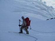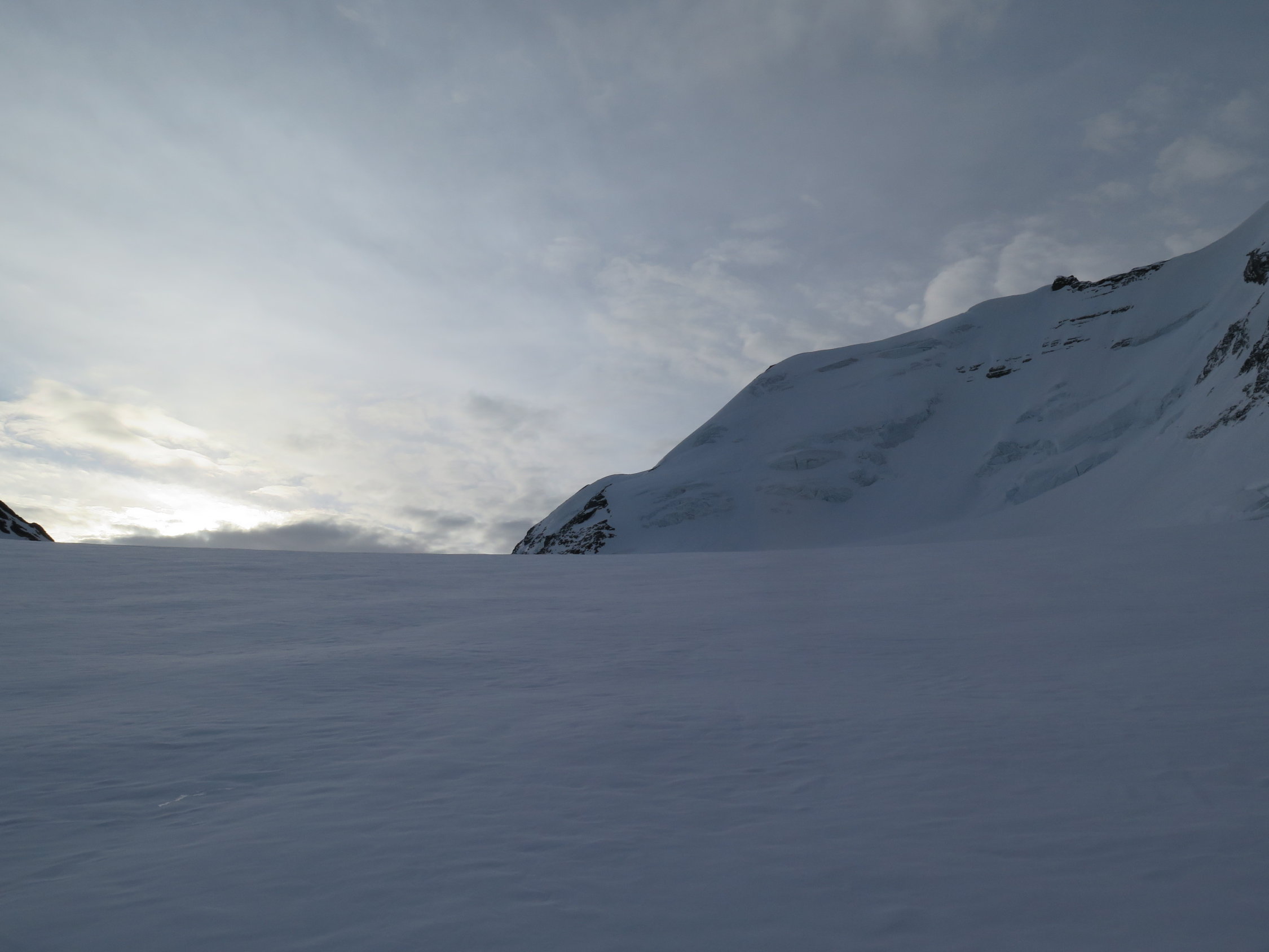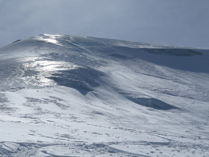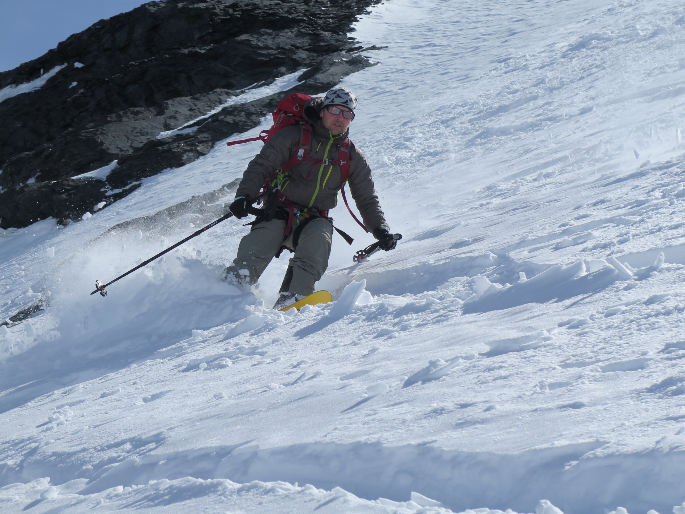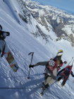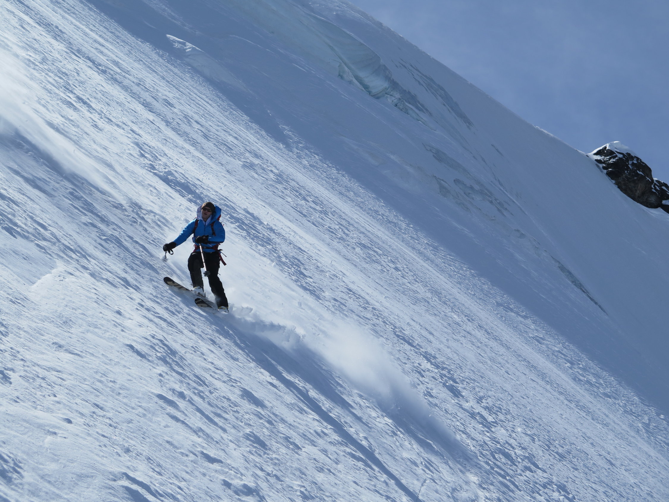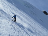 Auf ca. 3500m haben wir die Skier aufgebunden und sind mit Steigeisen und Pickel bis auf den Gipfel. Achtung zugeschneite Querspalte kurz unterhalb des Gipfels.