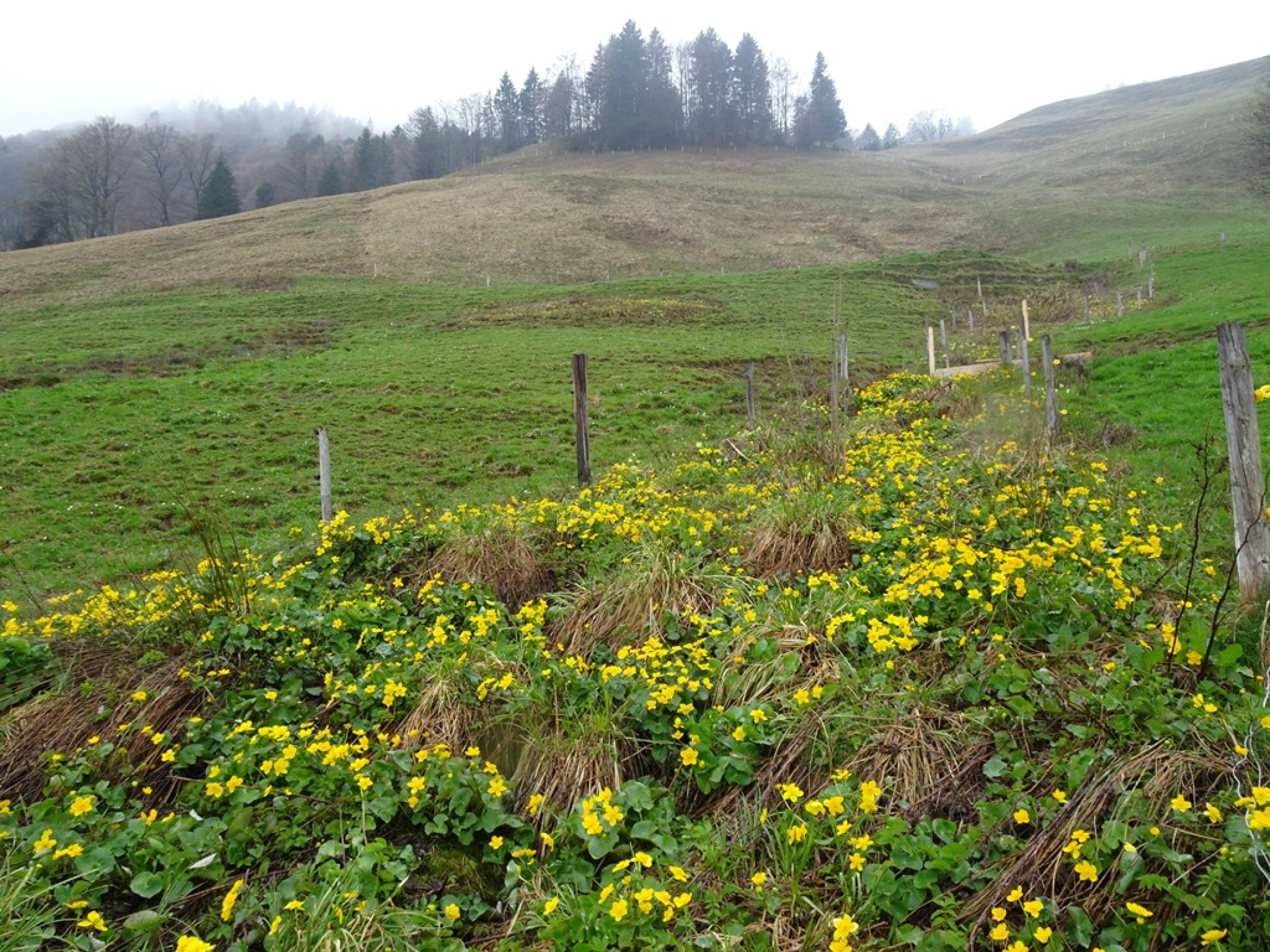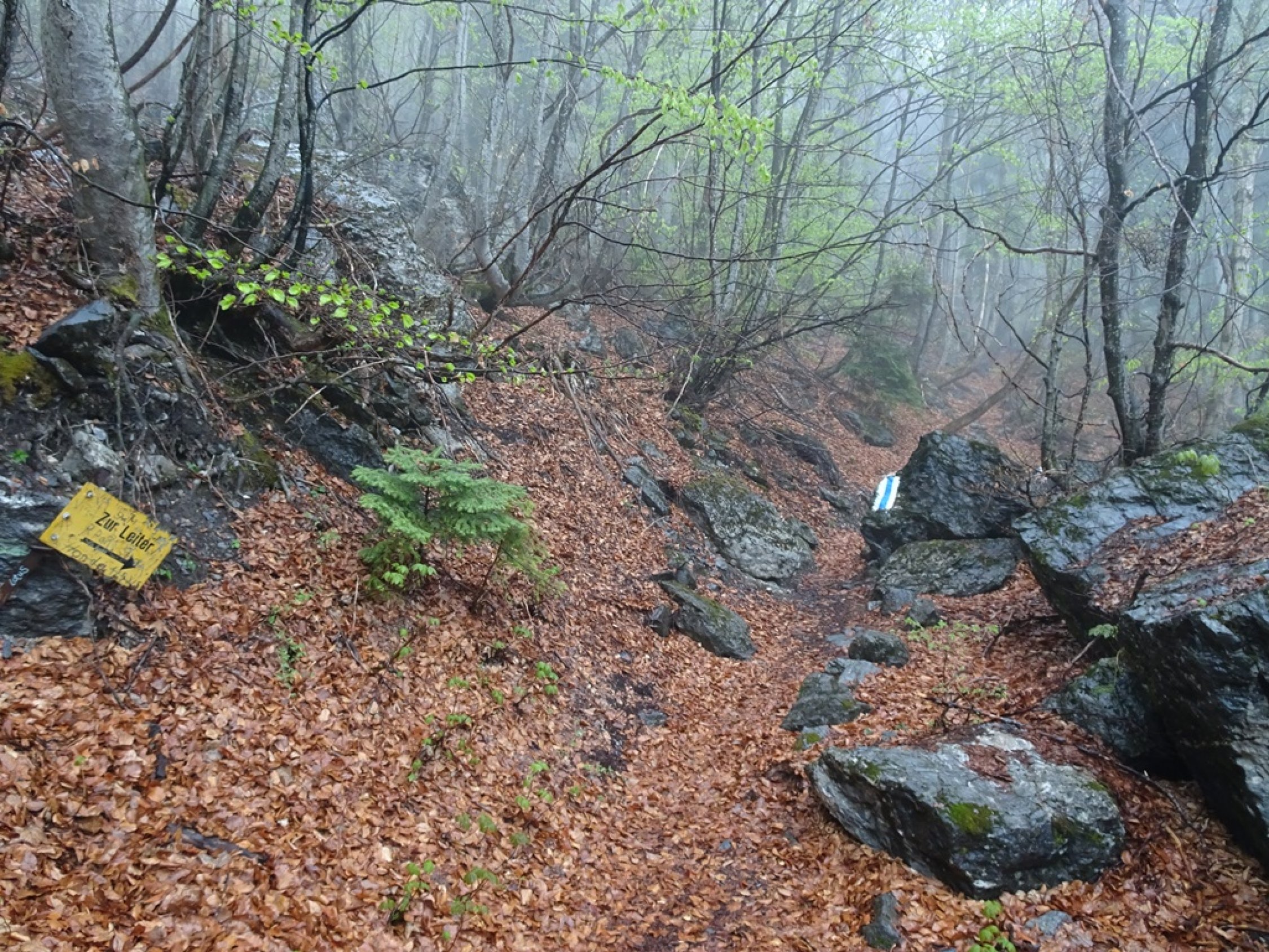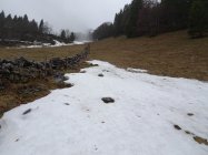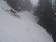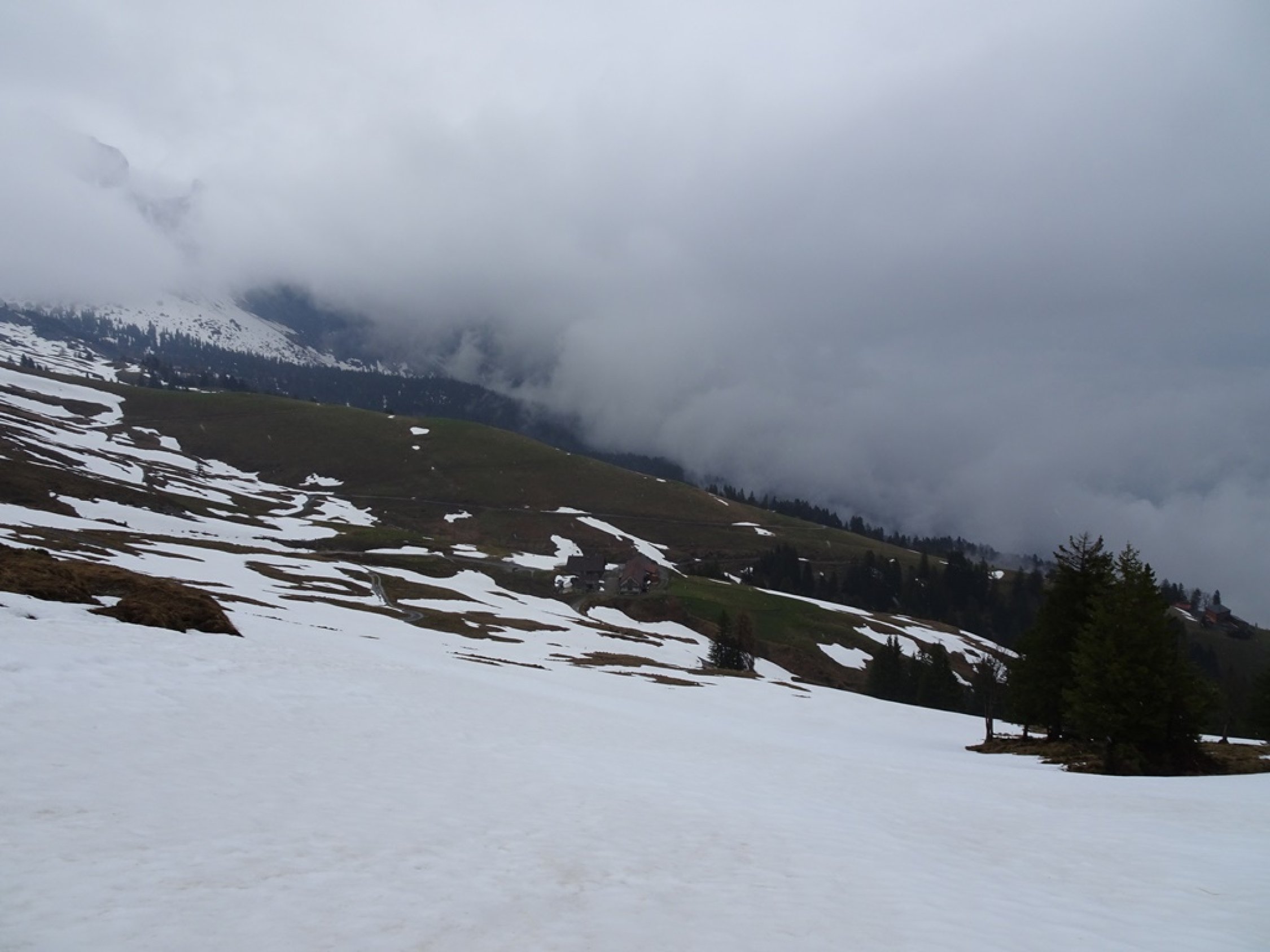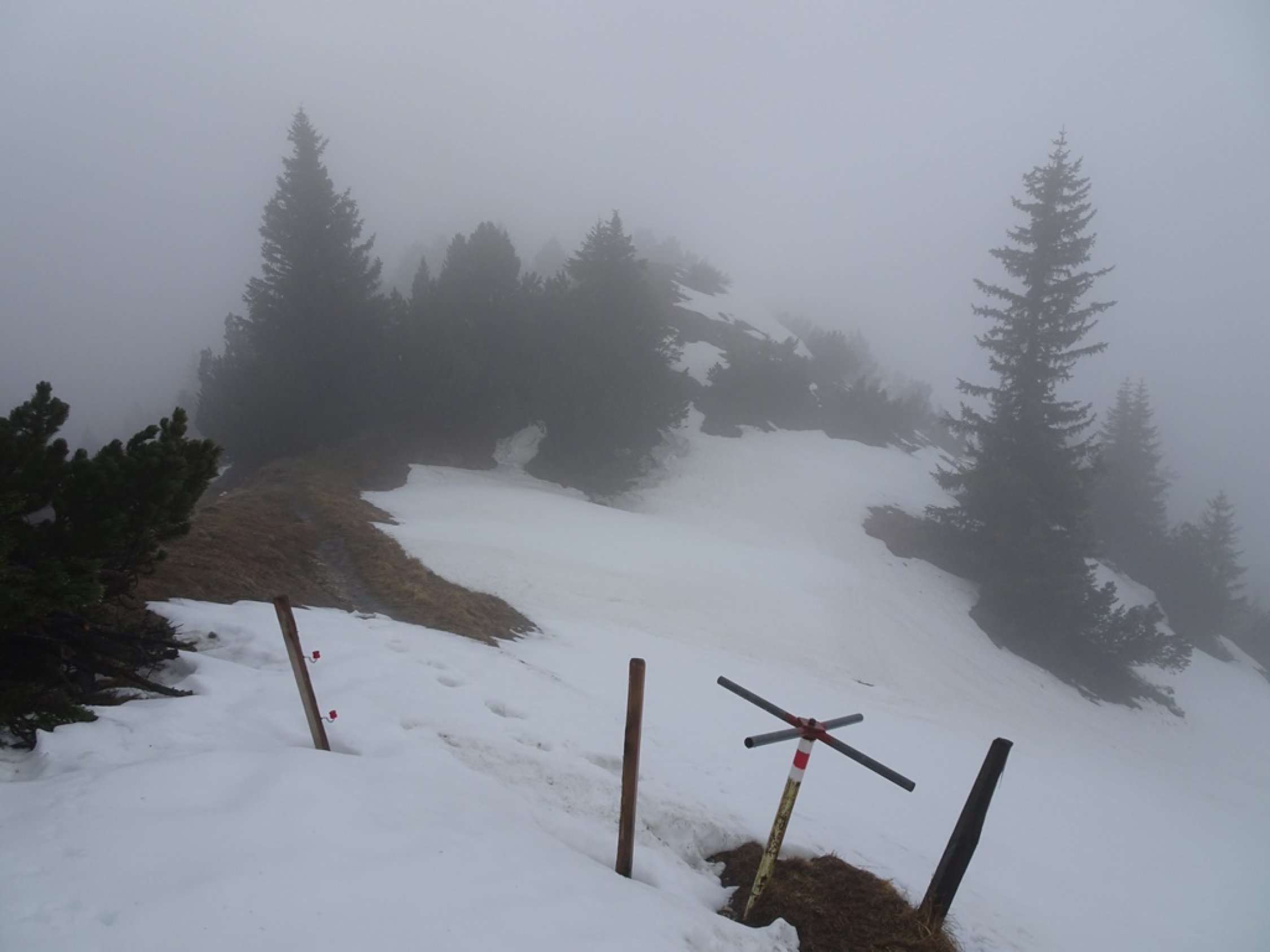Oberhalb 1‘500 Meter liegt noch Schnee, der mehr oder minder tragend ist. Zwischen den Lawinenverbauungen hatte es keine Spuren, (auch war der eigentliche Weg nicht zu sehen), so dass ich mich zwischen Föhren und anderem Geäst durchgekämpft habe. Abstieg dann Richtung Lanaberg war bis zu den Rieter Hütten gut gespurt, danach hat es kaum mehr Schnee.