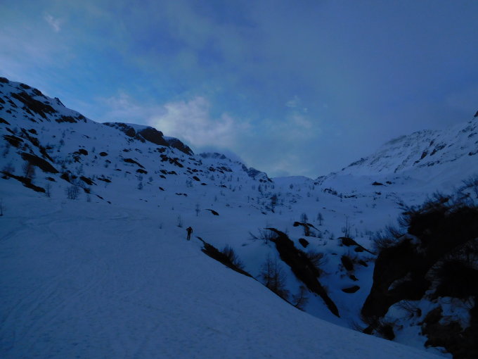 Schon Wettermässig für Skitouren das zweite bittere Wochenende infolge, war das Tessin unsere letzte Hoffnung, Start der Tour am 6. 45 Uhr in All'Aqua, bei einer Temeratur von -1 Grad, schon nach der Brücke konnten die Skis montiert werden, es ging steil auf einer harten Unterlage durch den Lärchenwald hinauf, in das Val Cavagnolo wo die Verhältnisse sehr gut waren, Firn vom bessten, aber schon bald war klar mit einer grossen sonnigen Tour wird es heute nichts, leichter Schneefall und Nebelschwaden kamen auf, der Nordföhn bekam nicht die Oberhand, ab der Mulde 2361 m dann einige cm Neuschnee auf harter Unterlage, nach einigen Spitzkehren konnte der Gipfel mit Ski bestiegen werden, die Harscheisen blieben heute im Rucksack.