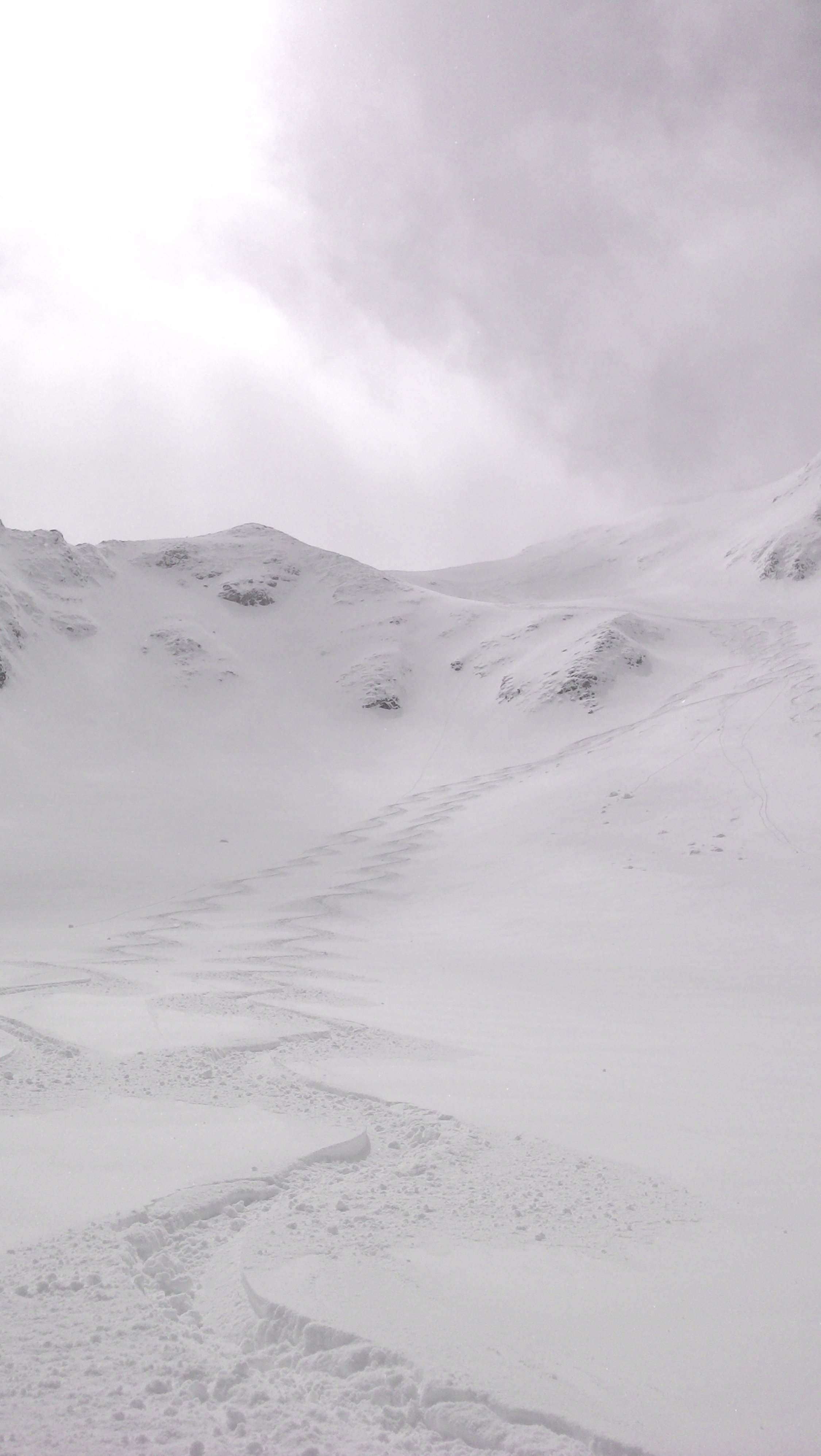 Ca. 35 cm Neuschnee, manchmal ein bischen verblasen, aber schön pulverig. Letzten 20m vor dem Morgetepass ziemlich hart, ohne Skis geht's aber ganz gut. Nordflanke perfekt zu fahren.