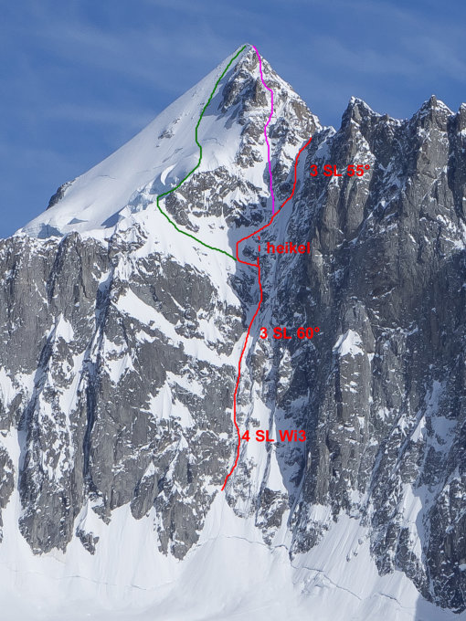 Es gibt diverse Variante das Charles-Couturier zu klettern. Wir haben ganz unten den linken Eisstrang genommen. In einigen Führern als “Gully Variation” beschrieben. Zuoberst sind wir auf den Sattel rausgestiegen, was die üblichste Variante ist. j_sp hat in seinem Blog noch weitere Varianten beschrieben. Siehe Link weiter unten.